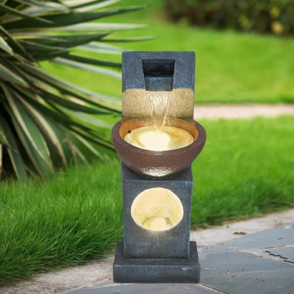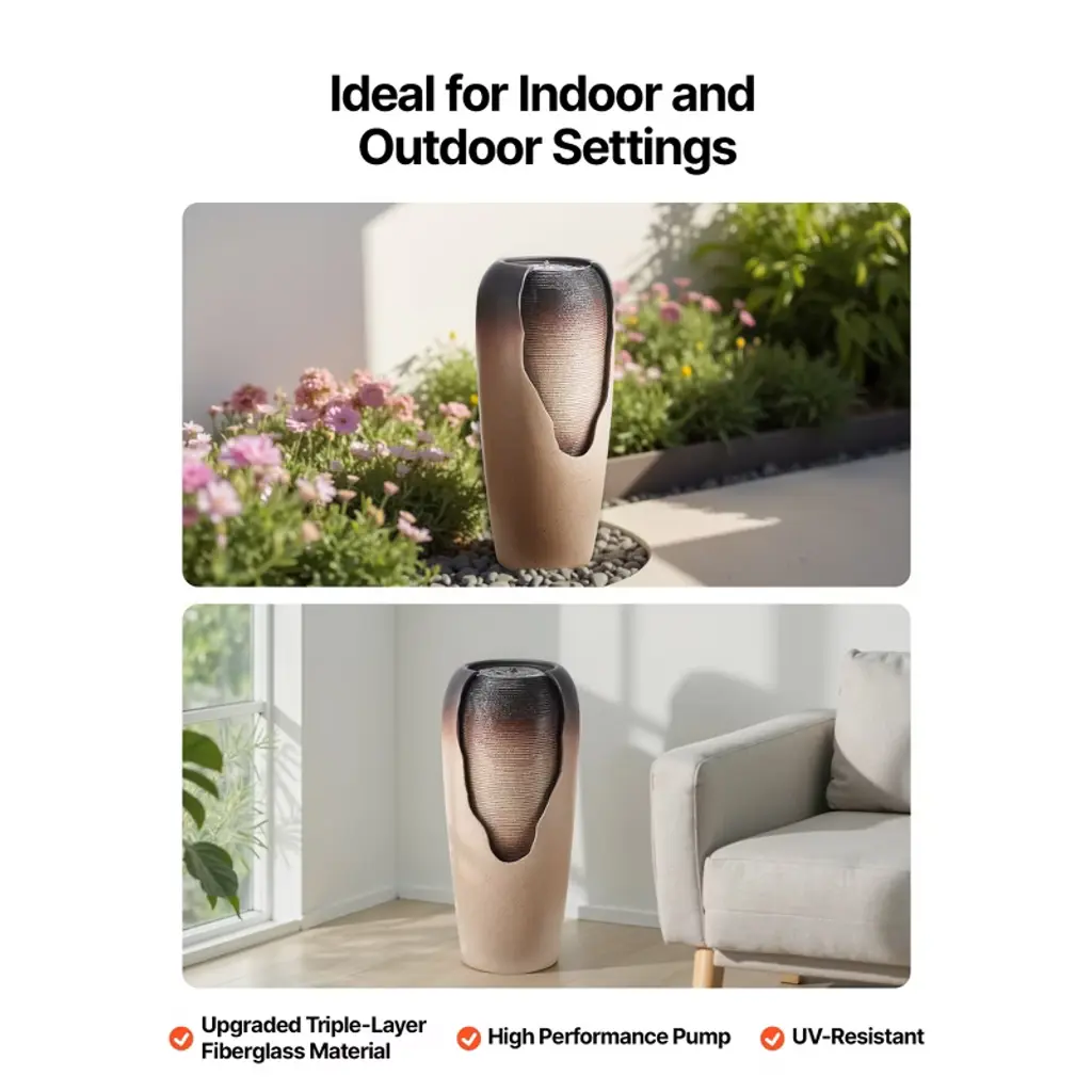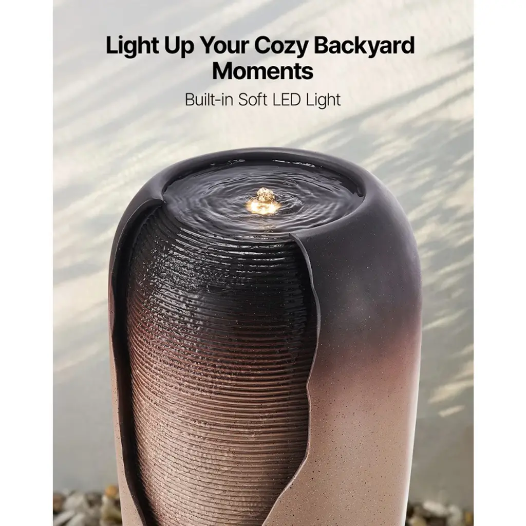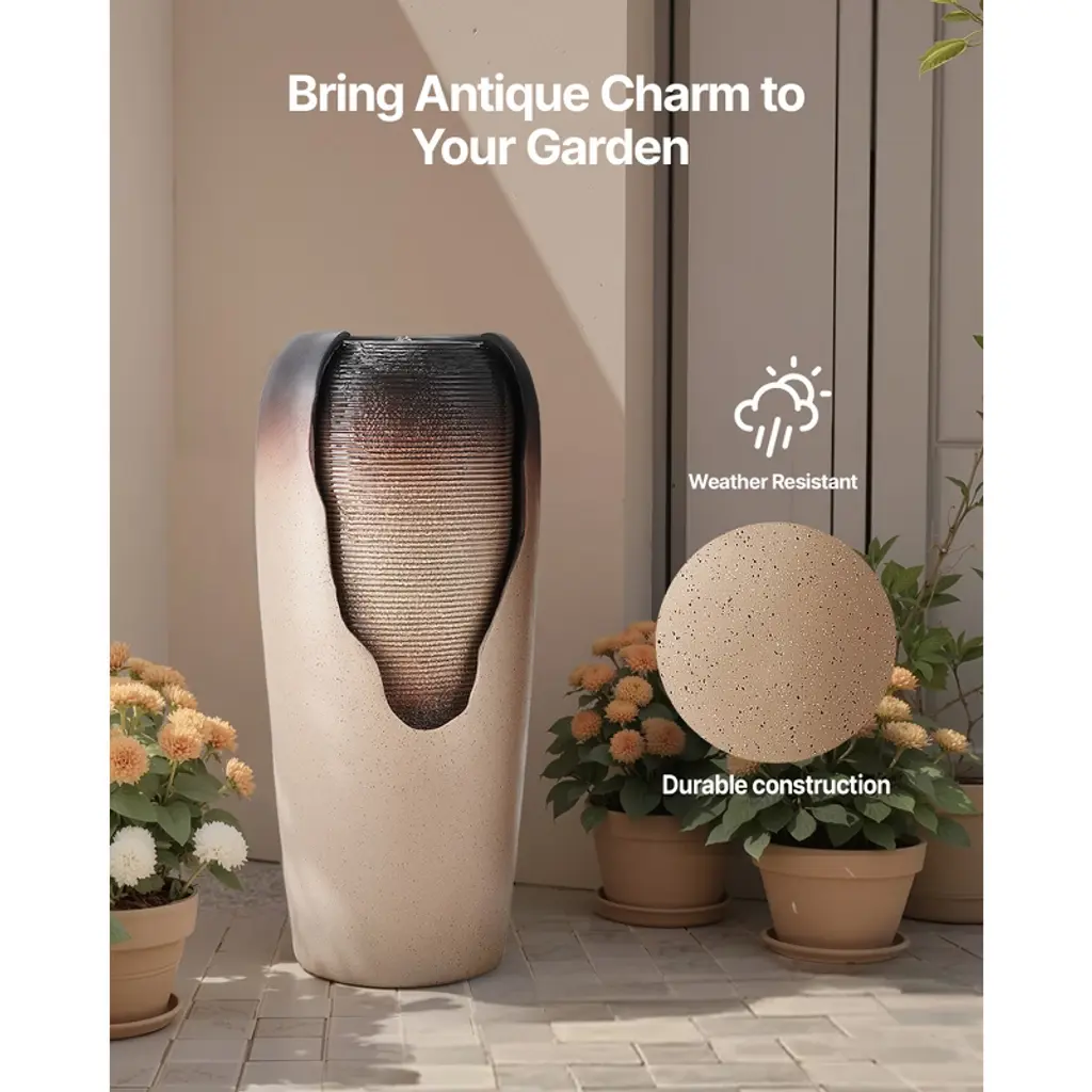 Feature: Antique Style: The coffee-colored crackled glaze jar design of this outdoor water fountain attracts butterflies and birds, adding life to your garden and enhancing the overall charm of your outdoor space Visual & Practical Design: The reflective glaze surface of this yard fountain increases its decorative appeal, while the flowing water design offers a relaxing experience, combining both beauty and functionality Durable Materials: Made from weather-resistant resin and triple-layer fiberglass, this water fountain is built to withstand wind, sunlight, and extreme temperatures. It remains colorfast and crack-free, making it ideal for gardens, yards, and patios Lights: The yard water fountain features soft lights that create a dreamy effect at night, enhancing your garden or indoor space. It includes dual power supplies for the pump and lights and a 6 ft power cord for flexible use Easy Assembly: This waterfall fountain includes a detailed installation manual, making it easy for homeowners to assemble and set up, allowing you to enjoy your fountain with minimal effort Package Content 1 x Main Unit 1 x Light Transformer 1 x Water Pump 1 x User Manual
