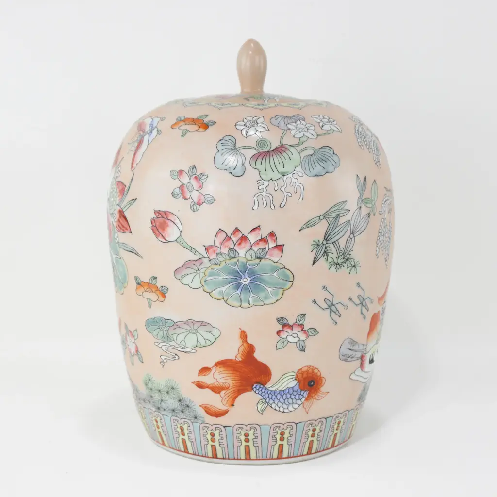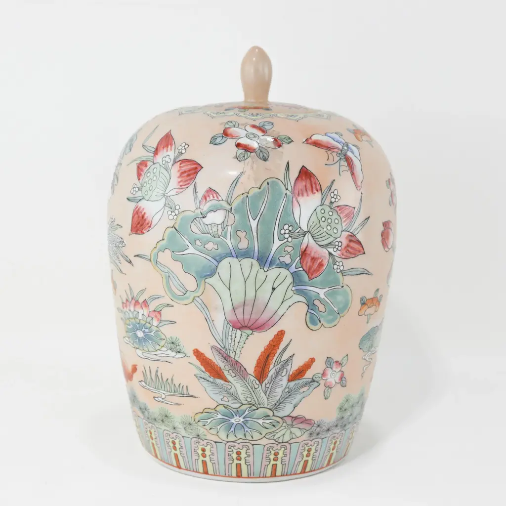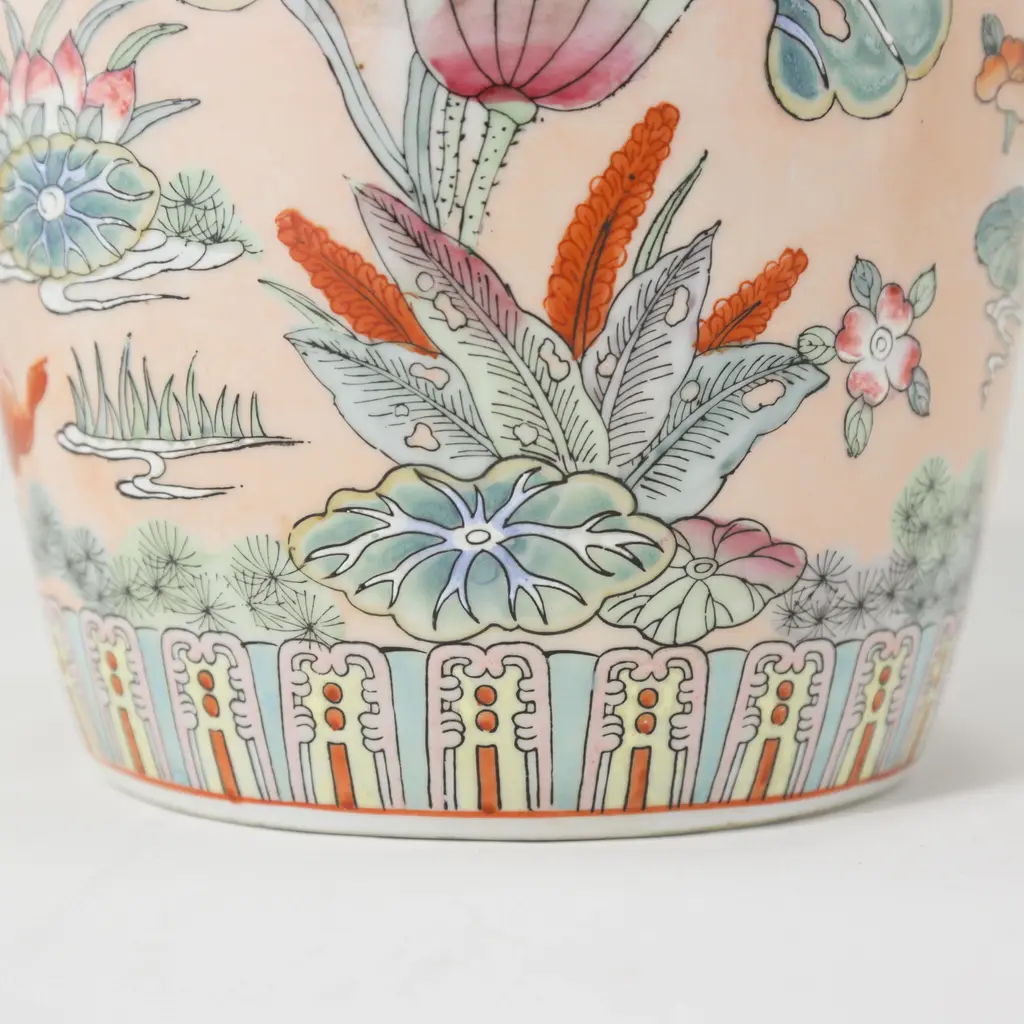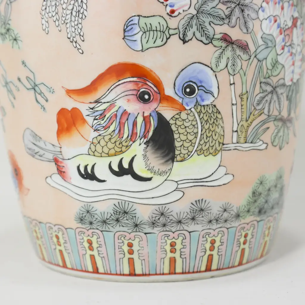 This exquisite hand-painted porcelain ginger jar showcases a beautifully detailed Mandarin duck motif, symbolizing love and harmony, surrounded by delicate floral and foliage patterns. The warm peach-toned background enhances the intricate artistry, making it a standout piece for collectors and home decorators alike. With its traditional lidded design, this jar blends vintage Chinese craftsmanship with timeless elegance, ideal for display on tabletops or shelves.
