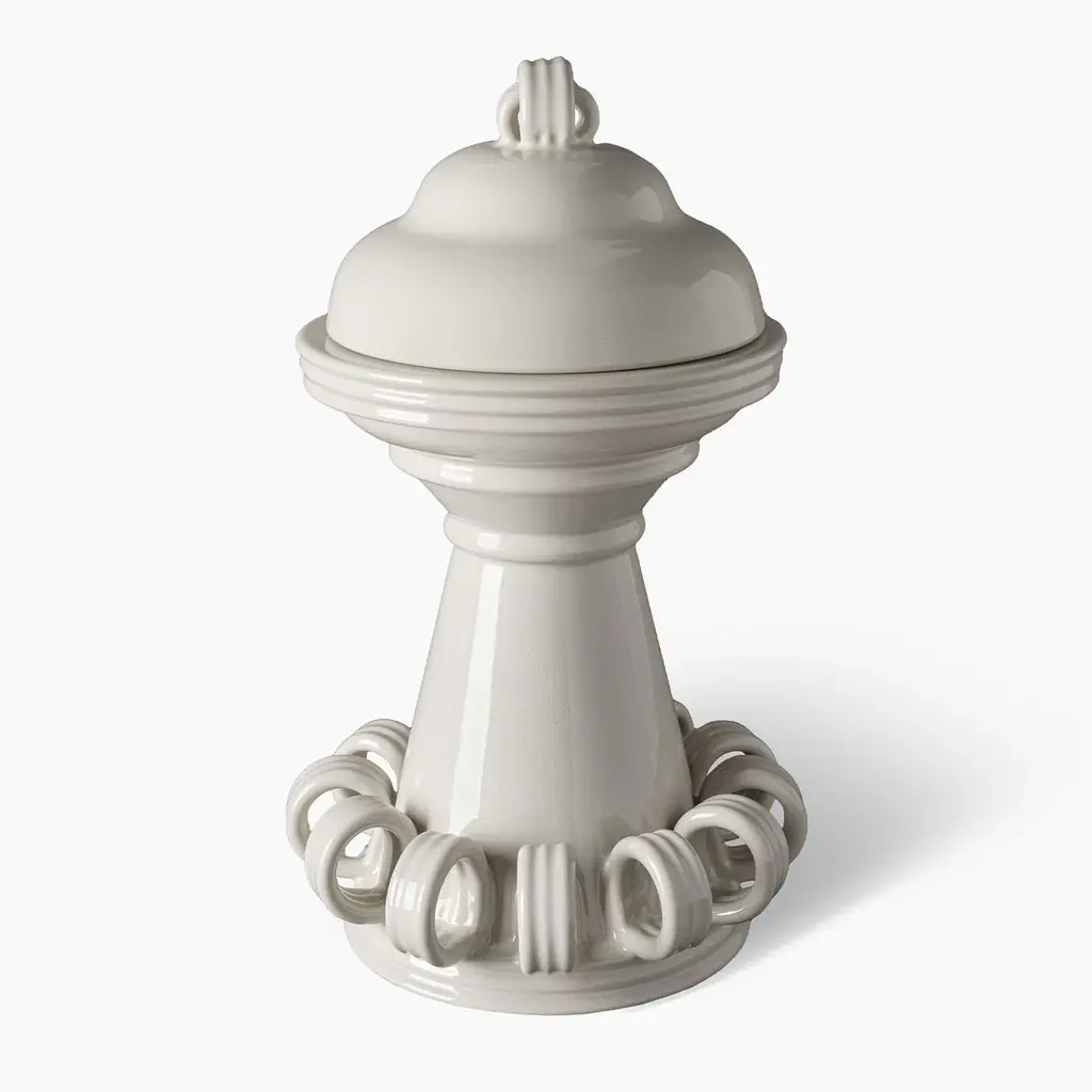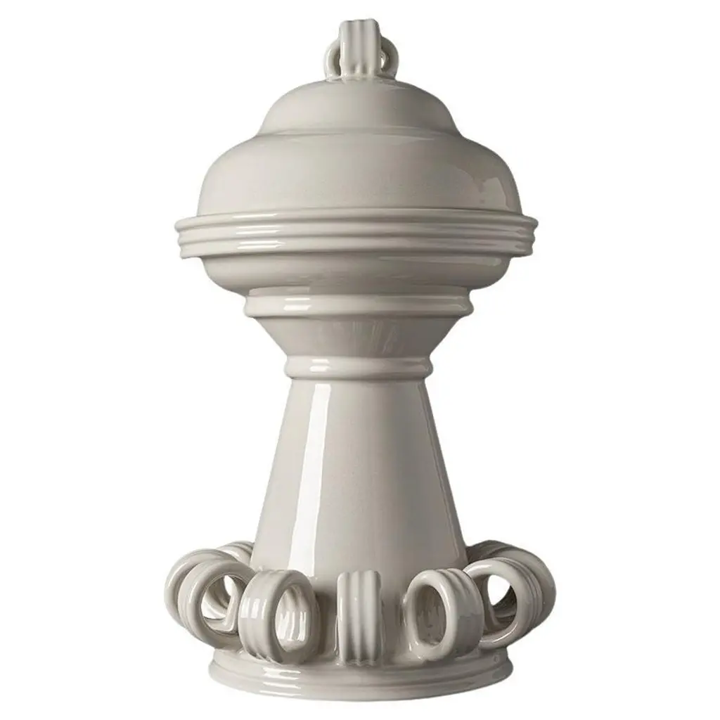 An intriguing interplay of volumes and proportions, made harmonious by the choice of a delicate and bright white glaze, defines the superb aesthetic of this cookie jar. Crafted of fine ceramic, it is distinguished by fancy details with a grooved texture borrowed from designs belonging to Bitossi Historical Archive. A double shelf conceals extra sweets under the voluminous lid.