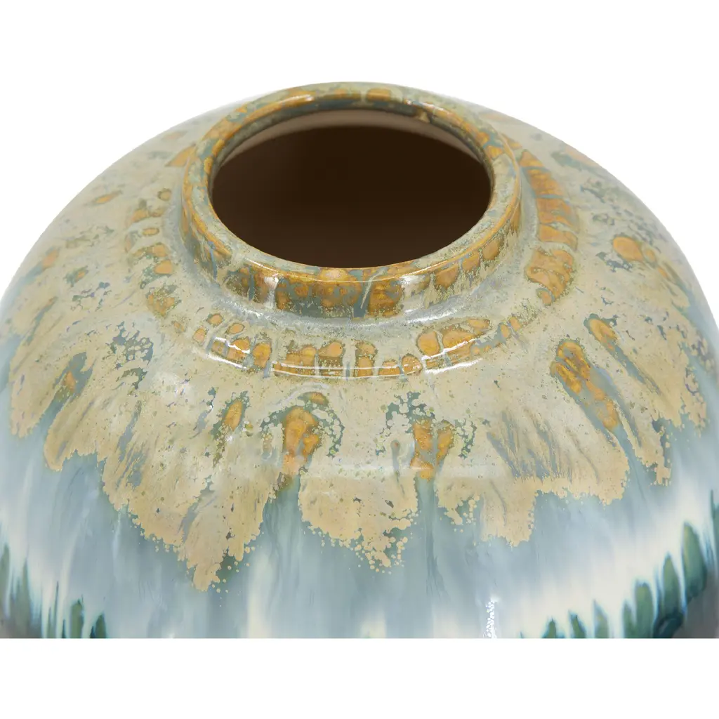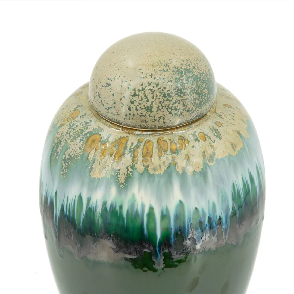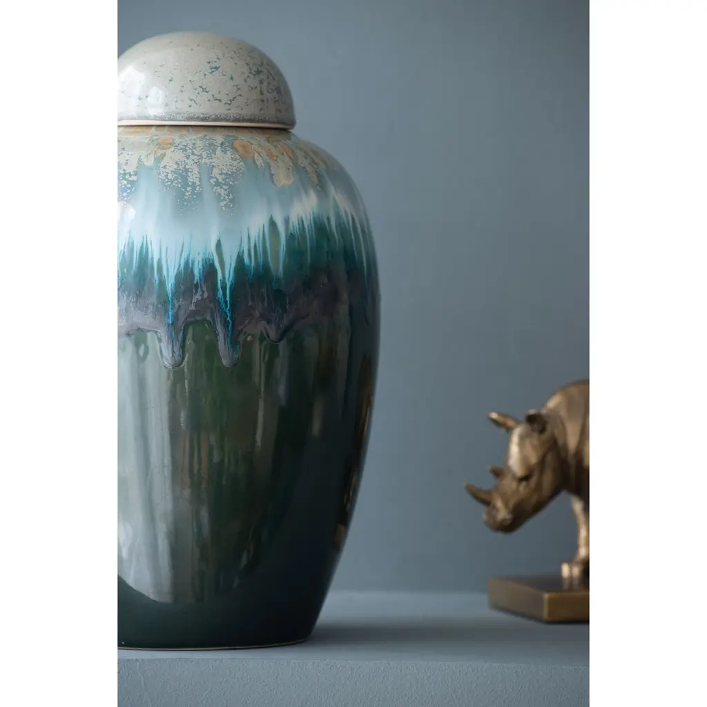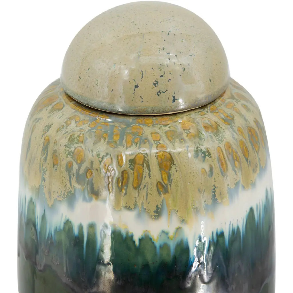 Spacious and stylish, the virga set of two round, stoneware jars is an eye-catching way to decorate a home. The ceramic pair features a gorgeous reactive glazed finish transitioning from earth tones to black with hints of blue and green.