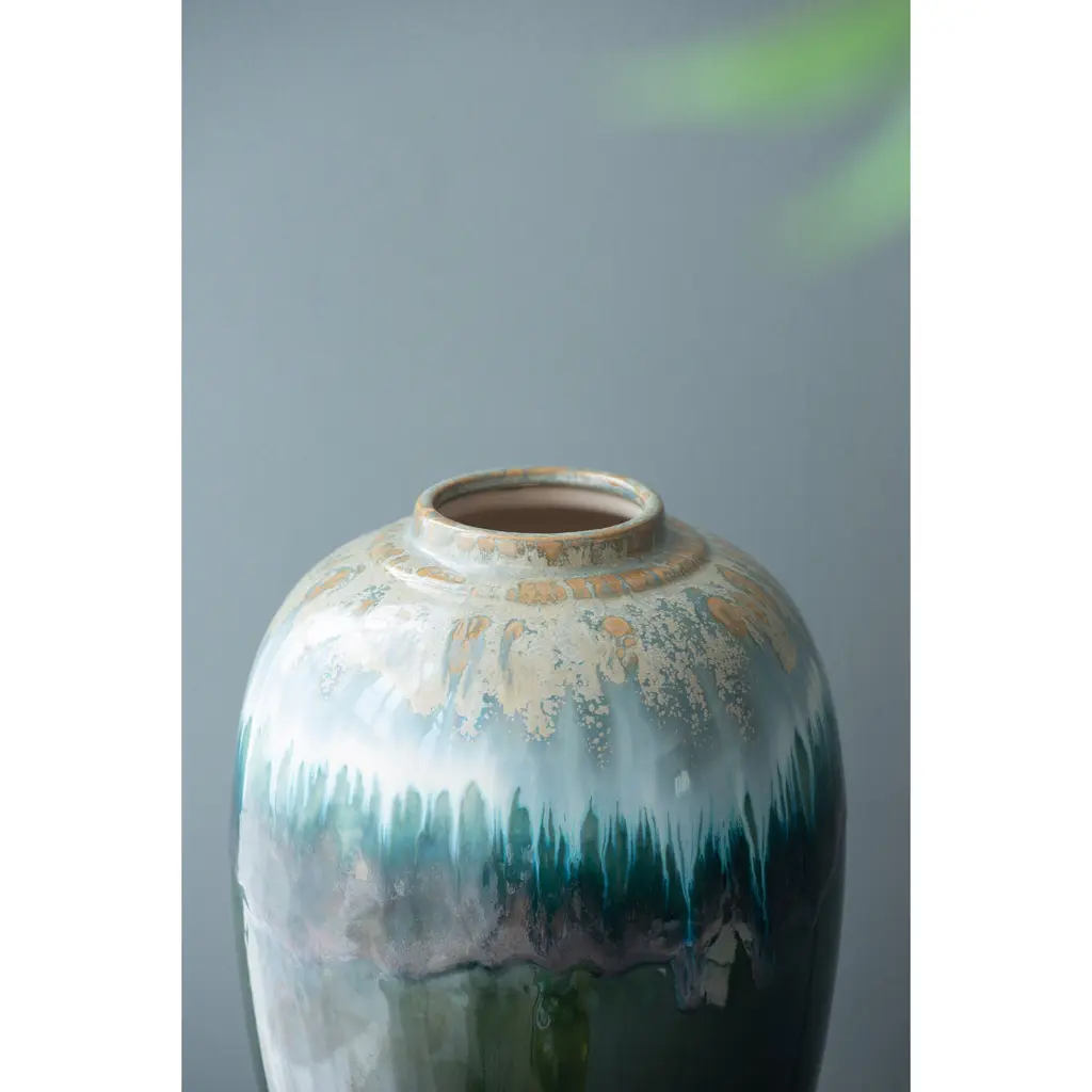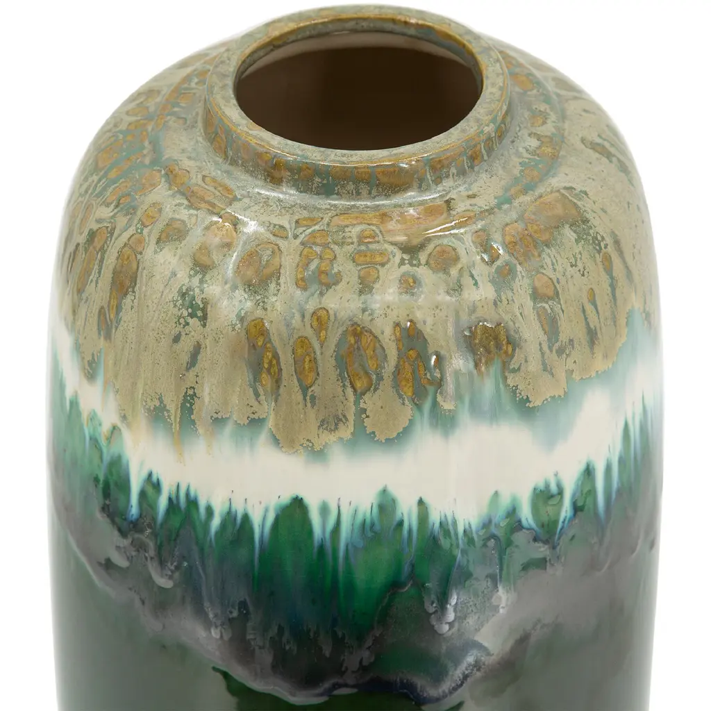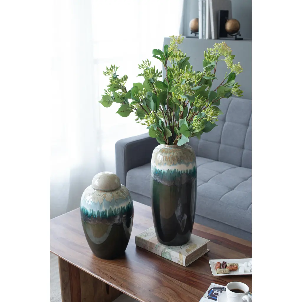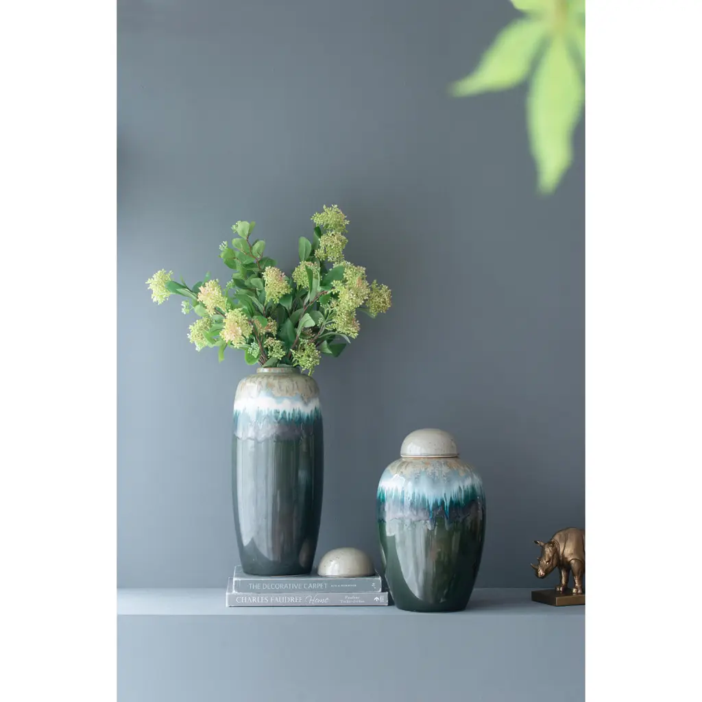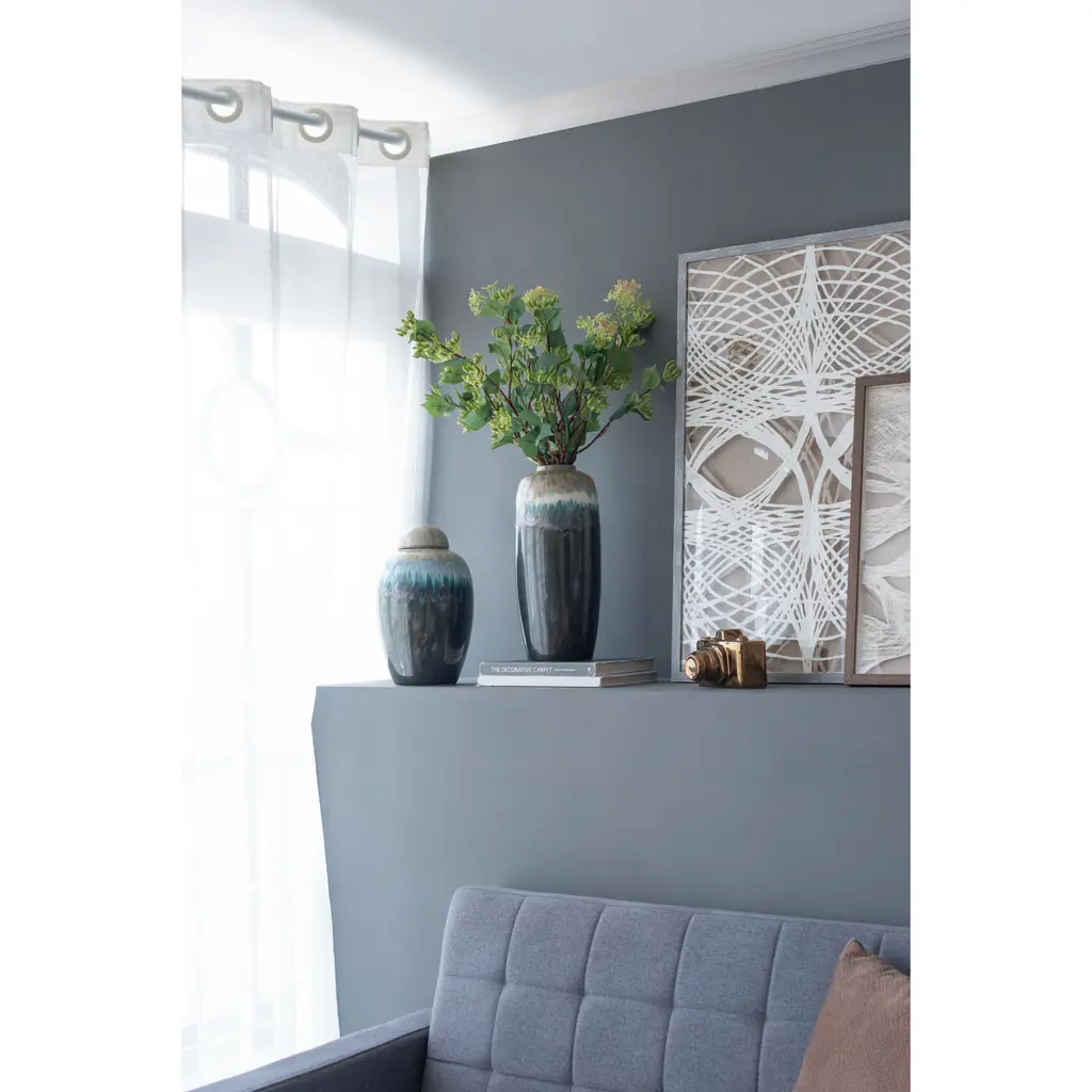 Spacious and stylish, the virga set of two round, stoneware jars is an eye-catching way to decorate a home. The ceramic pair features a gorgeous reactive glazed finish transitioning from earth tones to black with hints of blue and green.