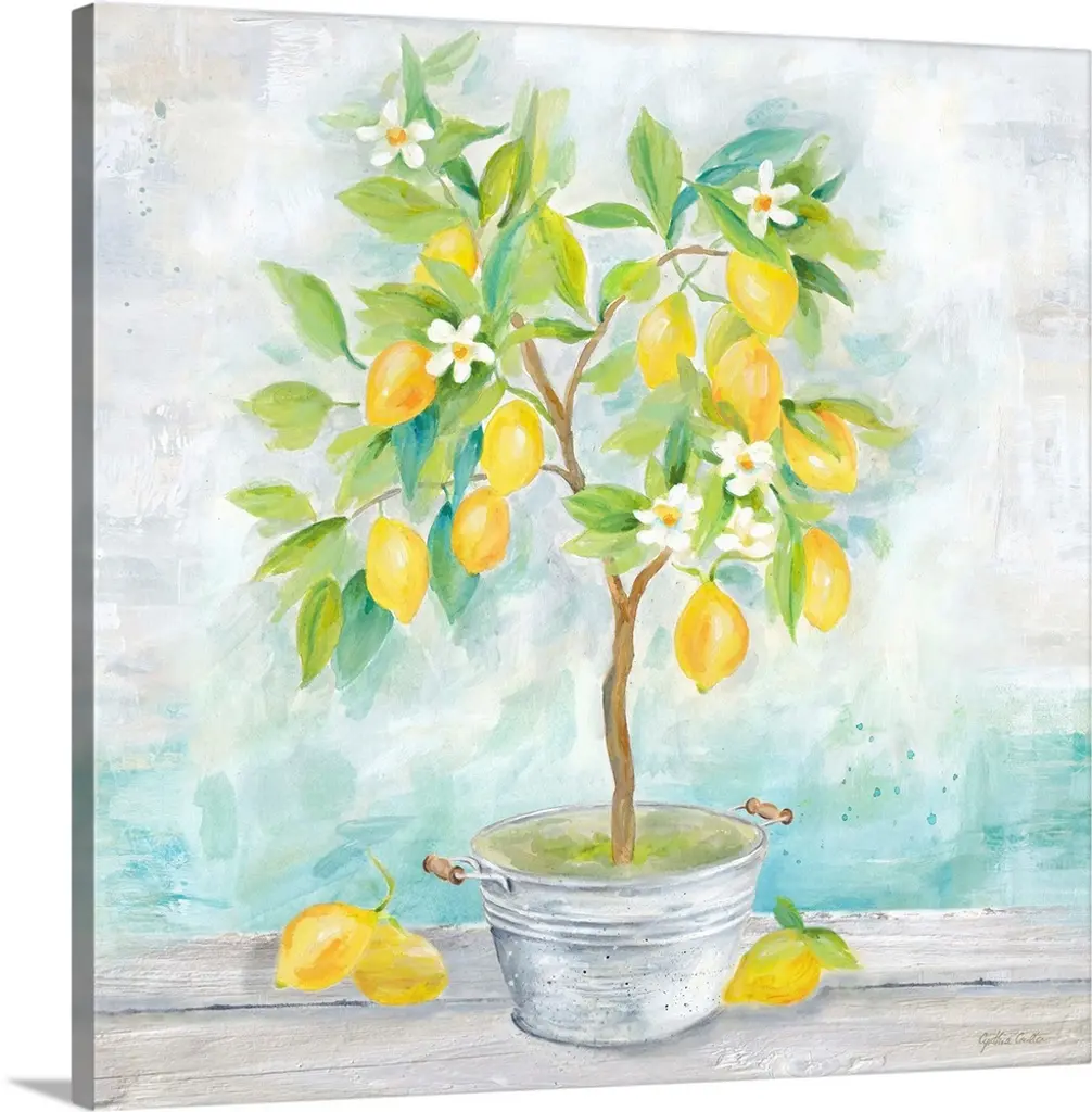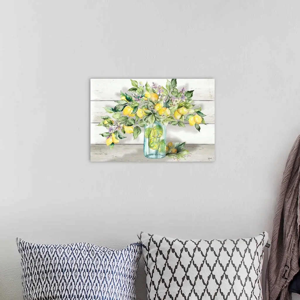 A rustic, country style image of a branch laden with lemons and lemon blossoms, in front of a white shiplap background. This simple still life would be a sweet addition to a sunny kitchen or sunroom.