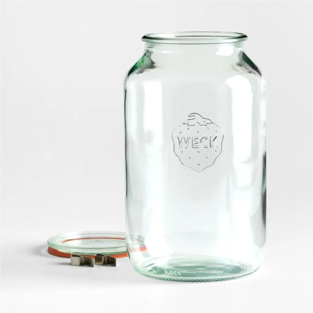 Indispensable for canning, this classic jar is equally adept at storing staples in the pantry, making pickles or storing cold brew. The barrel-shaped clear glass container is generously sized, and the glass lid easily secures with a rubber ring and two metal clamps for a tight seal.