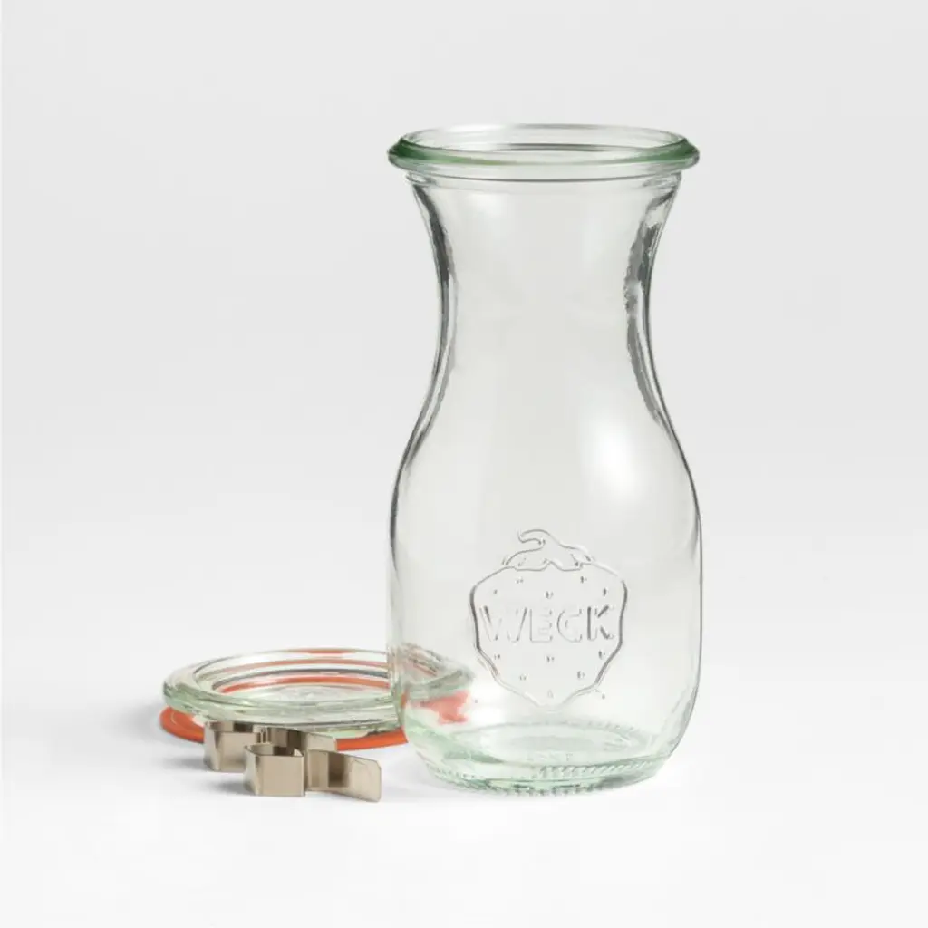 The classic Weck juice jar is a great choice for serving fresh-squeezed orange juice, chilled water, batch cocktails or homemade syrup. The wide-mouth, clear glass container is easy to fill, and the curved shape is comfortable to hold. A glass lid easily secures with a rubber ring and two metal clamps for a tight seal.