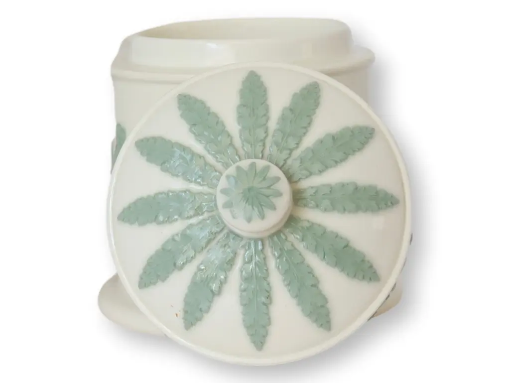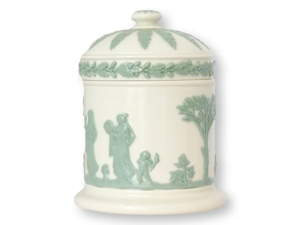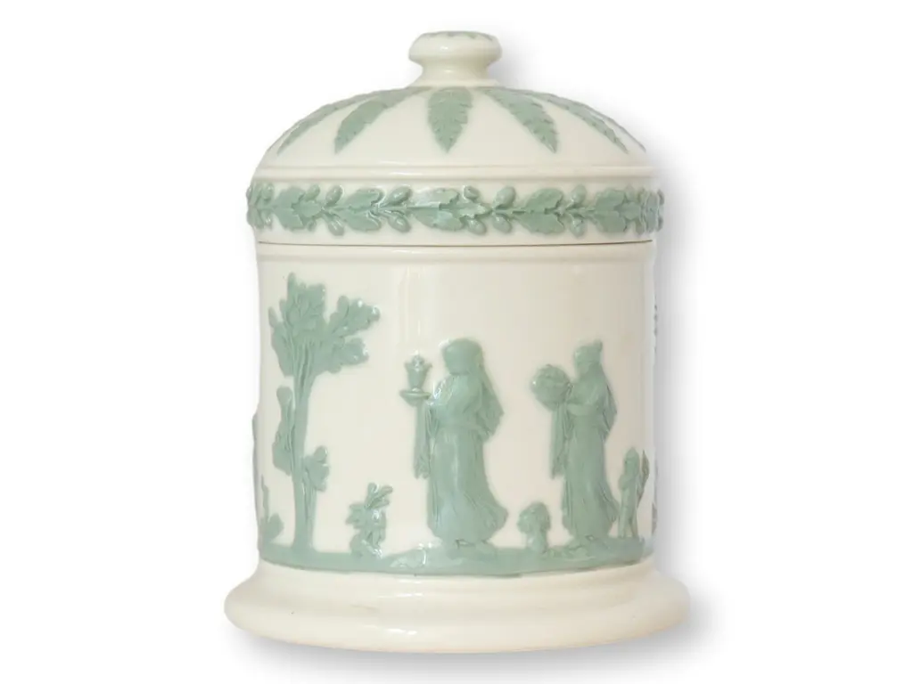 Enhance your collection with this distinguished Wedgwood Queensware tobacco jar, a refined piece that showcases the timeless elegance of cream-colored earthenware. This jar features the classic, smooth glaze associated with Queensware, adorned with raised "Wedgwood Green" detailing. The delicate craftsmanship and historical significance of this piece make it an exceptional addition to any collector��������s cabinet or as a stately decoration in any home.