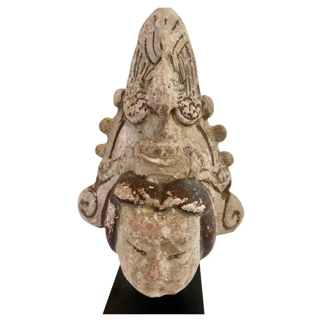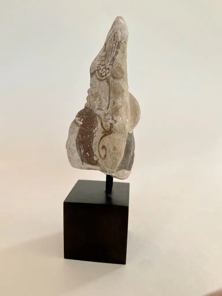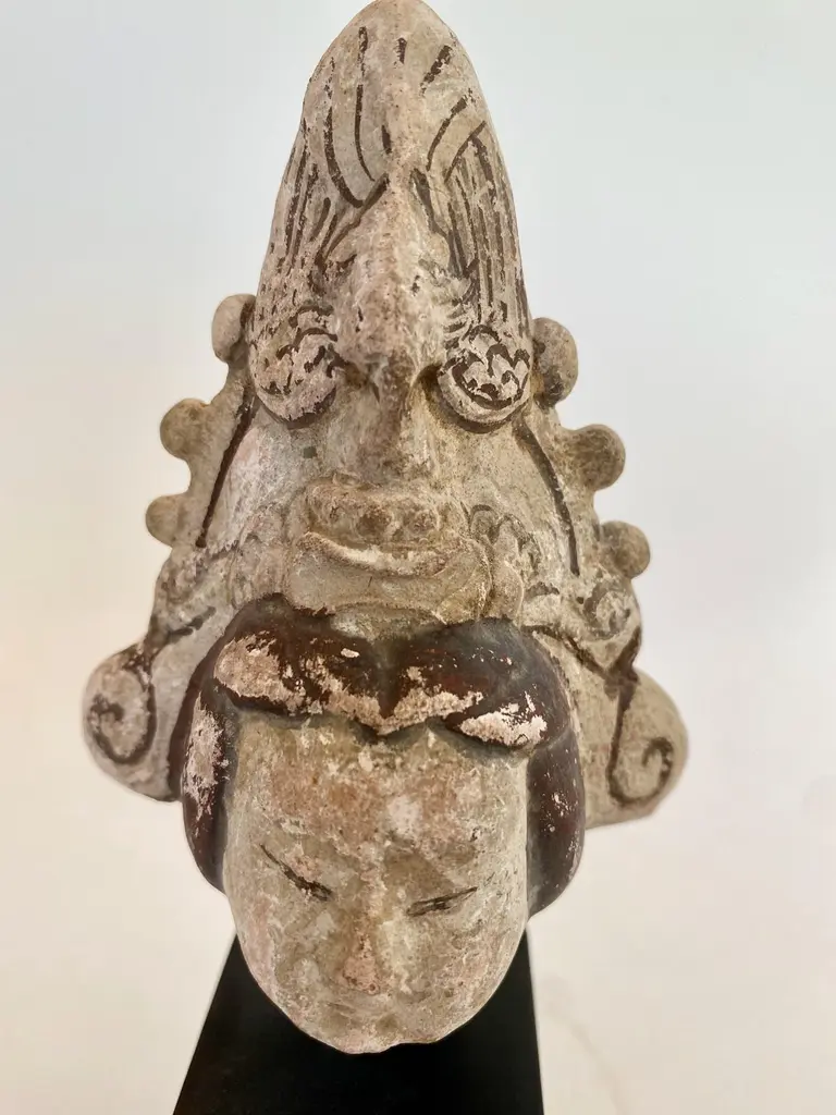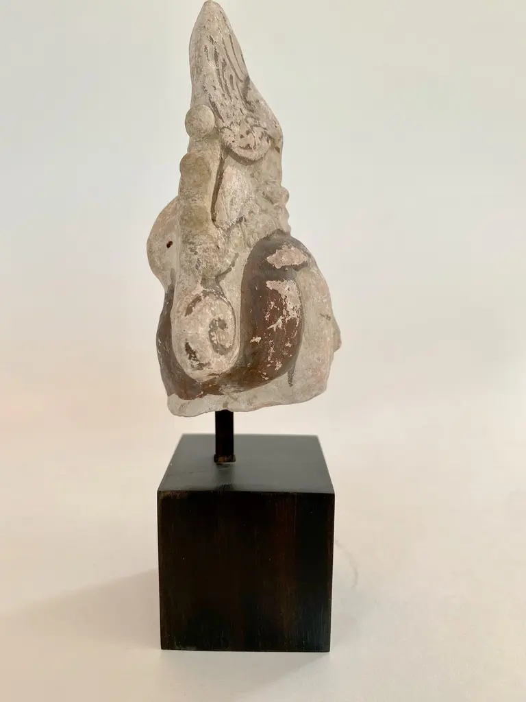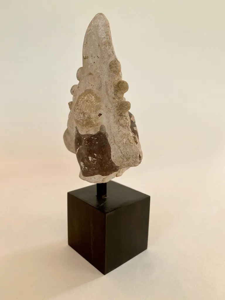 12th century terracotta head of a woman, Song Dynasty (from 960 to 1279). This small, delicately molded head of a woman wearing an elaborate headdress is mounted on a cube-shaped base, and was likely part of a full-figure statue. What is notable about this piece is that, despite the fact that is close to 900 years old, it retains most of its original polychrome painted decoration, including the woman's brown hair and the ornate details on her headdress. There appears to be the figure of a bird on the top of her coiffure, with the painted plumage still visible. While some of the paint has been worn away in spots, this piece is in remarkably good condition for its age.