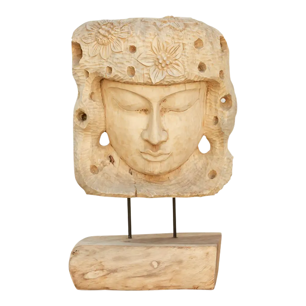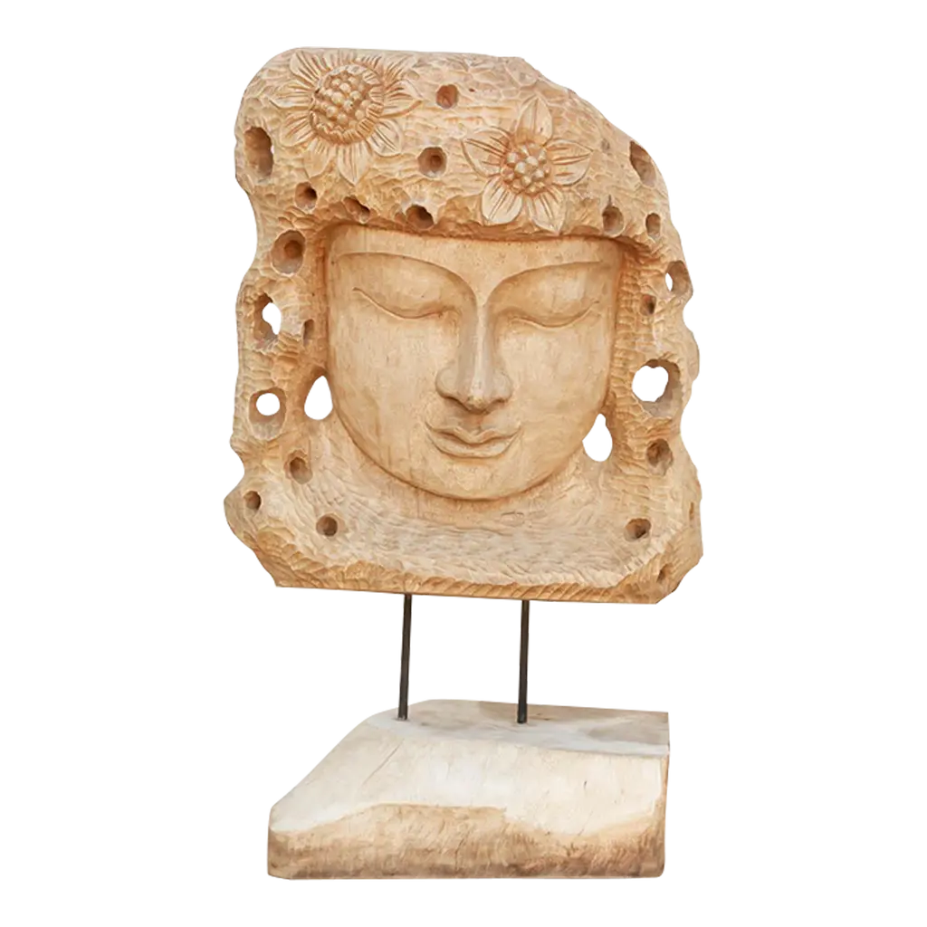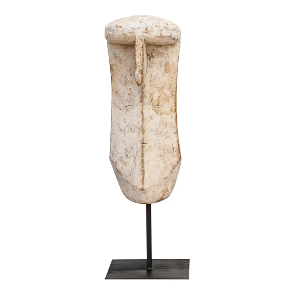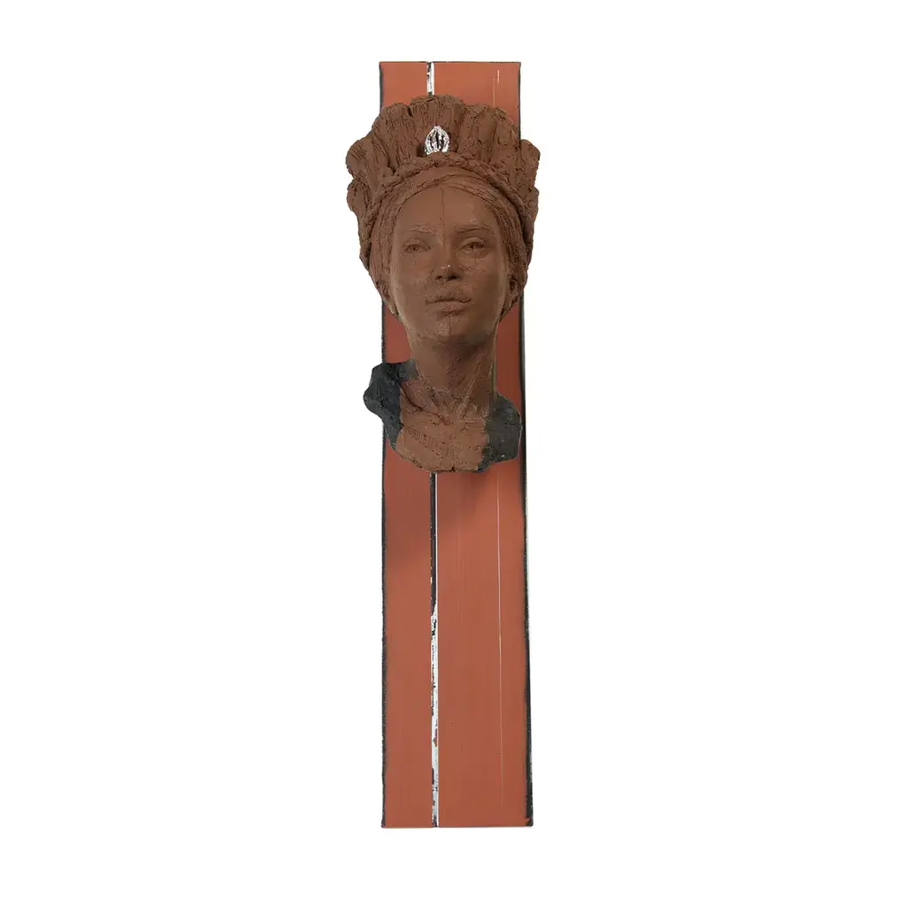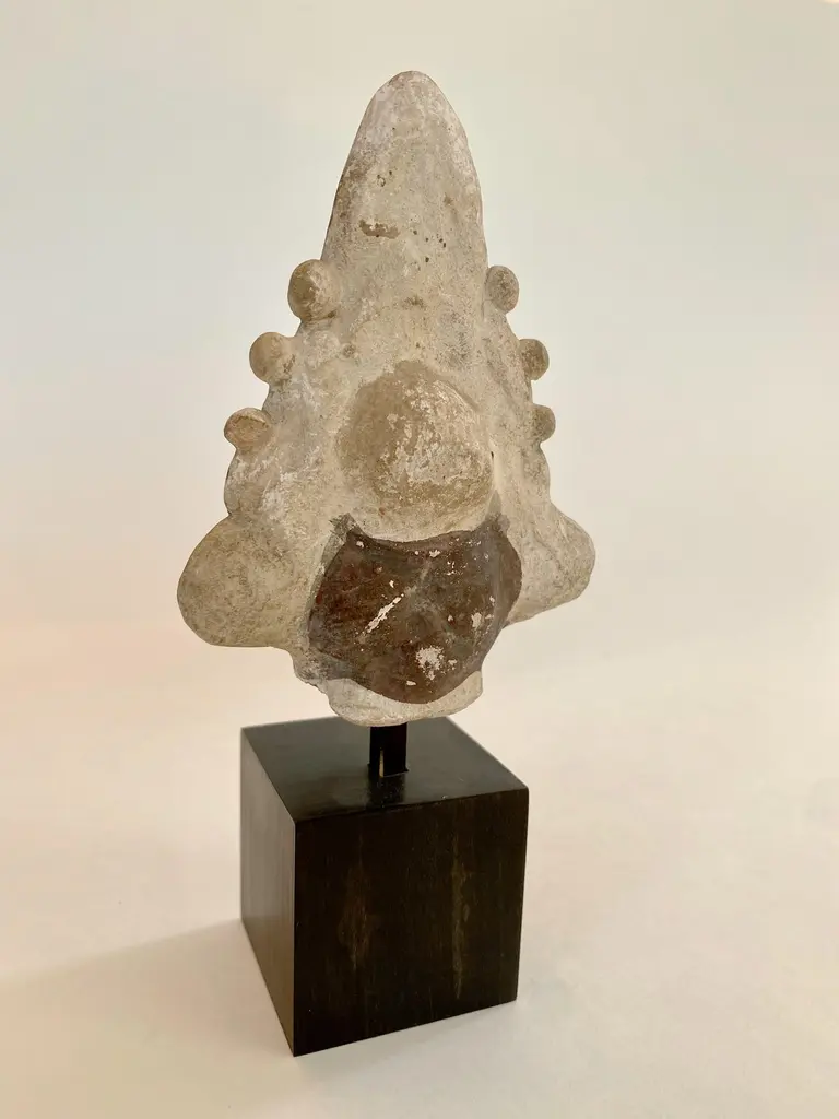 12th century terracotta head of a woman, Song Dynasty (from 960 to 1279). This small, delicately molded head of a woman wearing an elaborate headdress is mounted on a cube-shaped base, and was likely part of a full-figure statue. What is notable about this piece is that, despite the fact that is close to 900 years old, it retains most of its original polychrome painted decoration, including the woman's brown hair and the ornate details on her headdress. There appears to be the figure of a bird on the top of her coiffure, with the painted plumage still visible. While some of the paint has been worn away in spots, this piece is in remarkably good condition for its age.
