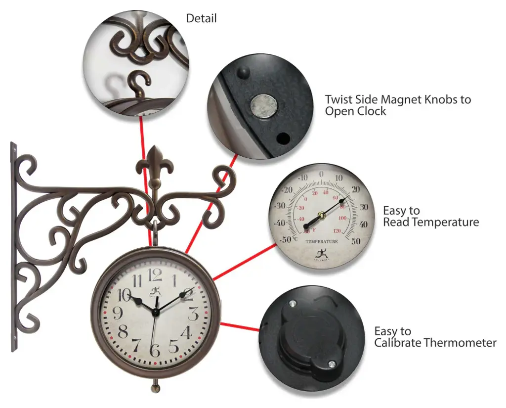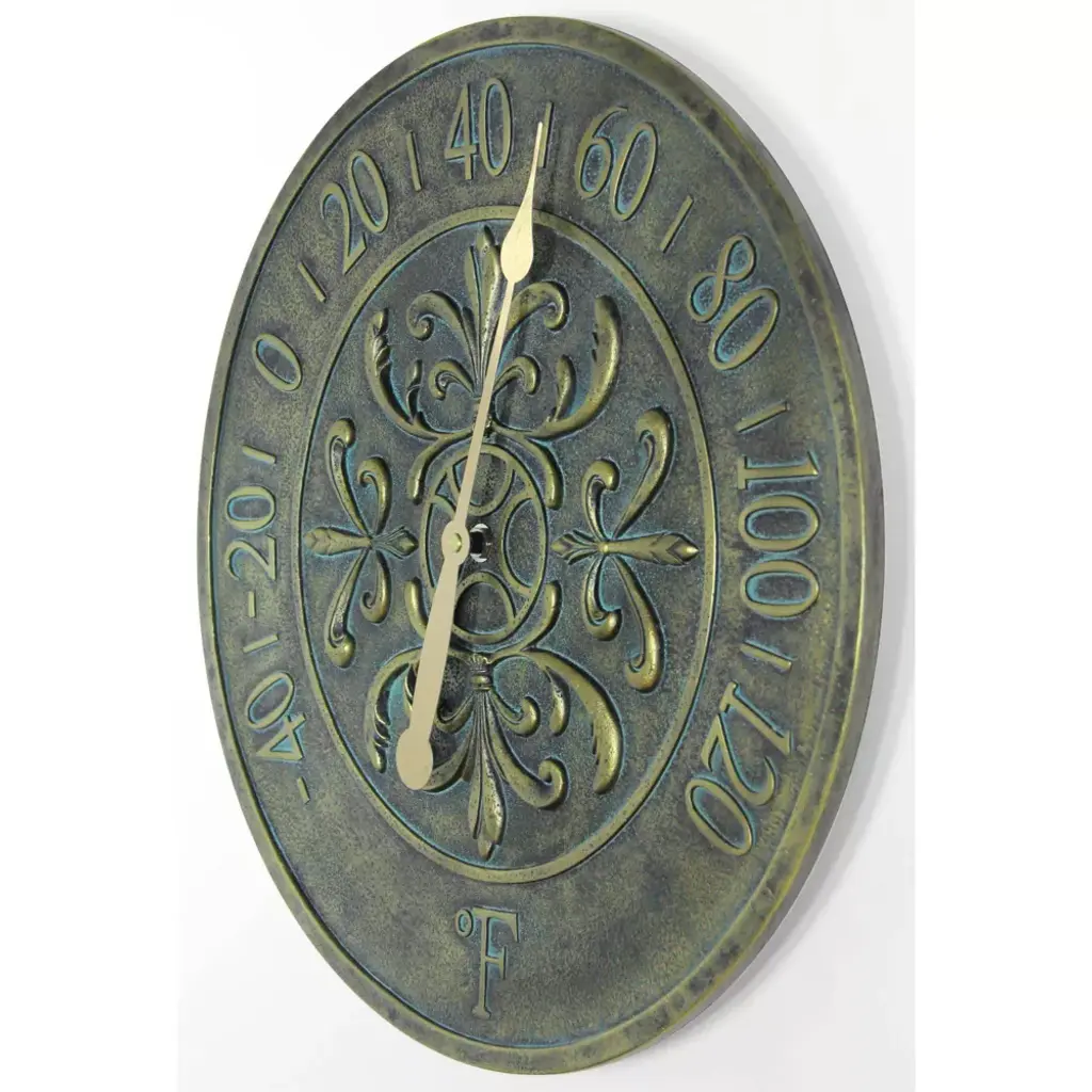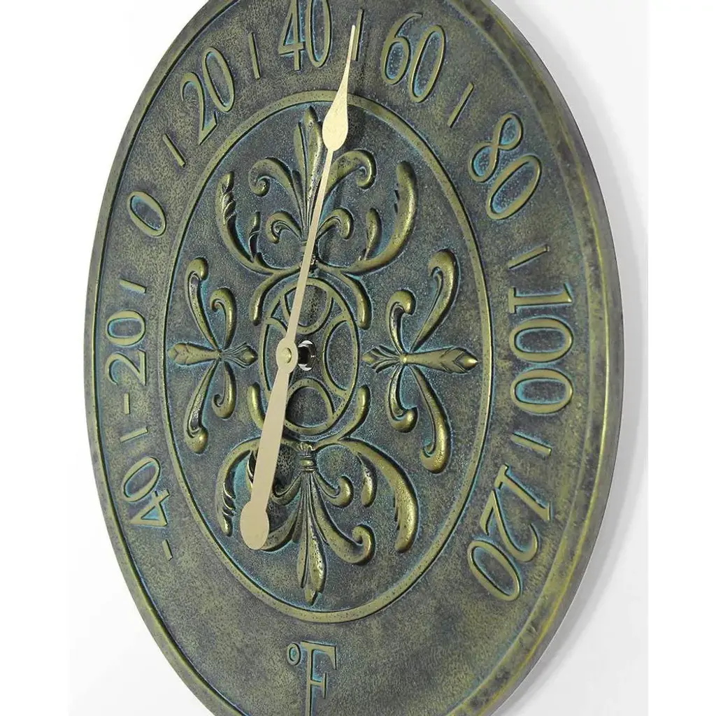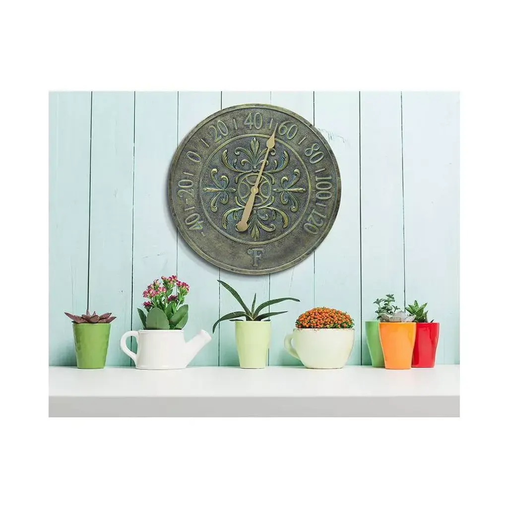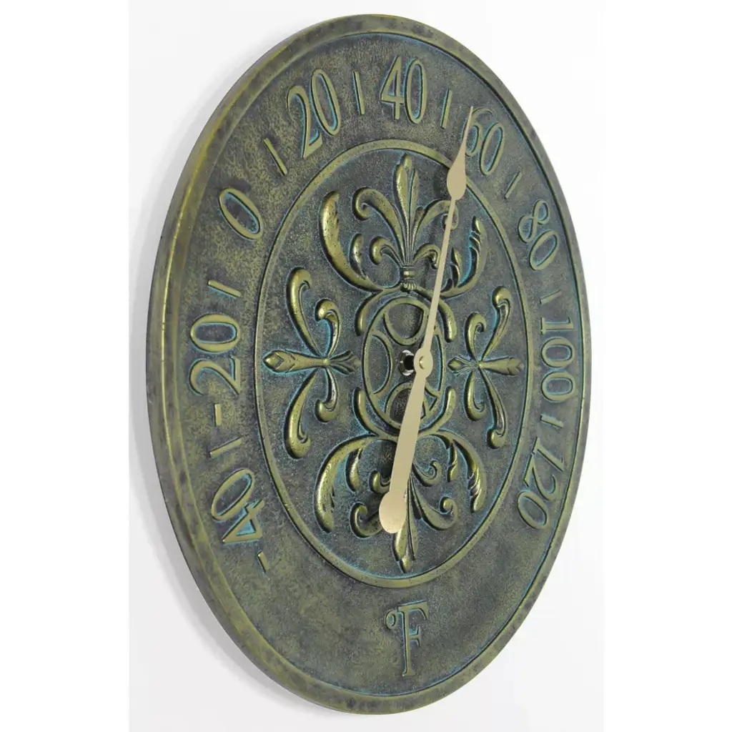 The Blanc Fleur Aged Bronze indoor/ outdoor thermometer from Infinity Instruments is proof that thermometers can have style and flair. This 15 inch versatile wall thermometer has a weathered aged bronze finish, open-faced design, and features a raised fleur-de-lis pattern in the center. With bold Arabic numerals and hand, you can easily read the humidity in any outdoor space. This decorative thermometer is water-resistant, and accurately reads the ambient temperature from -40 degrees to 120 degrees Fahrenheit.
