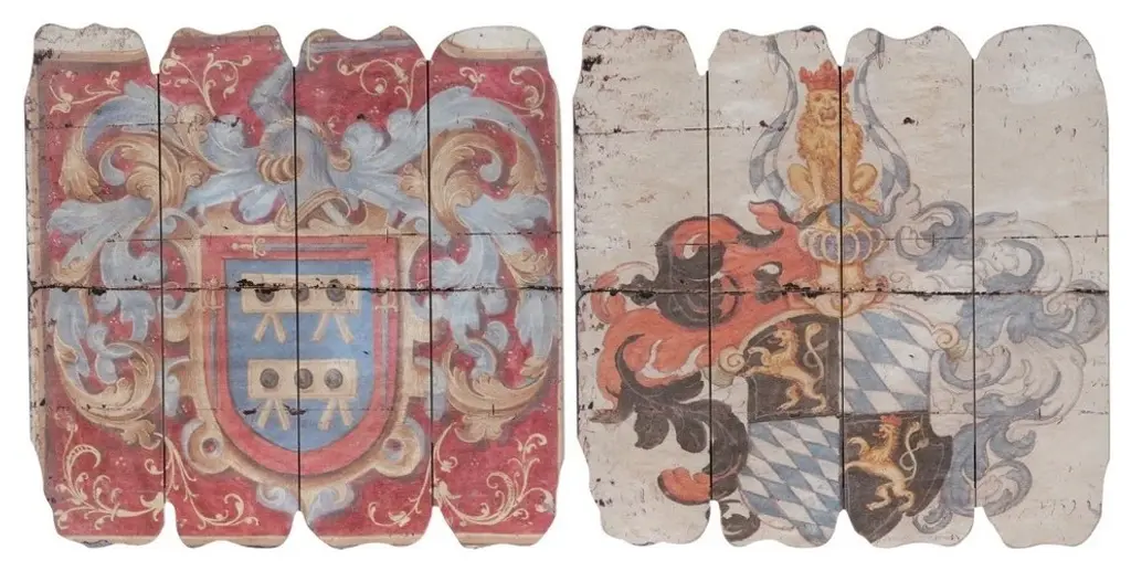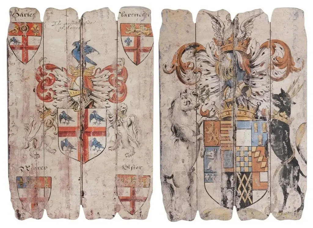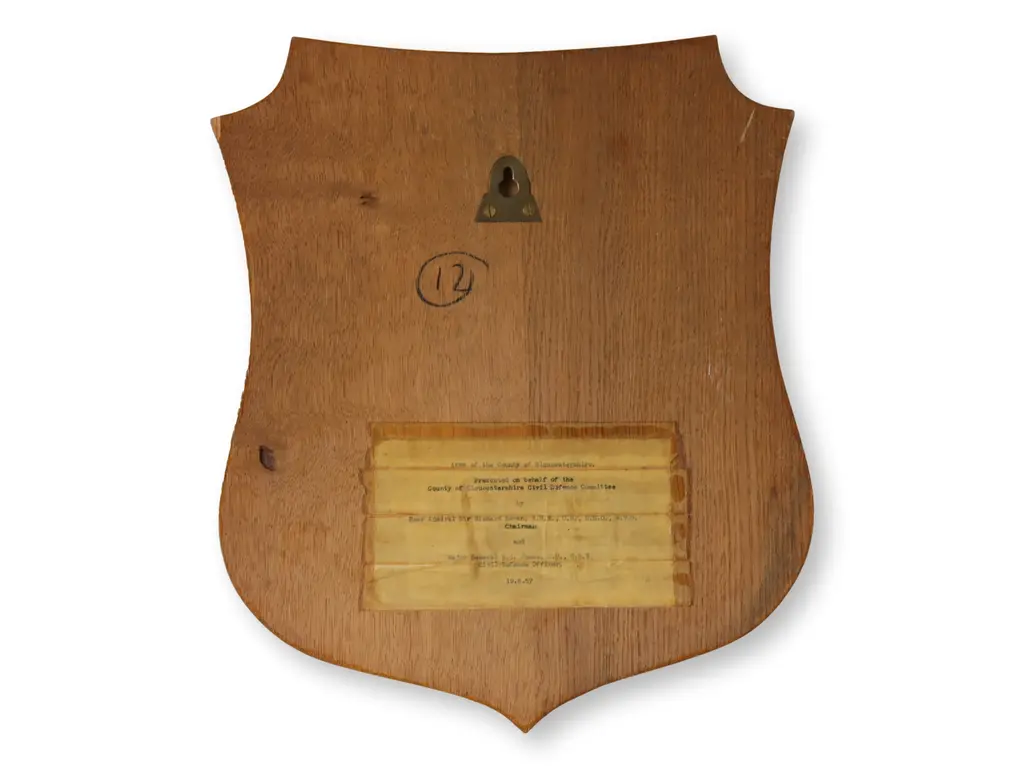This vintage wooden plaque features the Arms of Gloucestershire, a crest decorated with bold red, green, and gold accents, and the motto "Prorsum Semper" (Always Forward). It was presented on behalf of the Gloucestershire Civil Defence Committee by Major-General Sir Richard A. Leese, a distinguished British Army officer, in 1957. The plaque is ready to hang, and a label on the back details the presentation history, adding provenance to this collectible.