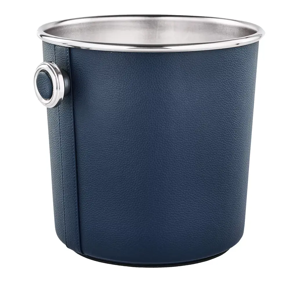 Shimmed Inox set of Glacette and Ice Bucket handmade dressed in fine and soft genuine grain leather. Dimensions of each item: Champagne Glacette: 18 x 18 x 20 cm; Ice Bucket: 15 x 15 x 14 cm. Please ask the Concierge for customization options.