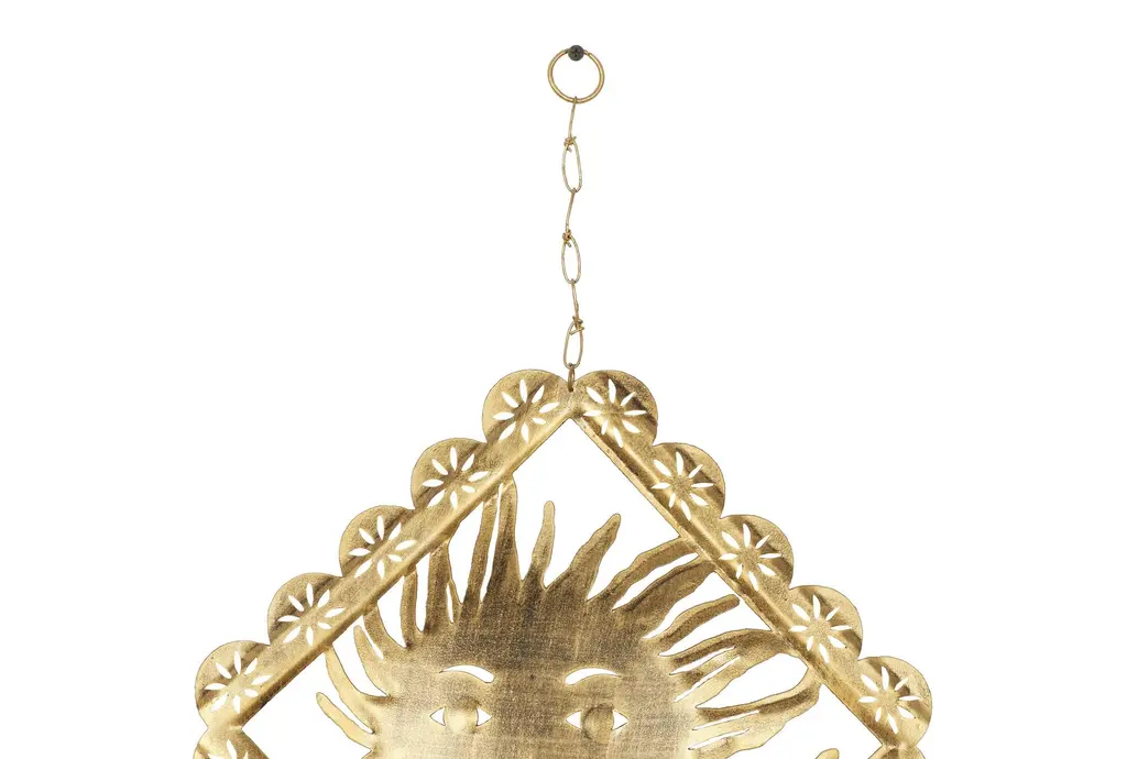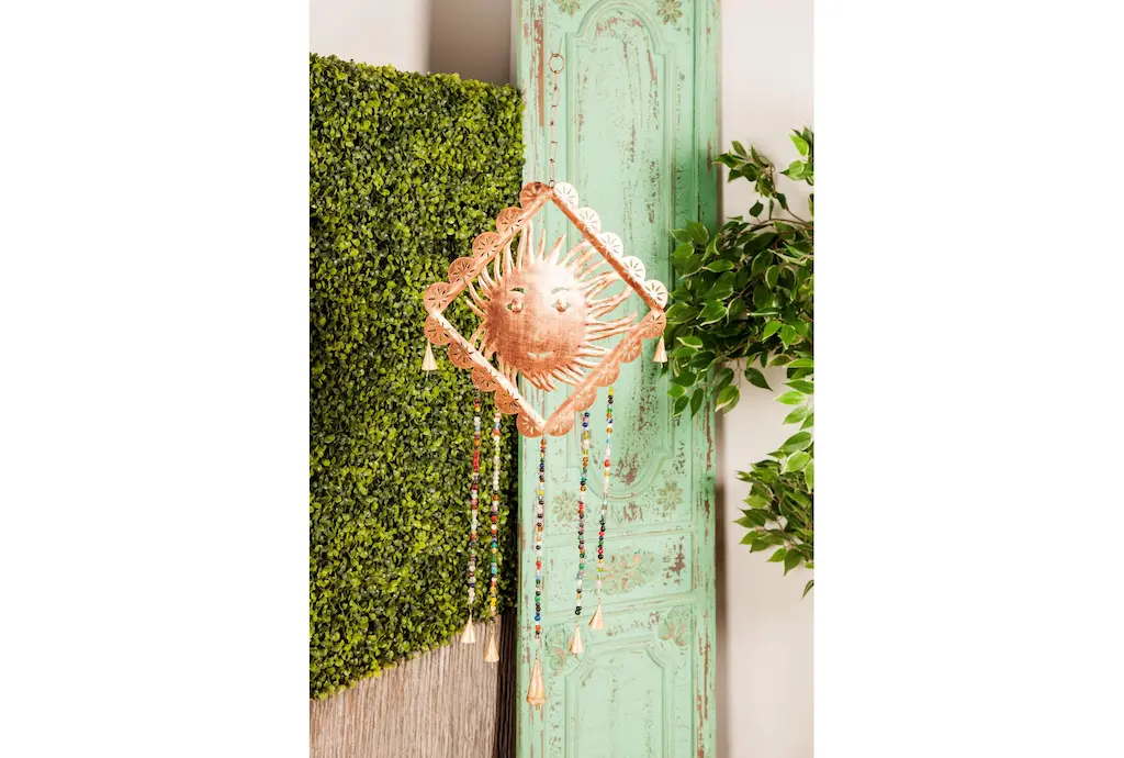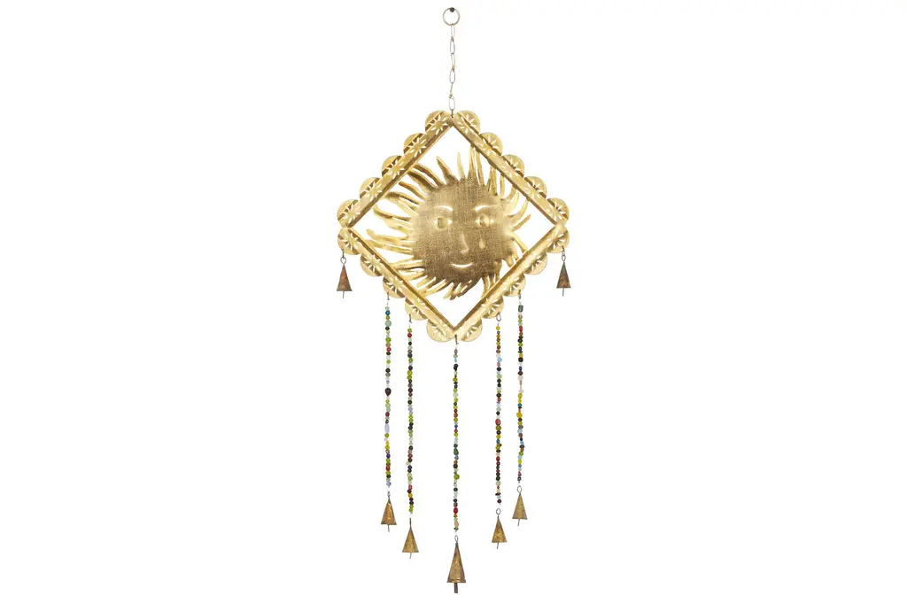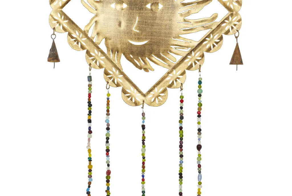 This smiling sun face windchime is ideal for bohemian, coastal, and eclectic-themed living spaces. This item ships in 1 carton. Metal windchime makes a great gift for any occasion. Iron chain is attached at the top section to allow for easy hanging ; nails and screws are not included. Suitable for indoor use only. Made in India. This is a single windchime. Eclectic style.