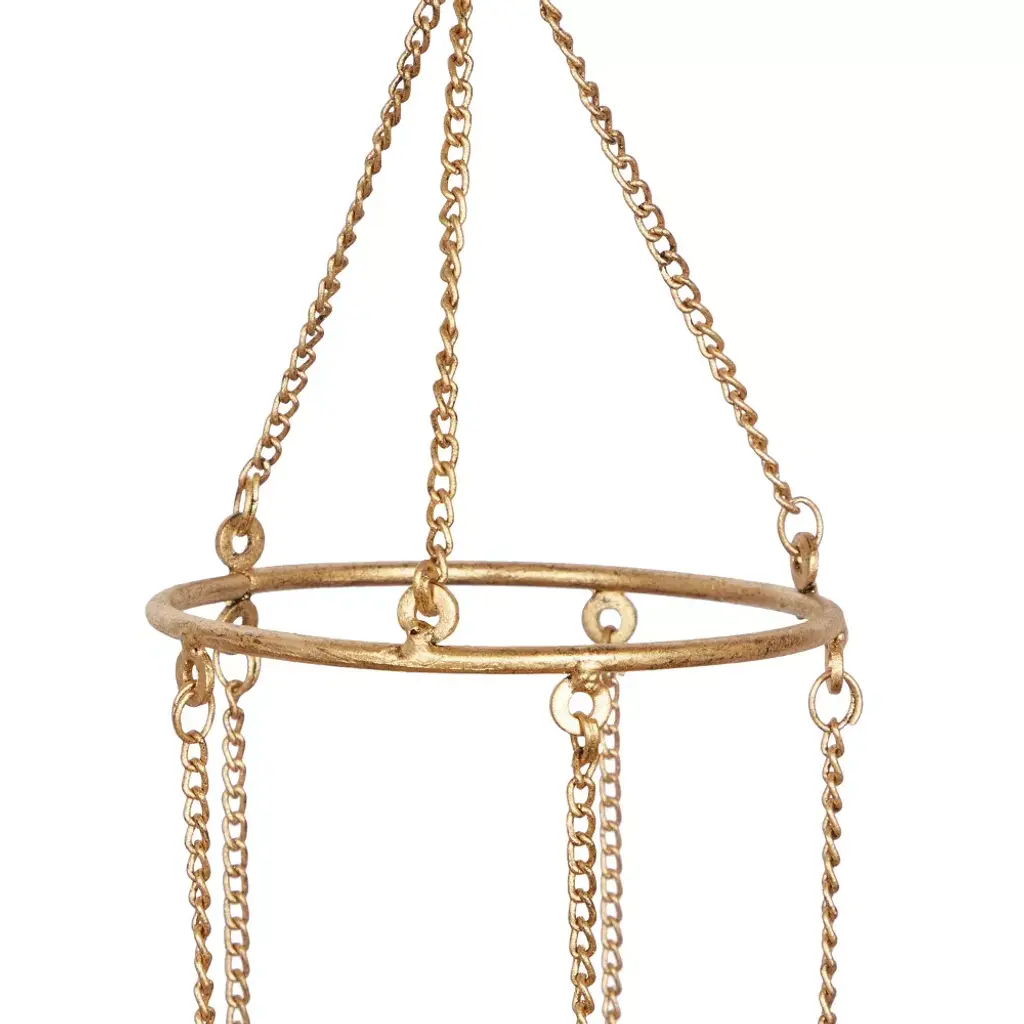 A light and delicate piece to create a whimsical atmosphere anywhere in your home. The soothing sound of this windchime will keep you relax and rejuvenated throughout the day. An enchanting musical art piece that create a delicate touch and whimsical atmosphere anywhere in your home. This item ships in 1 carton. Metal windchime makes a great gift for any occasion. Item comes with metal ring for easy and secure hang; nails and screws are not included. Suitable for indoor and outdoor use. This item ships fully assembled in one piece. Made in India. This is a single gold colored wind chime. Eclectic style.