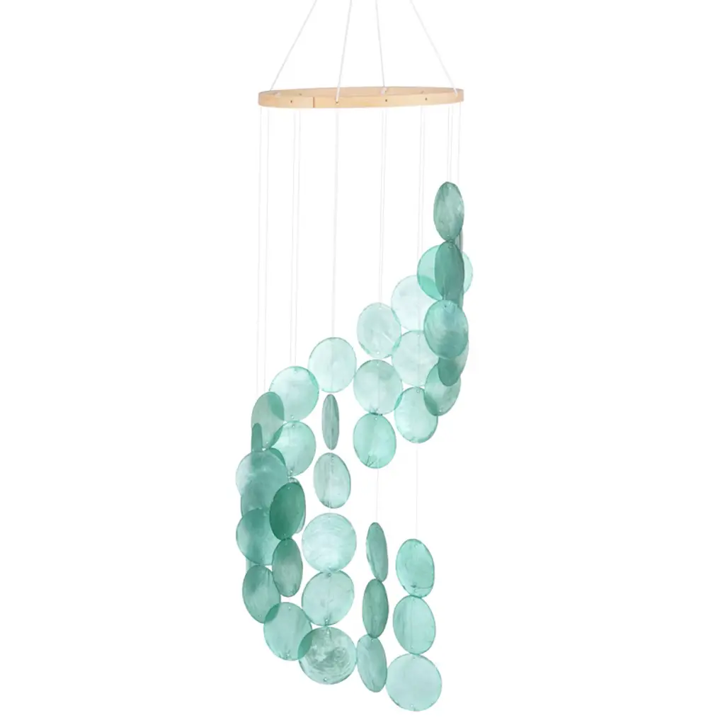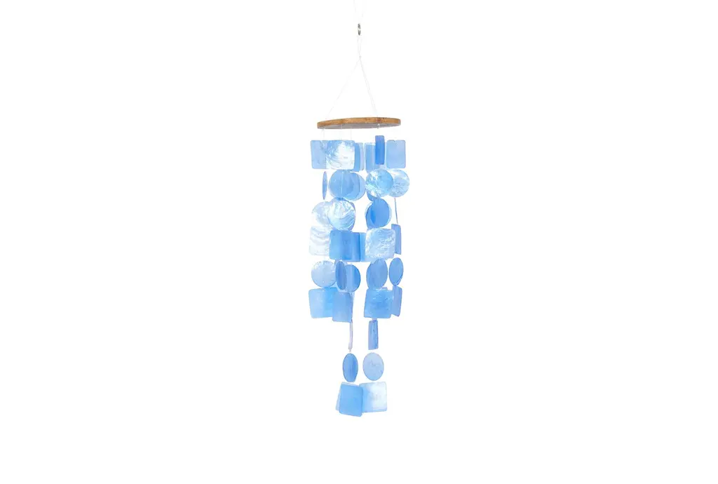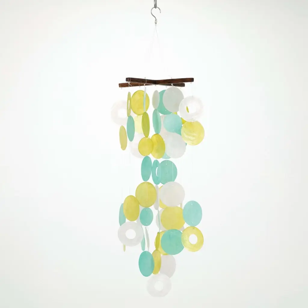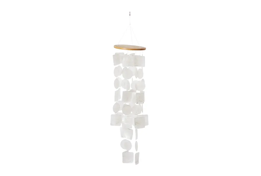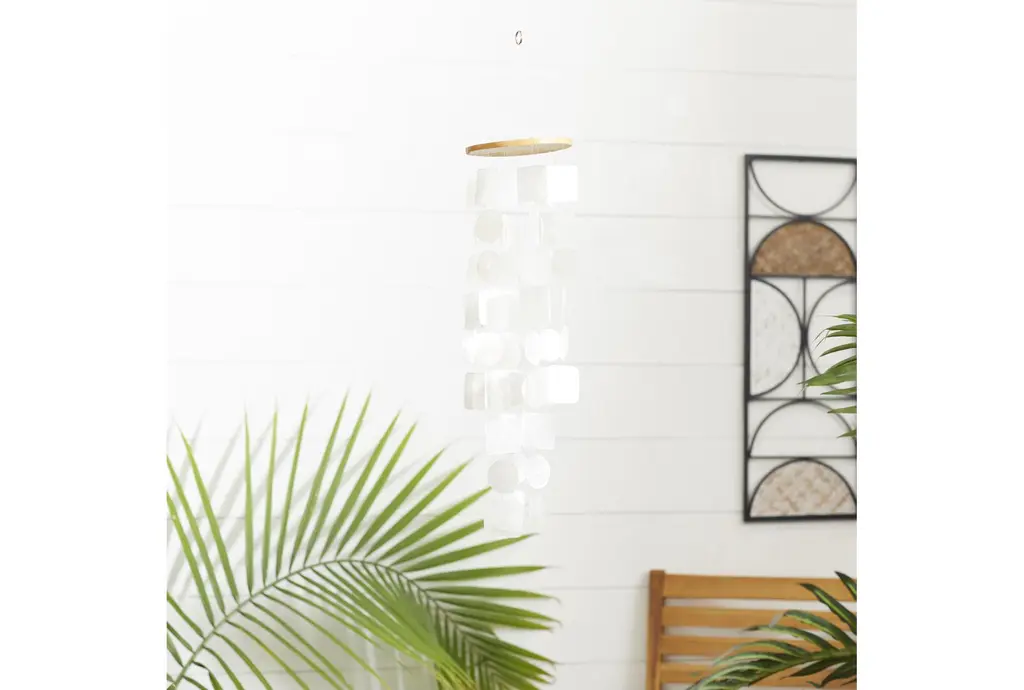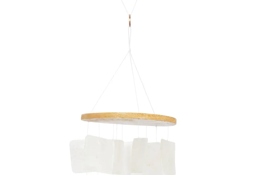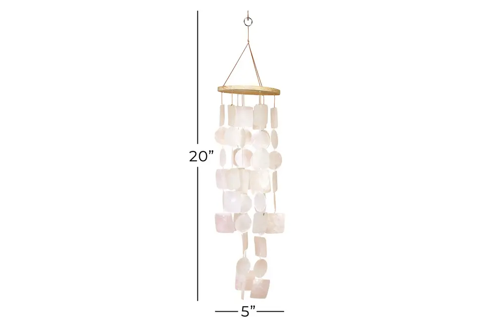 Enhance your living space with the serene sounds of the 5 Inch White Capiz Shell Mother Of Pearl Windchime. This coastal-inspired windchime features a beautiful white color that complements any decor. Made from mother of pearl, it brings a touch of the ocean to your home.