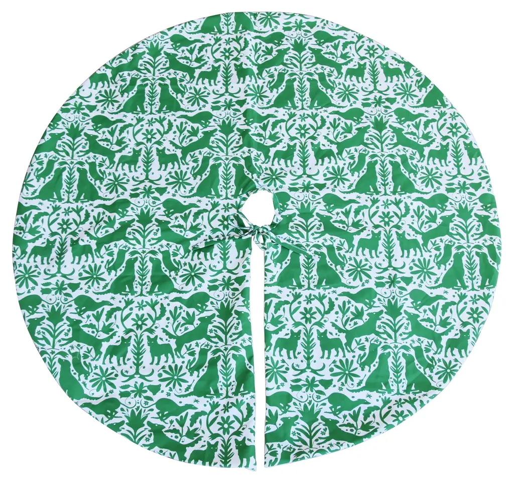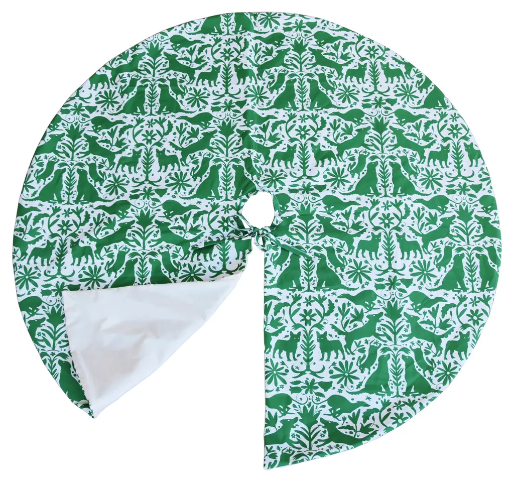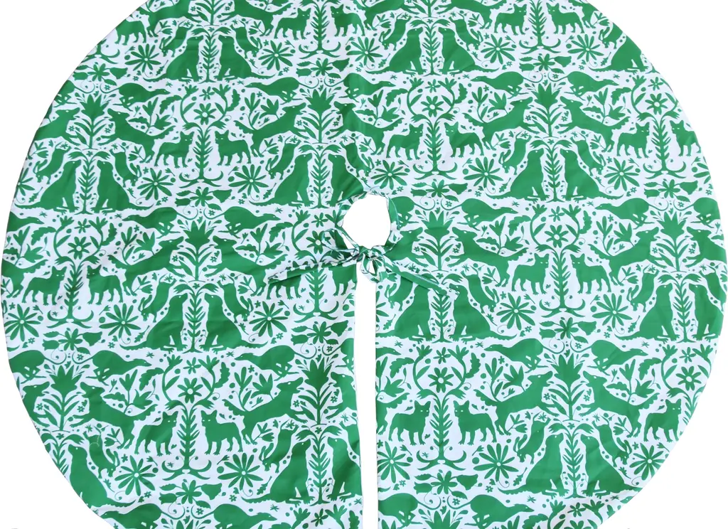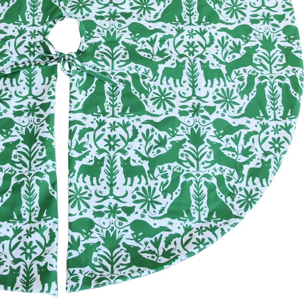 Custom-tailored Christmas tree skirt made from a printed cotton fabric depicting a green-and-white dog and floral Otomi design. Off-white cotton fabric backing. No maker's mark. Excellent new unused condition.
