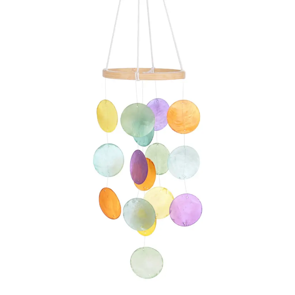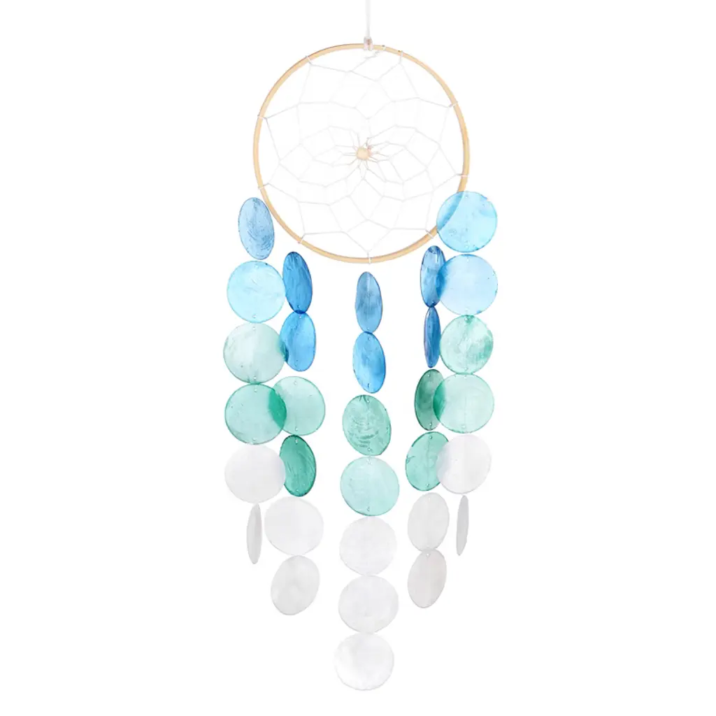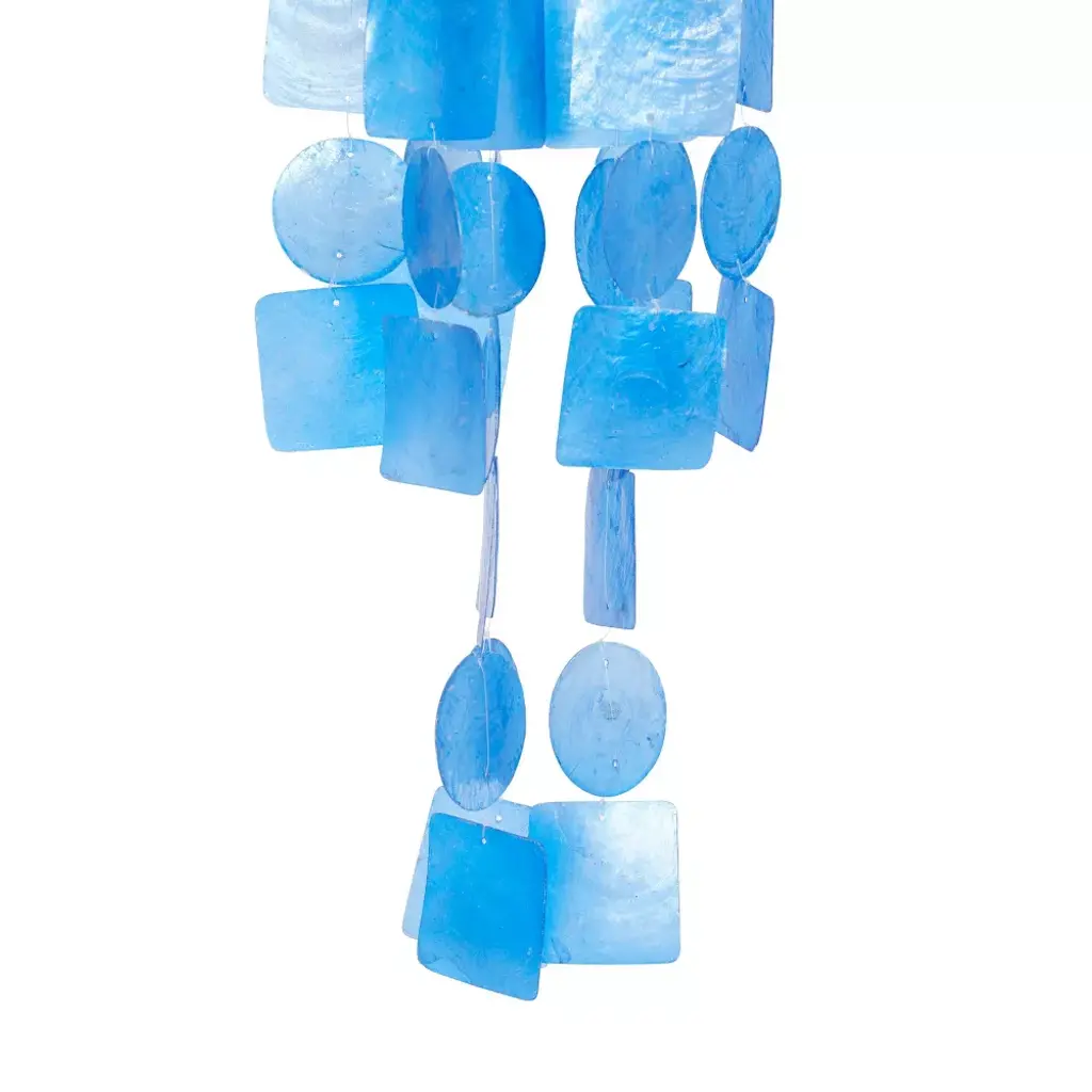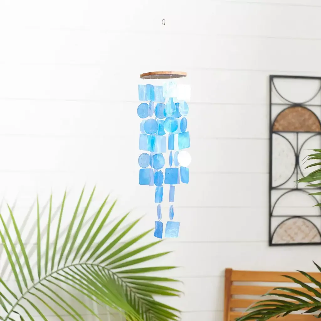 An enchanting musical art piece that create a delicate touch and whimsical atmosphere anywhere in your home. This item ships in 1 carton. Capiz windchime makes a great gift for any occasion. Item features metal ring for easy and secure hang; nails and screws are not included. Suitable for indoor use only. This item ships fully assembled in one piece. Made in Indonesia. This is a single blue colored wind chime. Coastal style.