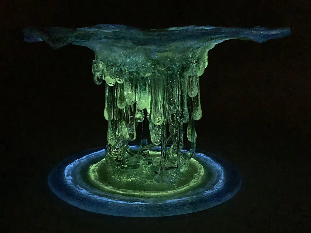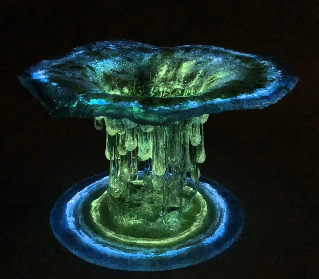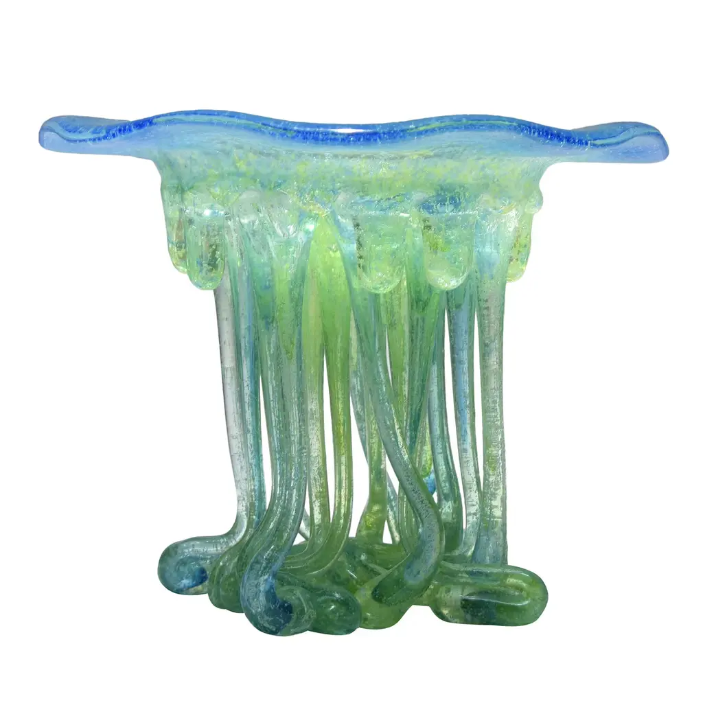 The jellyfish is the main element of the Mosche Bianche's "Medusa" Collection: fluid, delicate but also dangerous and deadly. It represents the water, the circle of life. The special pigments in this creation make it flourescent. The fluorescence is the property that allows an object to absorb the light, such as sunlight or artificial light from environment and to accumulate it. Into the dark that object slowly releases the stored light, self illuminating for many hours, creating a suggestive effect. Glass fusing basically means building a new solid-state glass, assembling different pieces that, in contact with heat, varying from 800 ° C to 850 ° C, become so fluid that they join together deeply and irreversibly.The cooling is very slow in order to allow the total reorganization and recovery of the molecular stability that the material possessedbefore being heated. Glass fusing allows, using colored compounds (enamels, oxides) to produce polychromeobjects.The work of the artist uses two main tools: heat and the force of gravity. The result depends on the degree of communication between the artist, the glass and the oven he uses.Size: cm 37 x 37 x 21 (inch.14.57 x 14.57 x 8.26)This handmade masterpiece is a unique piece, made in Italy.