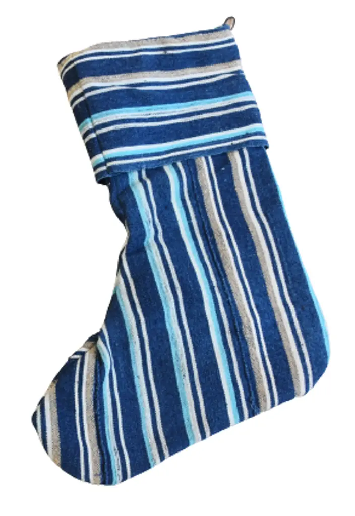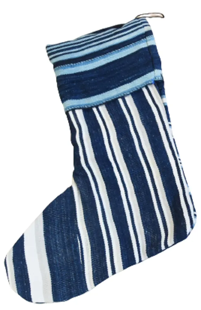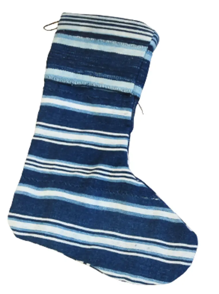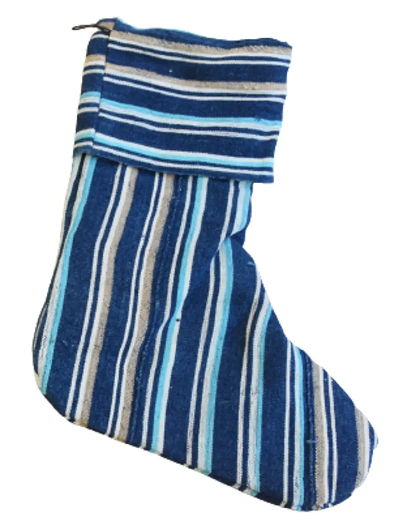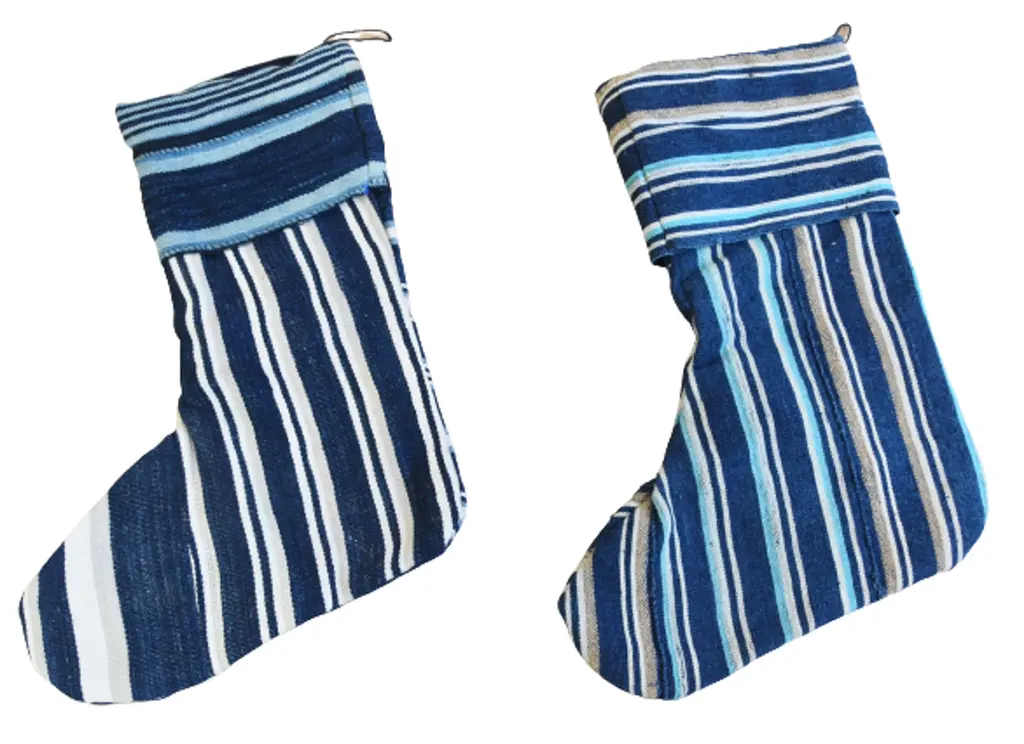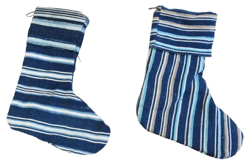 Set of two blue and white custom-tailored one-of-a-kind vintage African textile Christmas stockings. Double-sided with folded-down cuff and twine loop for hanging display. The stocking's interiors are lined with cotton canvas fabric. Ample room for stuffing lots of goodies and surprises. No maker's mark. Excellent vintage condition.