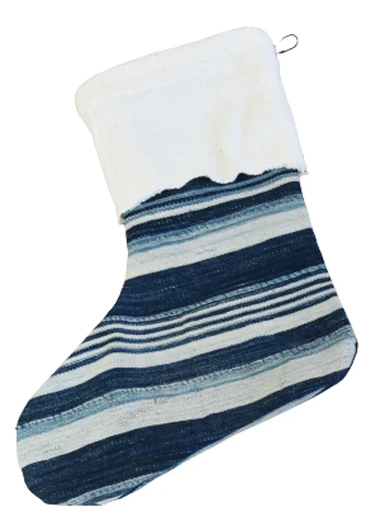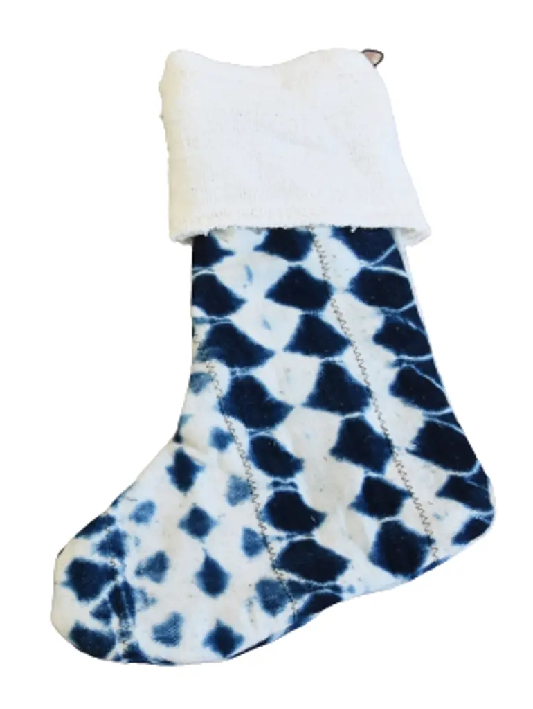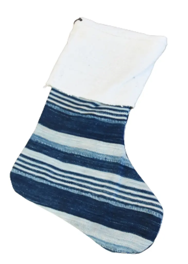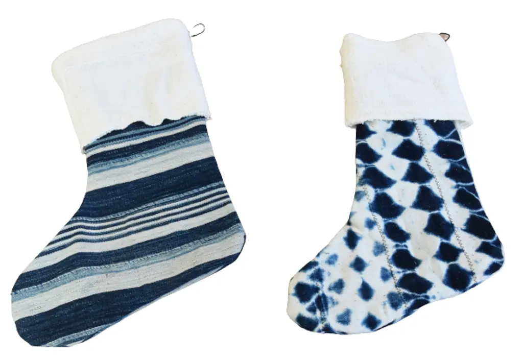 Set of two blue and white custom-tailored one-of-a-kind vintage African textile Christmas stockings. Double-sided with folded-down cuff and twine loop for hanging display. The stocking's interiors are lined with cotton canvas fabric. Ample room for stuffing lots of goodies and surprises. No maker's mark. Excellent vintage condition.