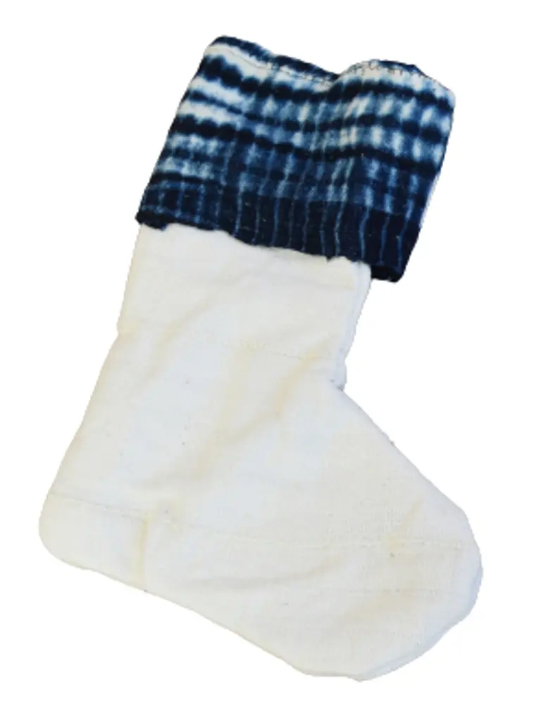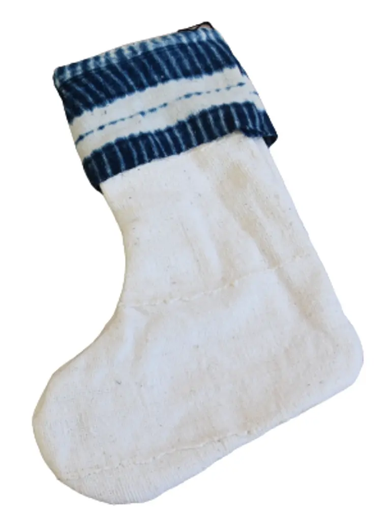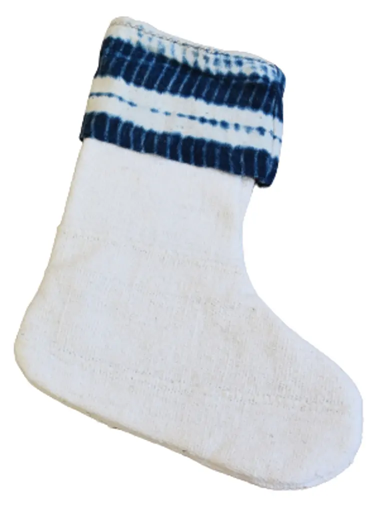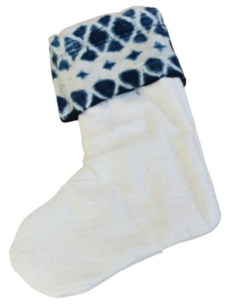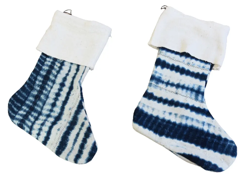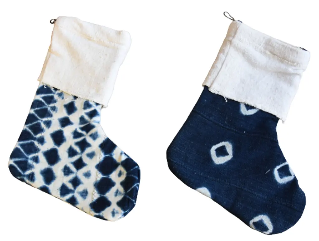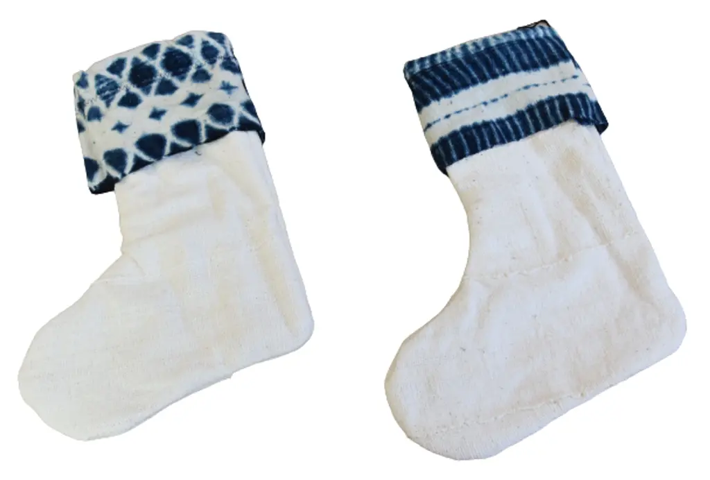 Set of two blue and white custom-tailored one-of-a-kind vintage African textile Christmas stockings. Double-sided with folded-down cuff and twine loop for hanging display. The stocking's interiors are lined with cotton canvas fabric. Ample room for stuffing lots of goodies and surprises. No maker's mark. Excellent vintage condition.