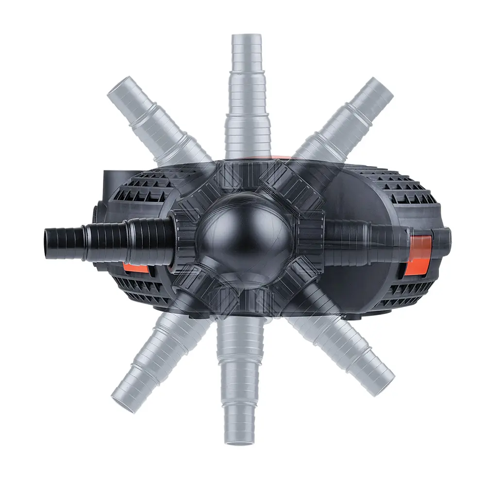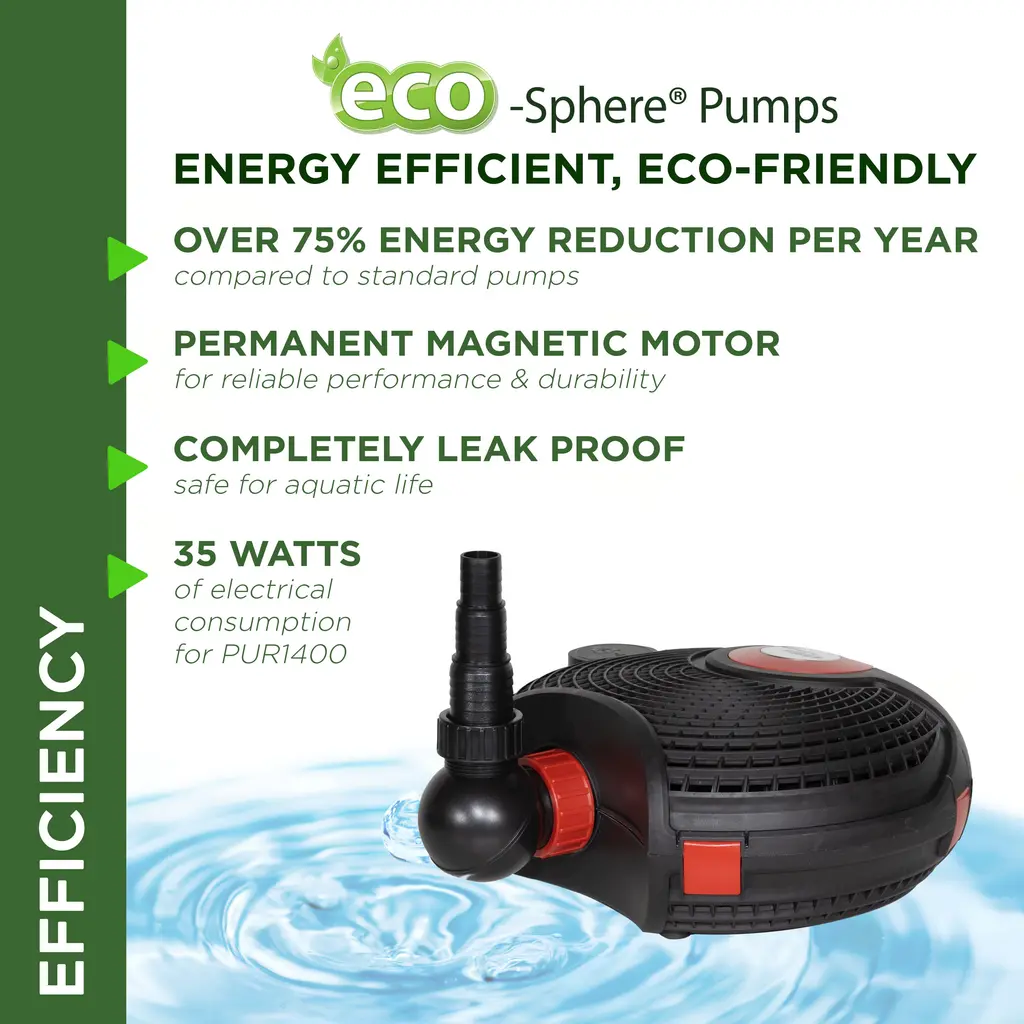Keep the water flowing while saving energy with the Alpine Corporation Eco-Sphere Pond Pump. This Energy Efficient pond pump provides an over 75% reduction in energy consumption per year for a cost-saving alternative to standard pumps, while the inline controller allows you to adjust the water flow with ease. This energy-efficient pond pump is designed with a permanent magnetic motor for reliable and long-lasting performance, while its vortex impeller with oil-free and epoxy-protected ceramic impeller shafts resist damage to keep water flowing. It also features a large pre-filter cage that minimizes pump damage and clogging, and it is completely leak-proof and ecologically-friendly to protect aquatic life. This versatile pump is great for use in ponds, fountains, waterfalls, filtration systems, and more, and it can be installed fully-submerged or on land to best fit your water feature. It can also be placed vertically or horizontally, and the 360 degree rotating hose adapter with 3 size variations offers a full range of motion for easy installation. For convenient maintenance, this professional pond pump features "click-fit" connectors for simple disassembly without tools and compatibility with other Alpine Corporation pond systems. This fully-submersible pond pump measures 14"L x 15"W x 6"H with a 33-ft. power cord, and it includes a three-year manufacturer's Support from date of purchase. Alpine Corporation is one of America's leading designers, importers, and distributors of superior quality home and garden decor products. Alpine Corporation's award winning in-house design team continuously develops new and innovative "statement pieces" for your home and garden. Your indoor and outdoor living spaces will be the envy of the neighborhood with our wide assortment of fresh, fashionable and contemporary products, from beautifully crafted solar garden stakes featuring patented motion and fiber optic lighting technology to beautiful fountains and delightful bird baths and feeders. Features: