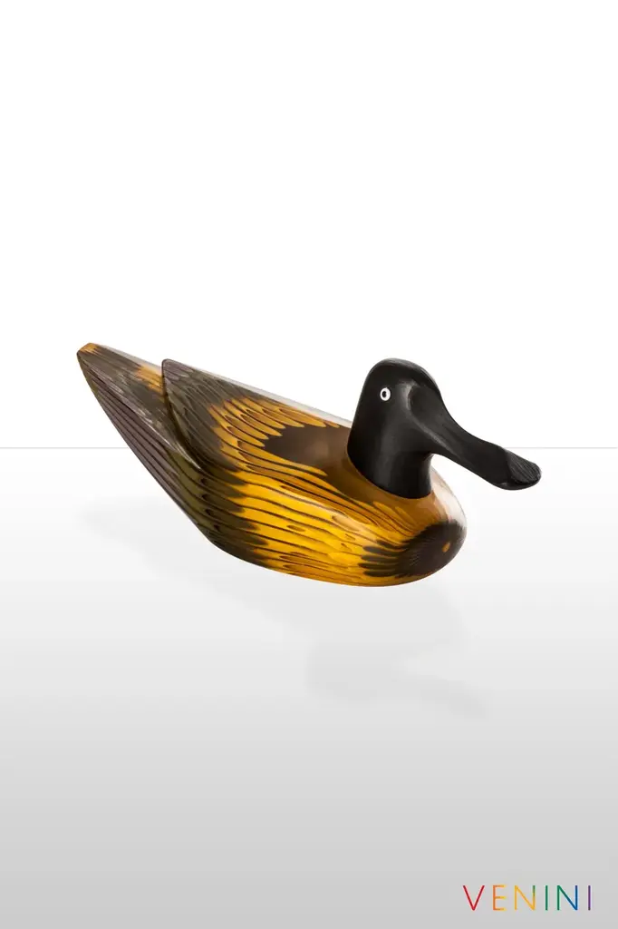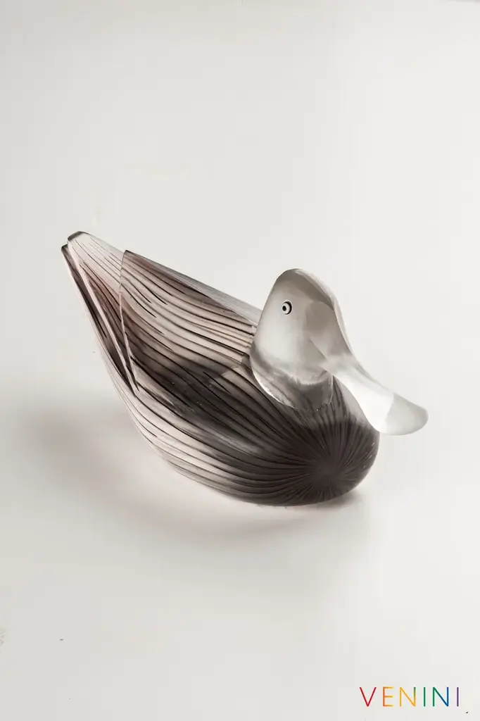 Anatra is an ornament made of cut blown glass. Exuberant and lively, the duck gazes at the viewers and catches their attention, almost inviting them to stare back: it is so beautiful they can’t look away. If only Toni Zuccheri’s creations could talk; nonetheless, they strike the eye. Perhaps what impresses us most is their exquisitely striped crystal plumage.Colors: Multicolour, Crystal / BlackToni Zuccheri’s travelling companions: animals have given life and soul to the splendid glass works of this artist. The decoys used by hunters to attract real ducks, normally made from straw, wood and tar, become precious objects when formed from rods of different coloured glass, masterfully ground to shape.Numbered edition for year