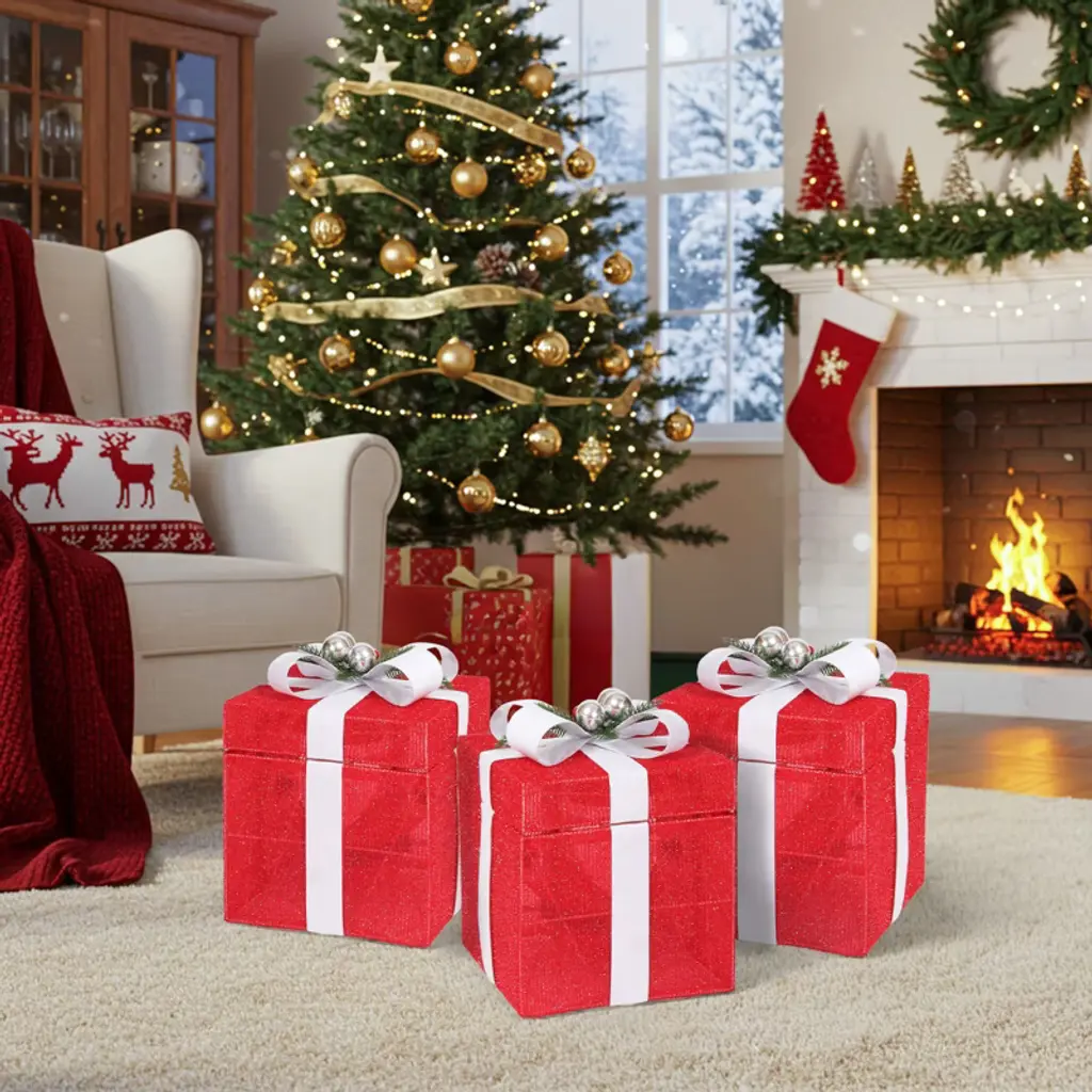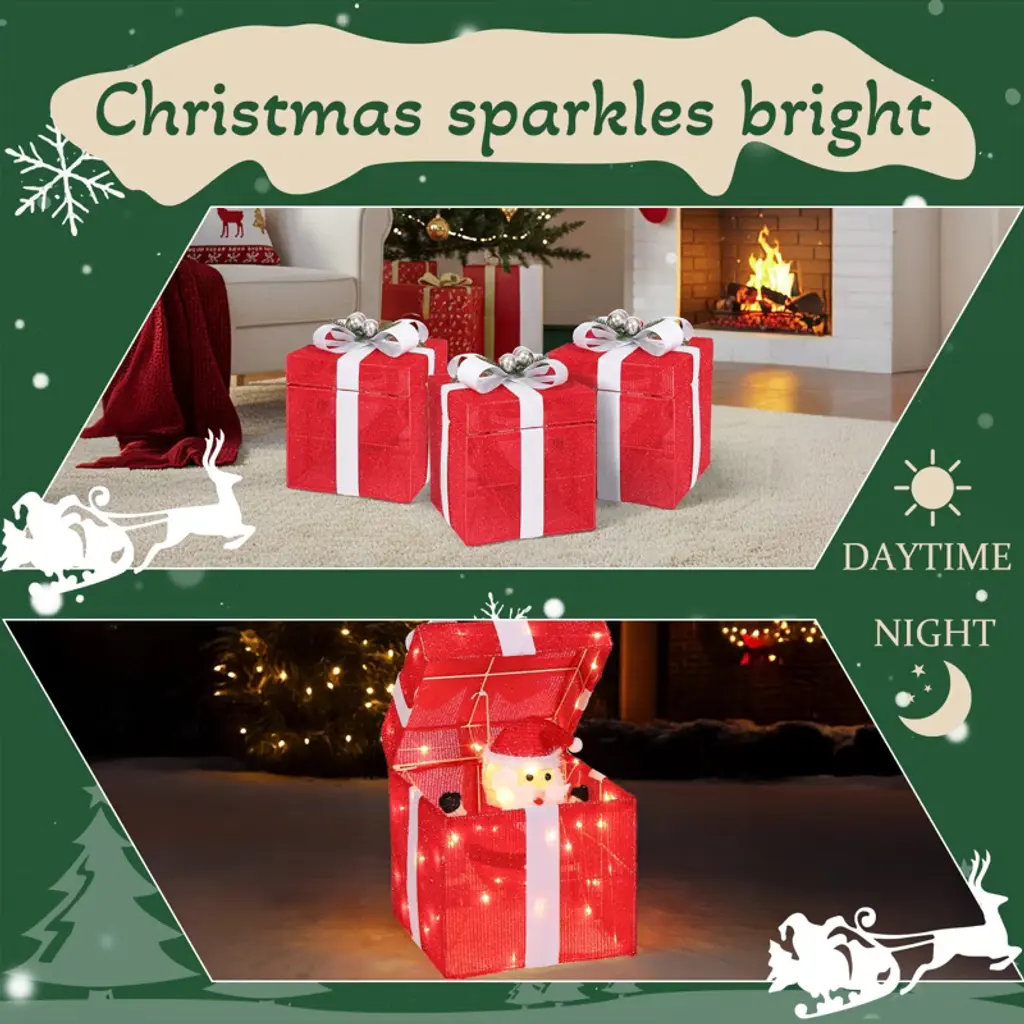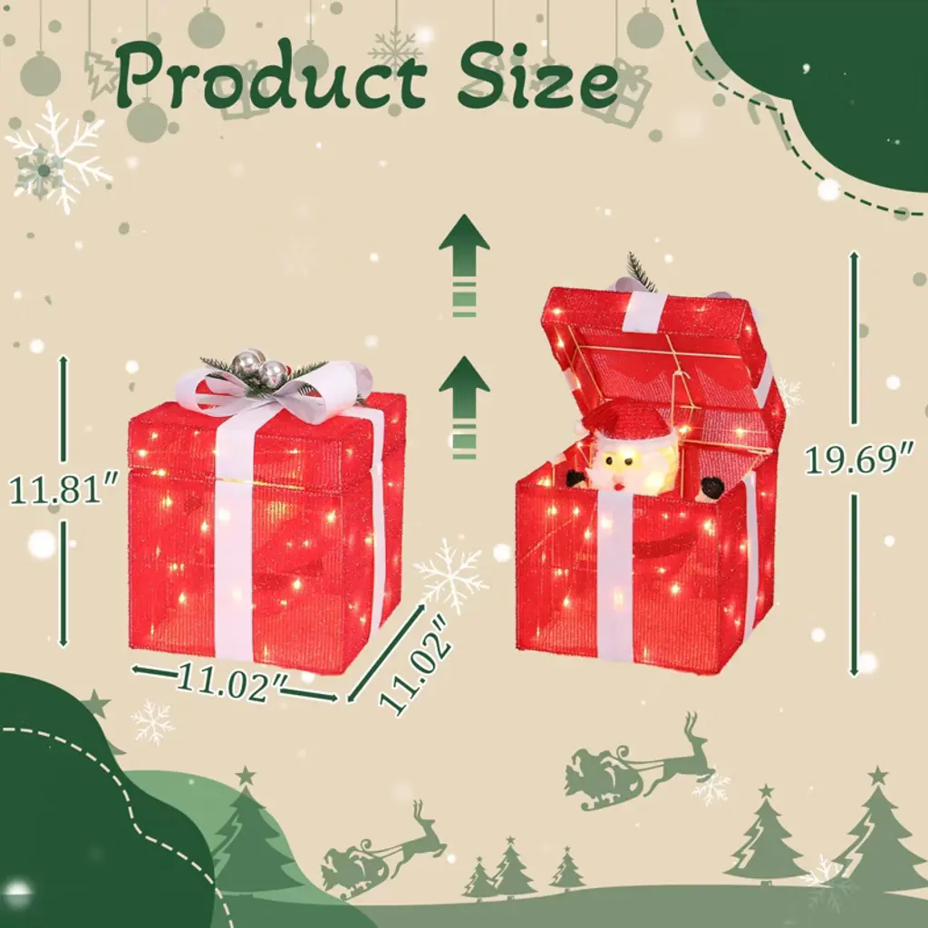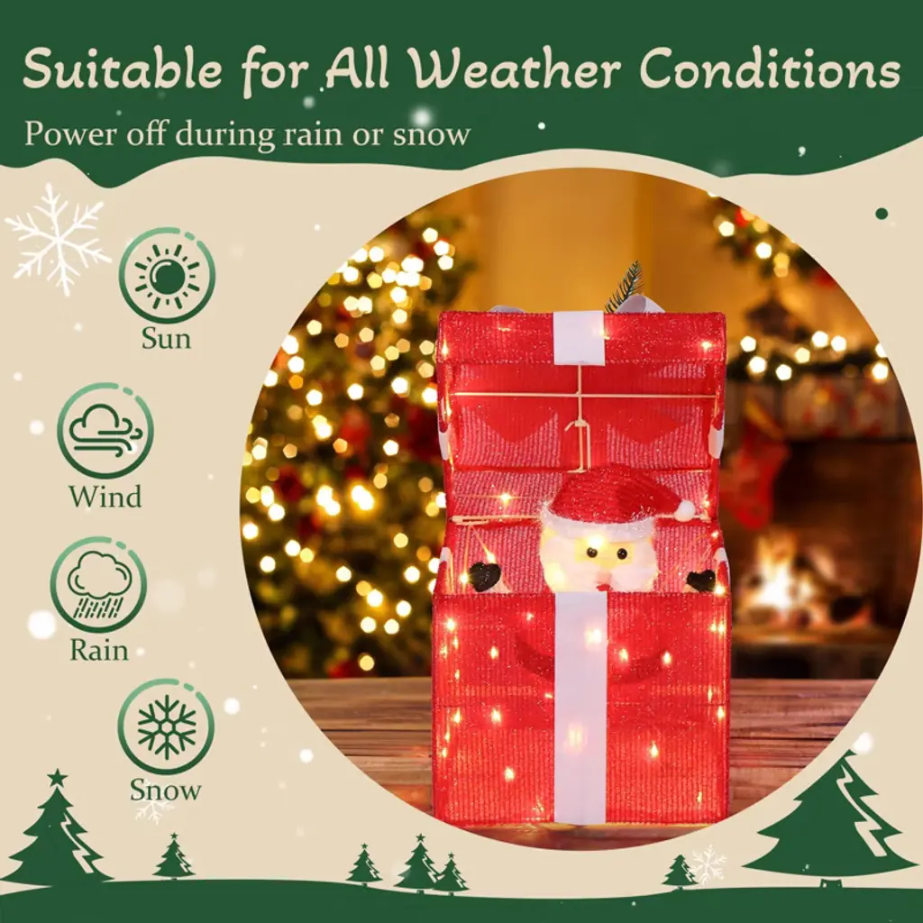 This motorized gift box pops open to reveal Santa, with 60 LED lights and automatic motion. Weather-resistant for outdoor use. Easy plug-and-play setup. Compact size ideal for indoor/outdoor holiday displays. Adds dynamic fun to Christmas decor.