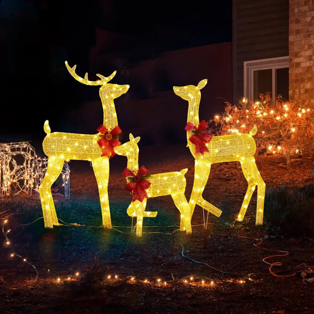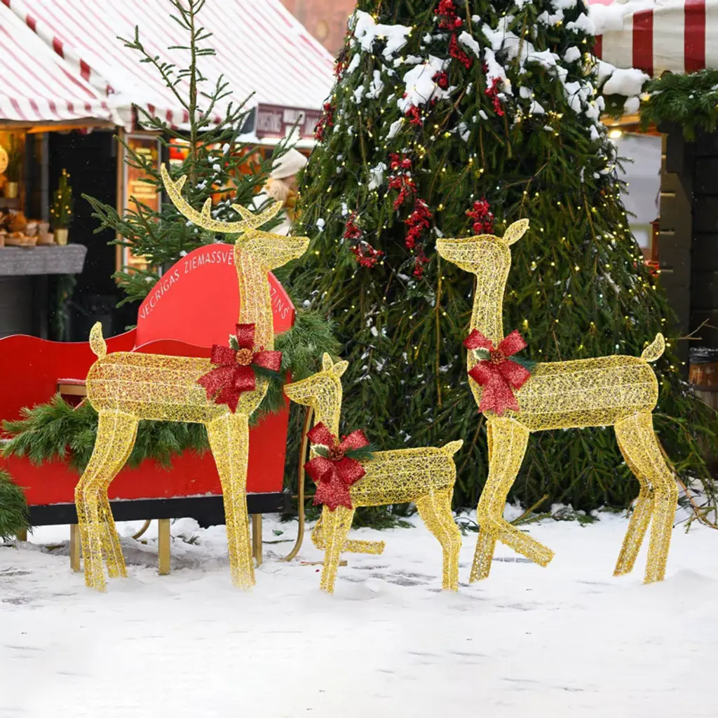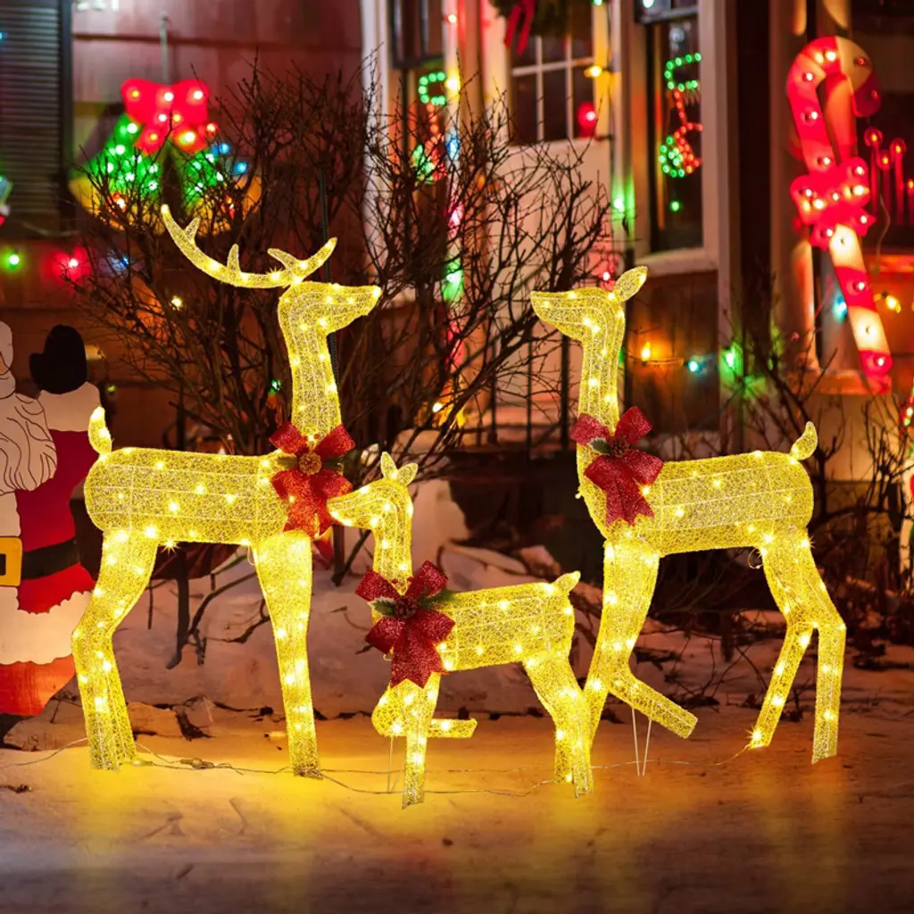 Angel Sar 3-piece Lighted Christmas Reindeer Family Set, 200 Led Golden Deer Decor With Pine Cone Bows, Outdoor Indoor Holiday Decoration