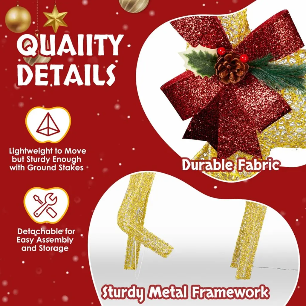 This 3-piece reindeer set features 200 LED lights and weatherproof construction. Easy assembly with ground stakes. Adorned with pine cone bows and glitter. Perfect for creating a warm holiday scene indoors or outdoors. Ideal for family-themed Christmas decorating.