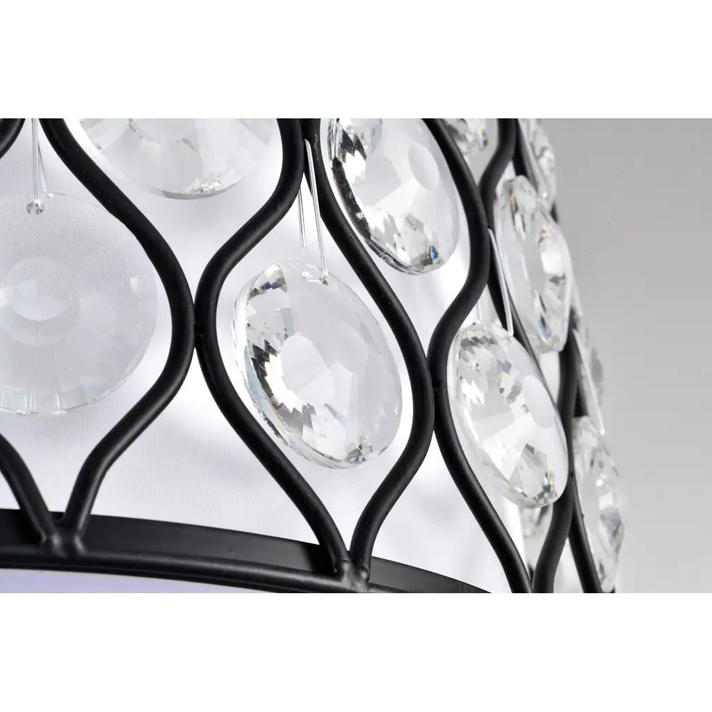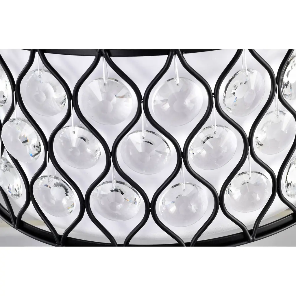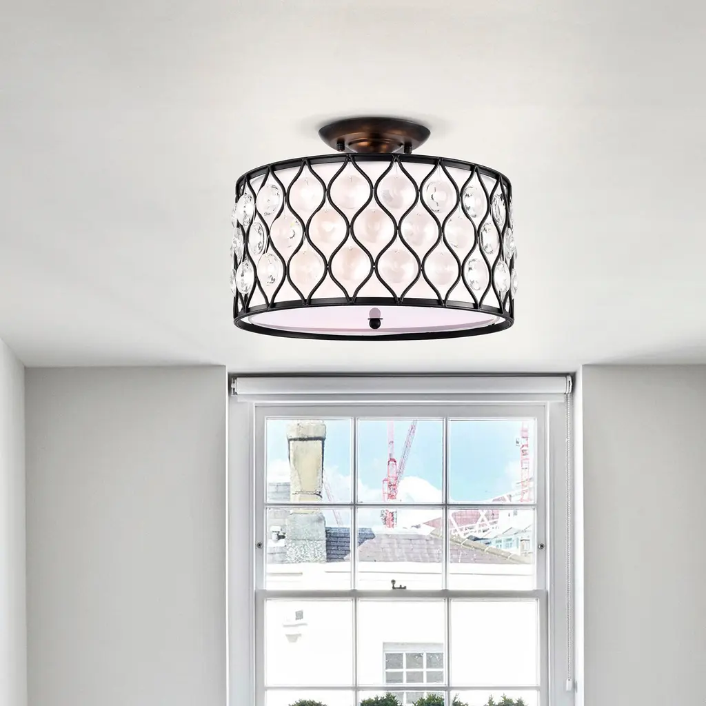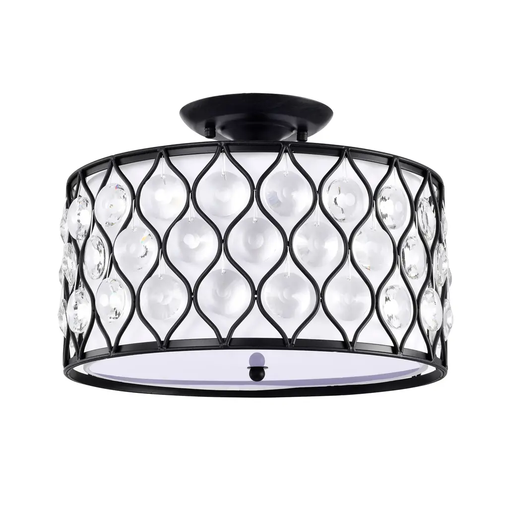This unexpected drum semi-flush mount fixture mixes modern and contemporary to create this beautiful chandelier. The 14-inch antique black metal outer drum contrasts with the off-white fabric inner drum that is diffused by frosted glass. The intricate metal lattice is adorned with circular diamond cut crystals that cast a glimmery glow. The three light fixture delivers contemporary elegance with a new twist. Perfect décor for your bedroom, living room, or office.