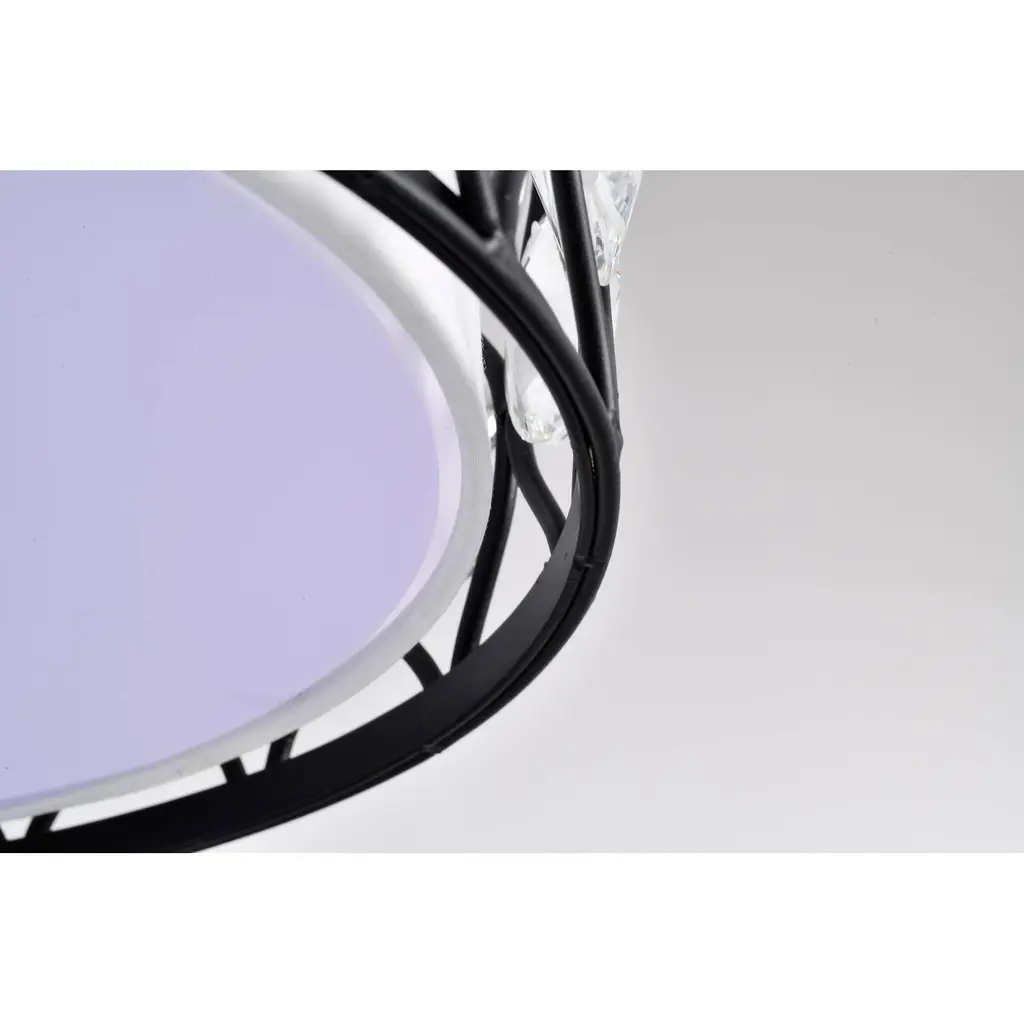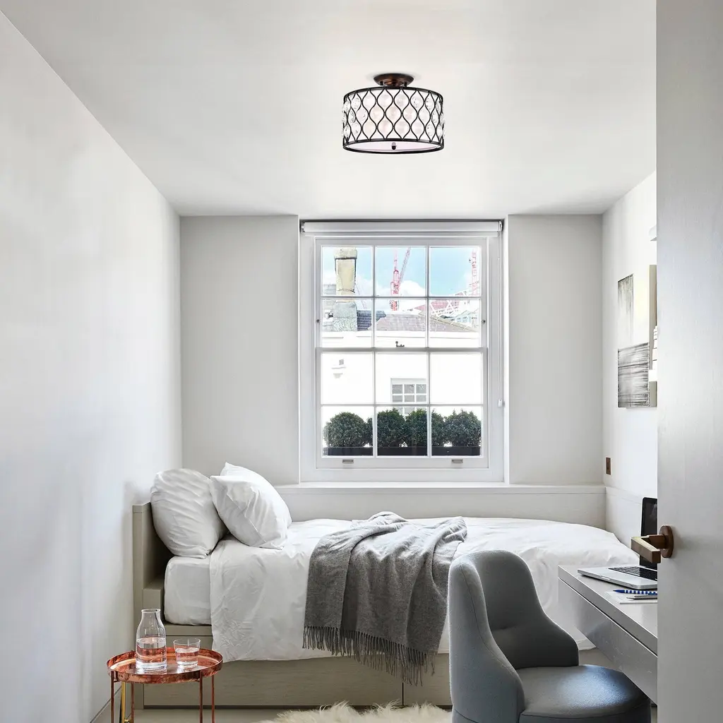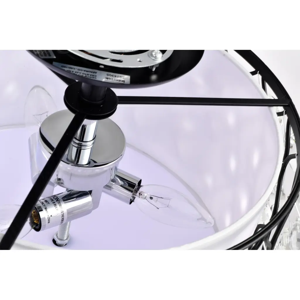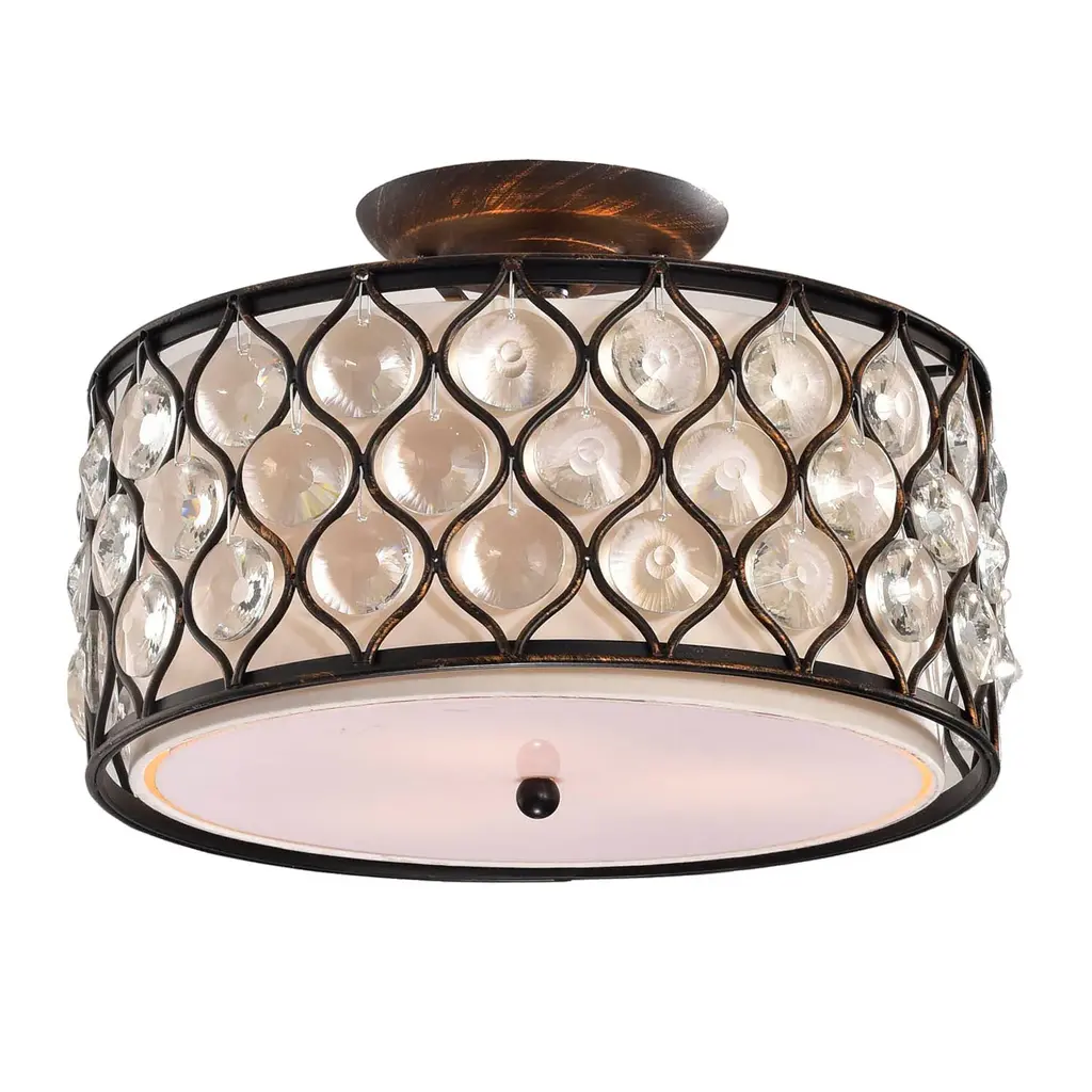 This unexpected drum semi-flush mount fixture mixes modern and contemporary to create this beautiful chandelier. The 14-inch antique black metal outer drum contrasts with the off-white fabric inner drum that is diffused by frosted glass. The intricate metal lattice is adorned with circular diamond cut crystals that cast a glimmery glow. The three light fixture delivers contemporary elegance with a new twist. Perfect décor for your bedroom, living room, or office.