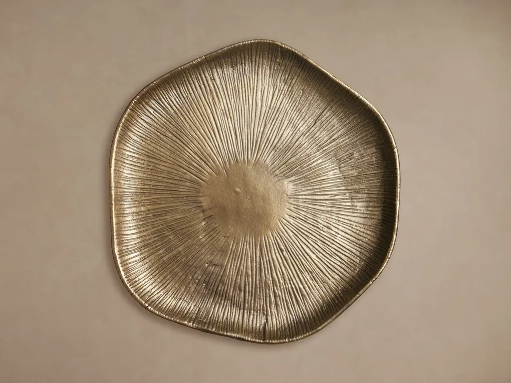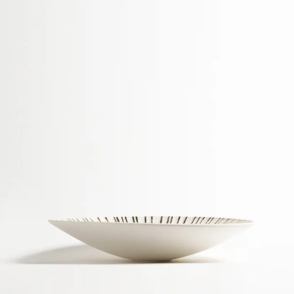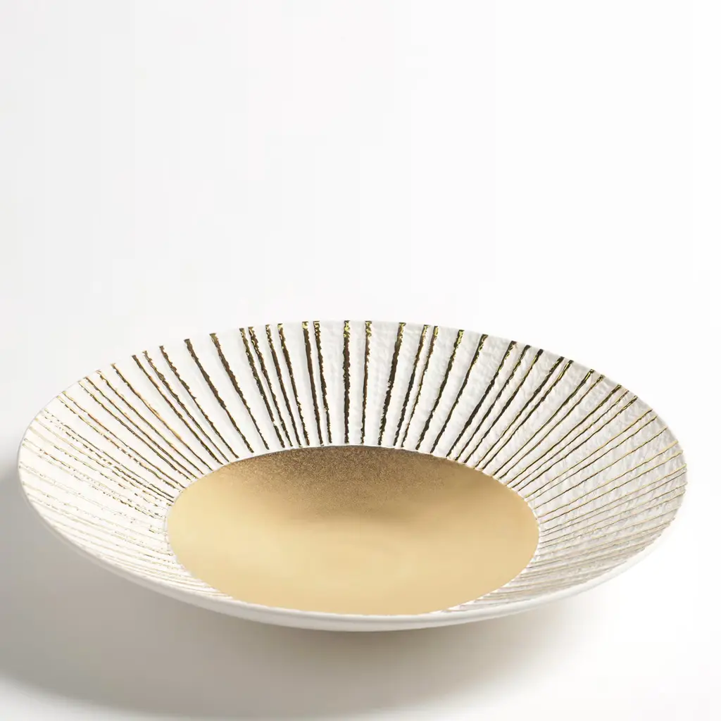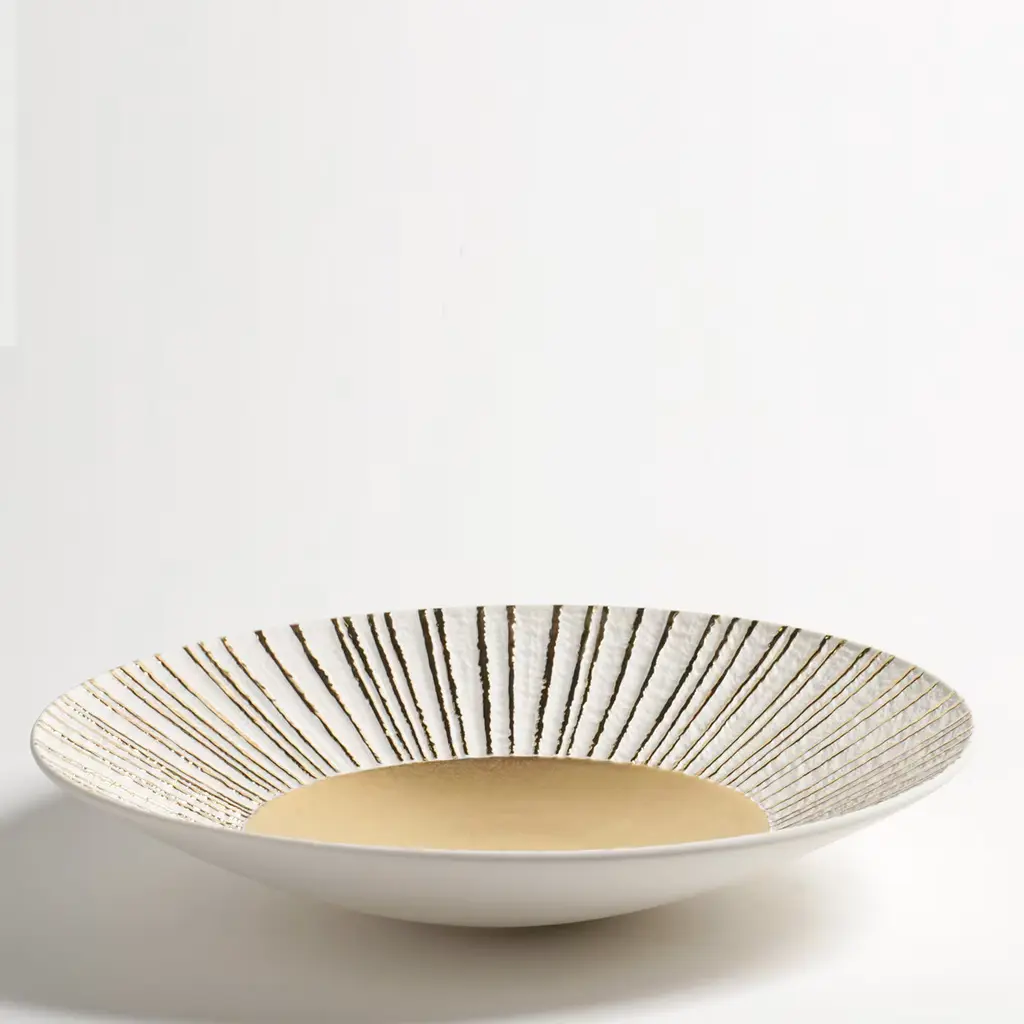 In this exquisite porcelain centerpiece in porcelain, the elegant design is enriched by the presence of a precious central layer of hand-applied 23k gold that brightens the bottom of the piece and runs vertically in parallel lines toward the edge, making this piece a striking objet d'art.