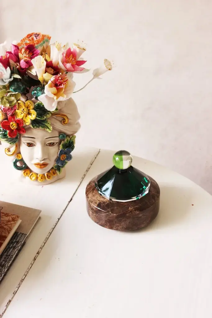 Apple is a decorative object made in emperador marble with a black, green and clear crystal top. This bonbonniere brings a special and exciting glam and fits perfectly in any home interior. The bonbonniere makes a perfect little place to store things for yourself or someone special.Material: Fine hand cut crystalColours: Clear/Green/Black/Marble