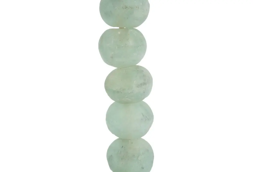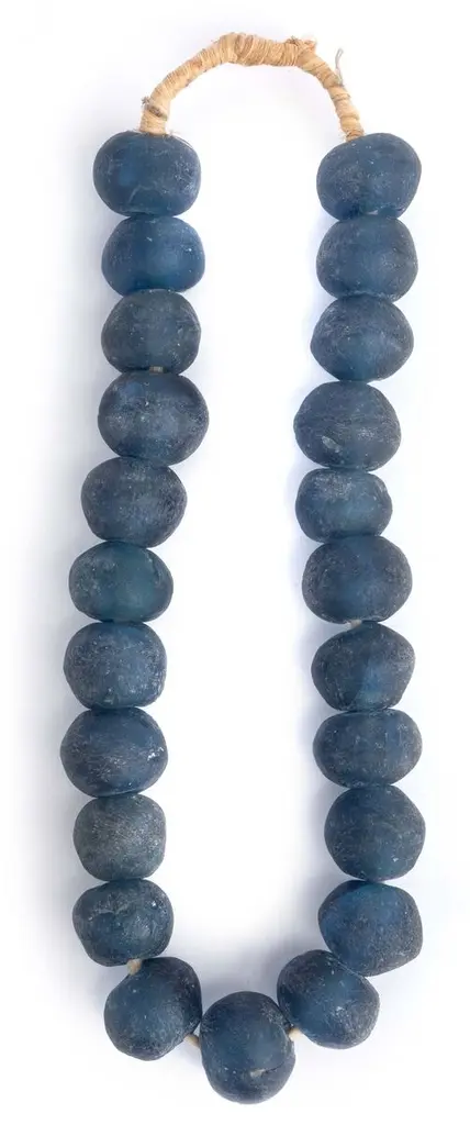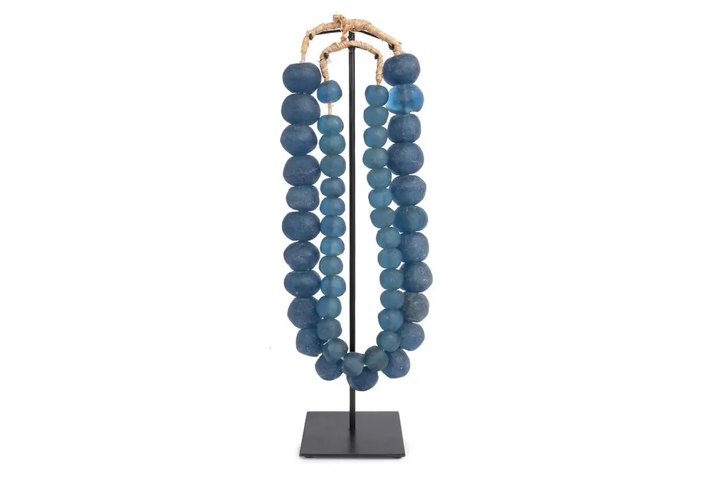 Made by members of Ghana's Krobo Tribe using traditions passed down from their forefathers, these recycled glass beads are created by compressing glass into a dry grain, then heating the grain so the pieces form together; the glass is then put into a porcelain cast and baked in a furnace. Strung on hemp and displayed on a metal stand, these beads bring their rich history and natural beauty to any shelf, console, or mantel.