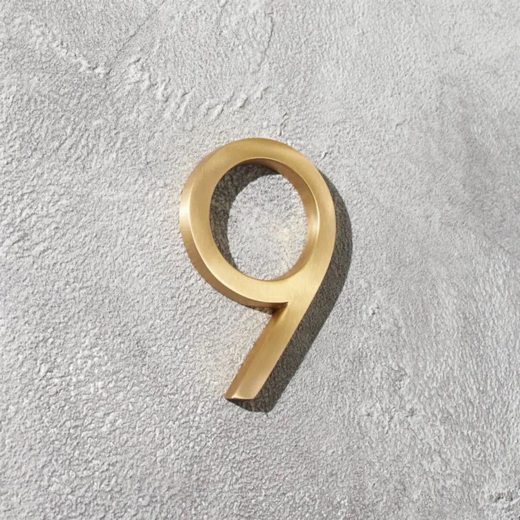 Solid brass house number announces your address in sleek sans serif designed by award-winning Swiss graphic designer Aurèle Sack. Flush mount or leave screws partially out for a floating effect. CB2 exclusive.
