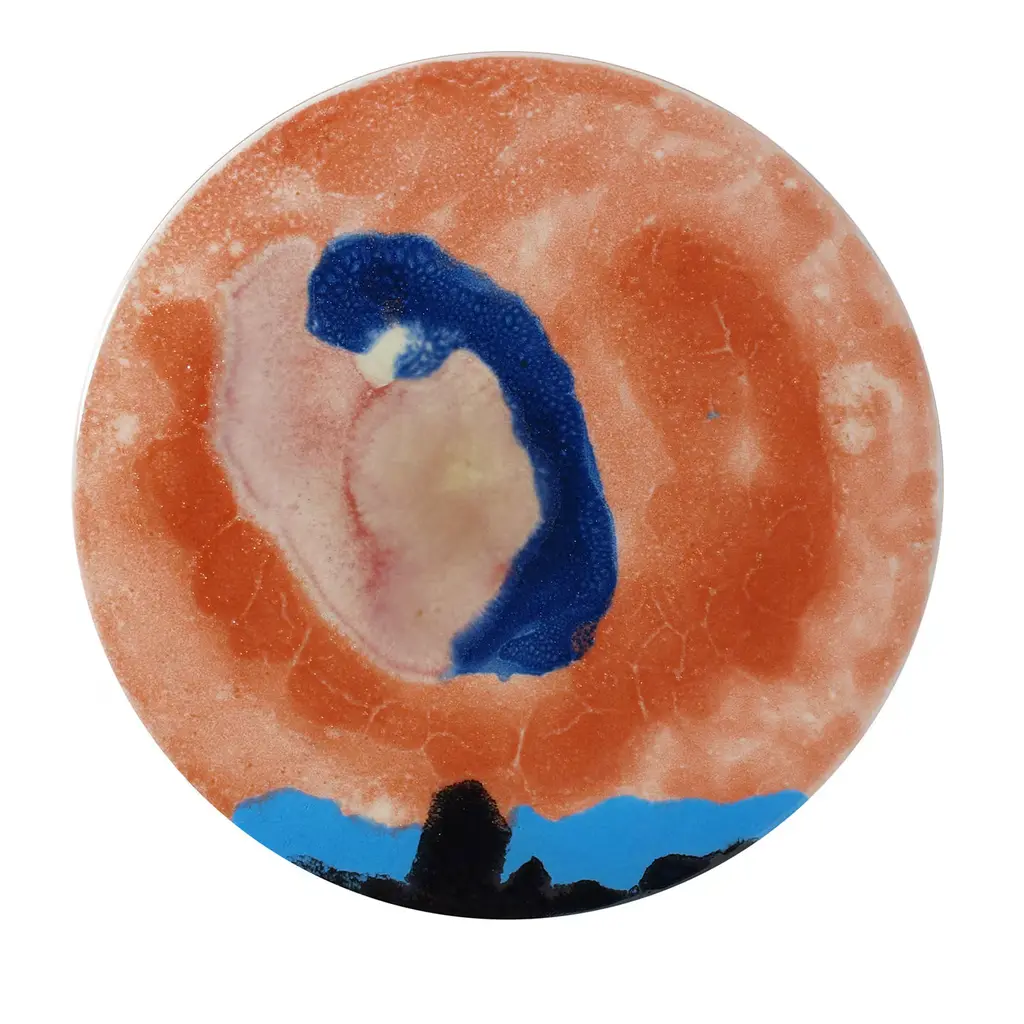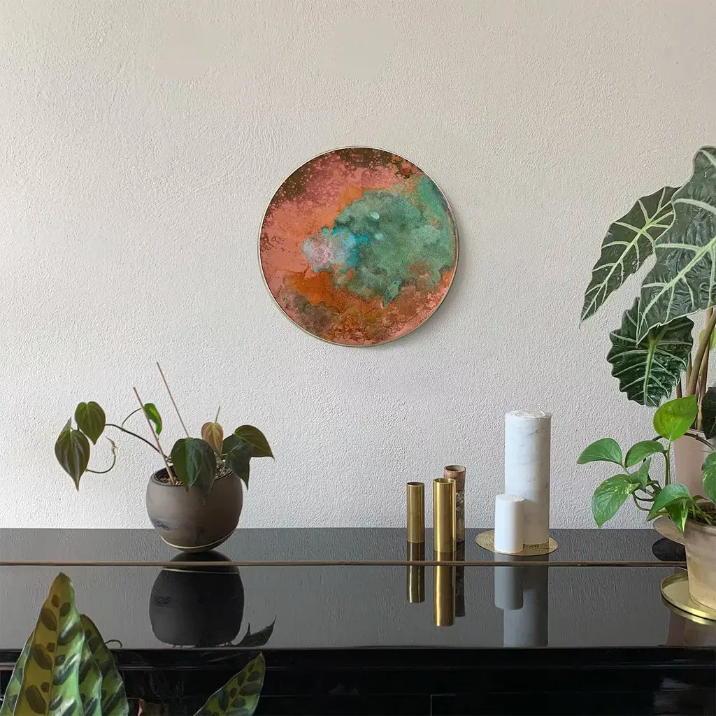 An intriguing shaded effect where orange, turquoise, pink, and blue clouds interact marks this singular decorative disk part of the Aurora Collection. Fashioned of brass, it achieves its characteristic corroded look thanks to acids and the unique traceries created by oxides. Its back is signed and ready for wall mounting. More size options are available.