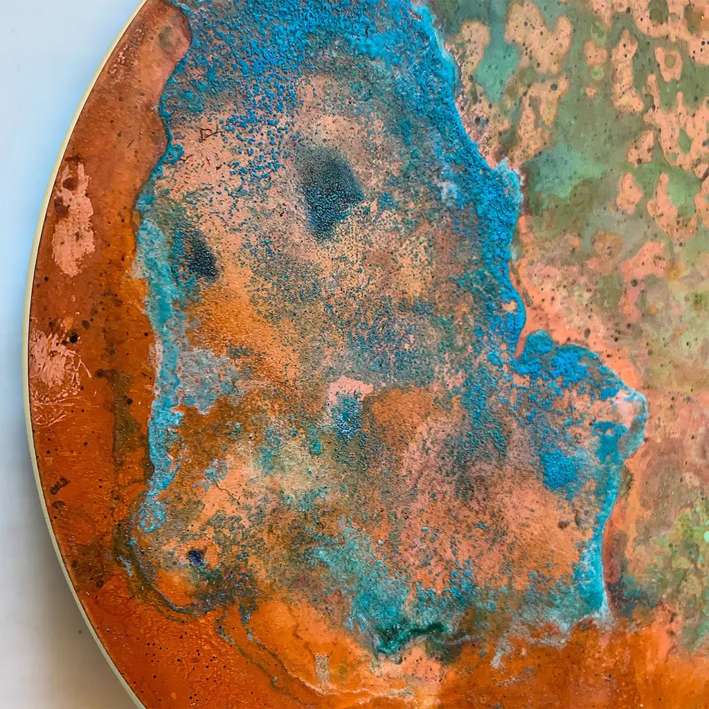 Deliberately corroded and decorated with oxides to achieve its unreplicable traceries and shades, this decorative disk from the Aurora Collection is carefully handcrafted with sunrises in mind. Warm and cool tones blend in a breathtaking design that is truly unique, perfect to adorn contemporary decors. The back features the artist's signature and is ready for wall mounting. Other sizes are available upon request.