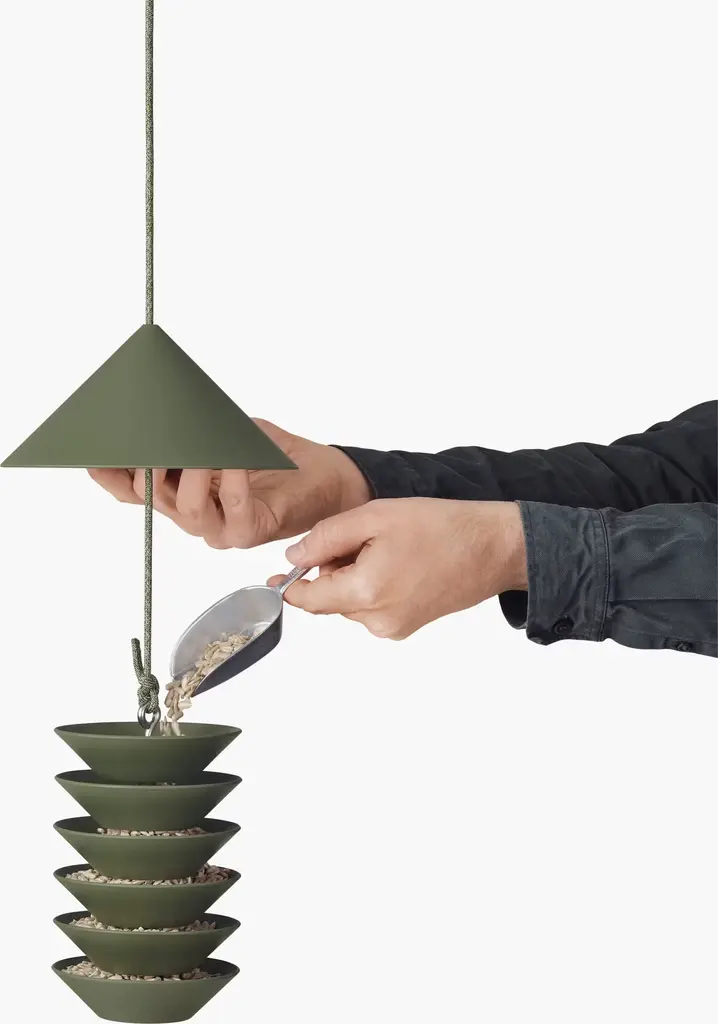 A bird feeder that is functional sculpture for the modern yard, the Bird Silo is designed so that its only impact on nature is feeding the birds. The whole life-cycle of the product was considered. Made from 100% recycled plastic (even the rope is 100% recycled), the specialty feeder attracts birds who prefer to eat while clinging vertically. Common diners include chickadees, titmice, nuthatches, and woodpeckers. The vertical design deters house sparrows and pigeons, who can sometimes be pushy and dominate feeders.