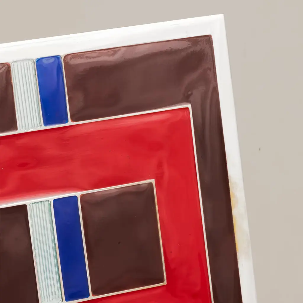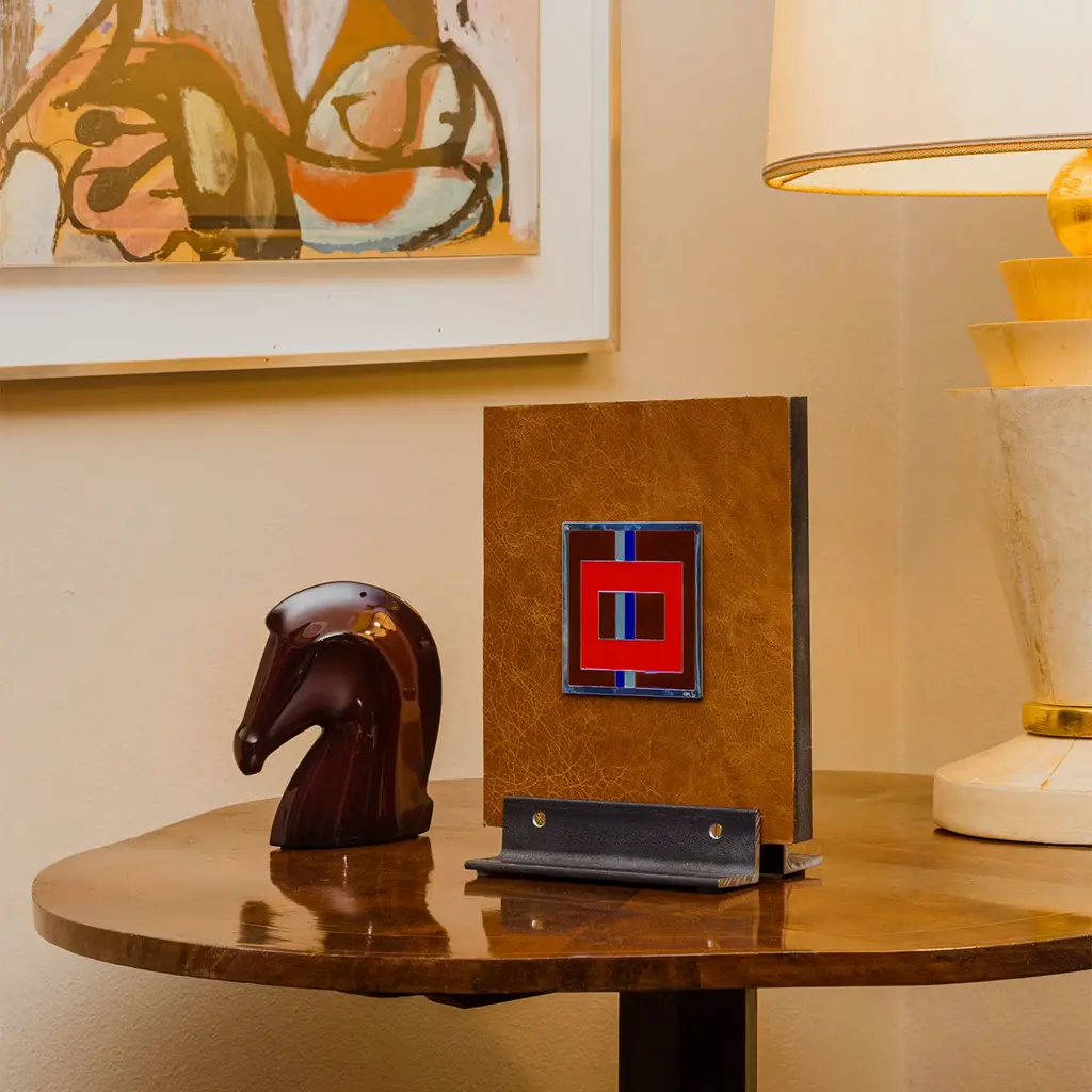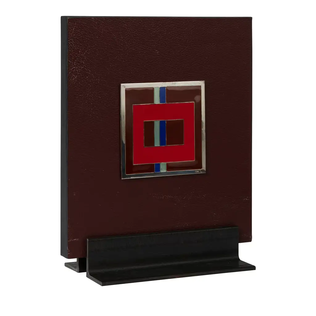 A splendid jewel-like objet d'art, this piece is a fascinating example of the application of the Cloisonné technique. Dating back to ancient Egypt and reaching its pinnacle in the 12th century in Byzantium, this technique consists of pouring of enamel into cells - named cloisons in French - obtained with metal strips or filigree. Here combining enamels with silver, the resulting tile comes in a precious burgundy leather frame.