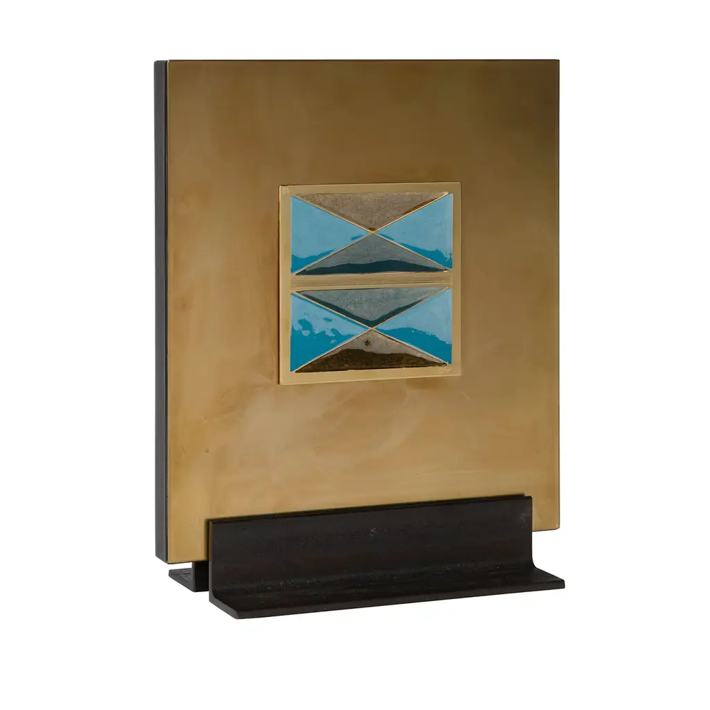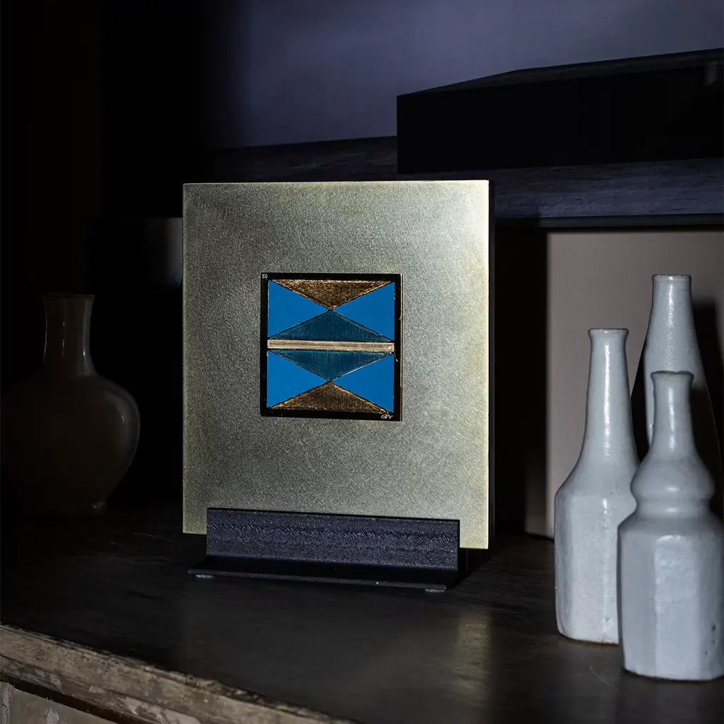 Ferrero Ventimiglia opted for the previous Cloisonné technique dating back to ancient Egypt for this exclusive objet d'art. As the method dictates, enamels get poured into cells - cloisons in French - metal filigrees or strips are articulated in for a decoration boasting uniqueness and refinement. A luminous and restrained satin brass frame completes the design.