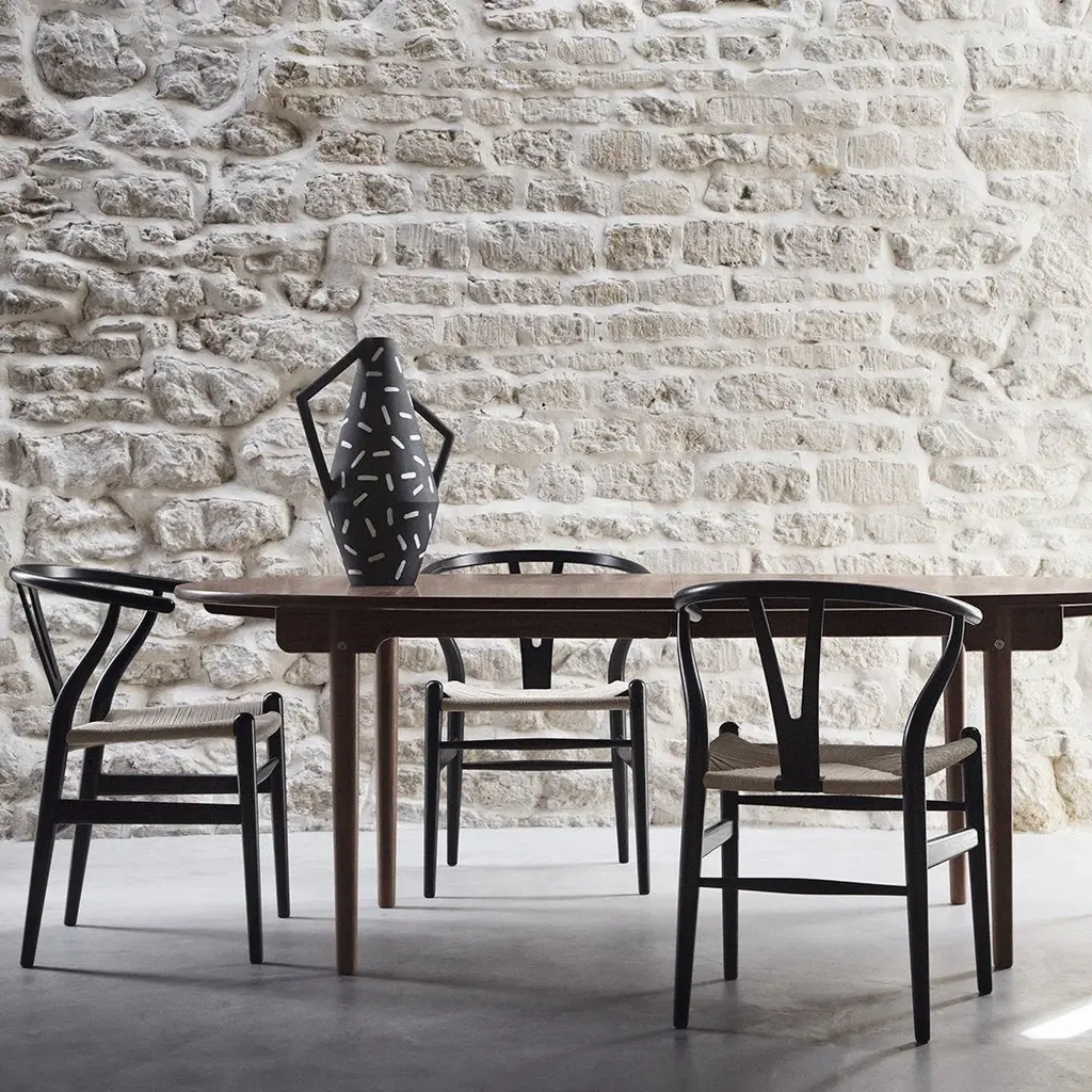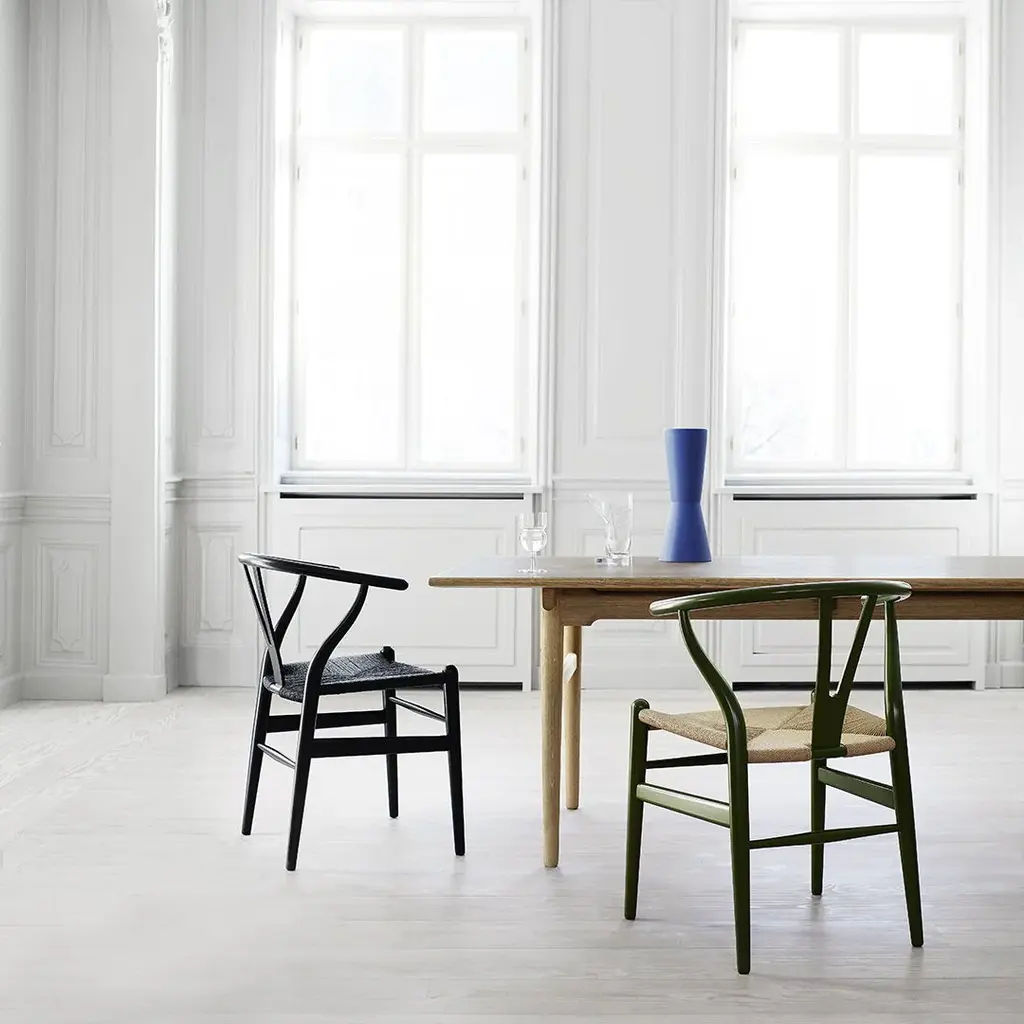 The Carl Hansen & Søn CH24 Wishbone Chair - Soft Colors offers a gentle reinterpretation of Hans J. Wegner's 1949 masterpiece through a carefully curated palette of matte finishes. This special edition maintains the iconic silhouette while introducing a subtle tactile experience that invites both visual and physical appreciation of Wegner's enduring design. Available in five classic colorsblack, gray, white, green, and redeach with an irresistibly soft matte finish, these editions showcase the chair's clean lines and characteristic expression while providing enhanced practicality. The special coating not only creates a visually inviting surface that draws the eye along the chair's graceful contours but also offers improved durability and easier maintenance, ensuring this investment piece retains its pristine appearance for generations. Crafted from beech wood, which provides a smooth, uniform surface with minimal visible grain beneath the painted finish, each chair maintains the distinctive Y-shaped back support that earned it the 'Wishbone' nickname. This innovative element provides essential structural support to the steam-bent top rail while ensuring exceptional comforta testament to Wegner's genius in merging form and function. Each Soft Colors Wishbone Chair is available with either natural or black paper cord seating, allowing for personalized styling within contemporary interiors. The seat itself showcases extraordinary craftsmanship, with skilled artisans spending approximately one hour weaving 120 meters of paper cord into a comfortable, durable surface that develops character with age. Perfect as a gentle counterpoint to brighter furniture pieces or as a subtle contrast to natural wood tables, the CH24 Soft Colors edition offers versatility and timeless appeal while honoring the Danish modern heritage that continues to captivate design enthusiasts worldwide.
