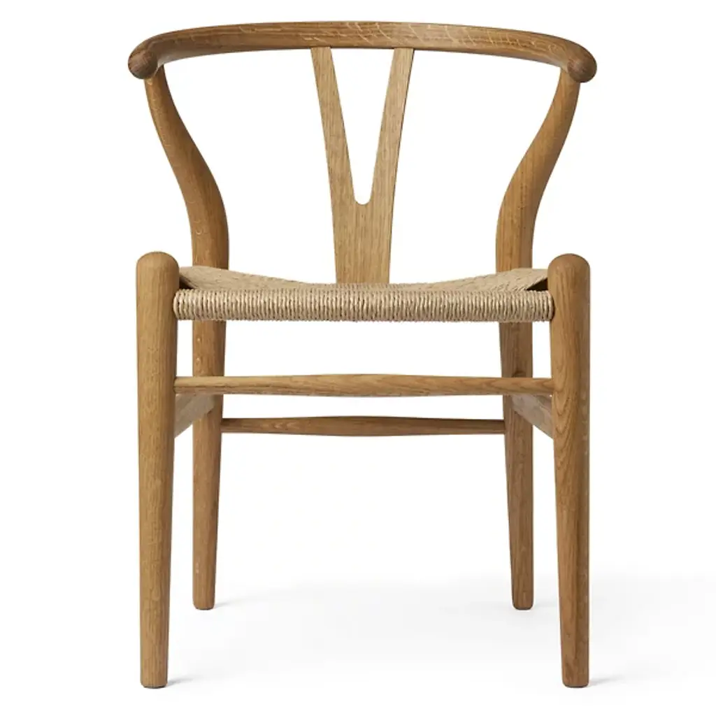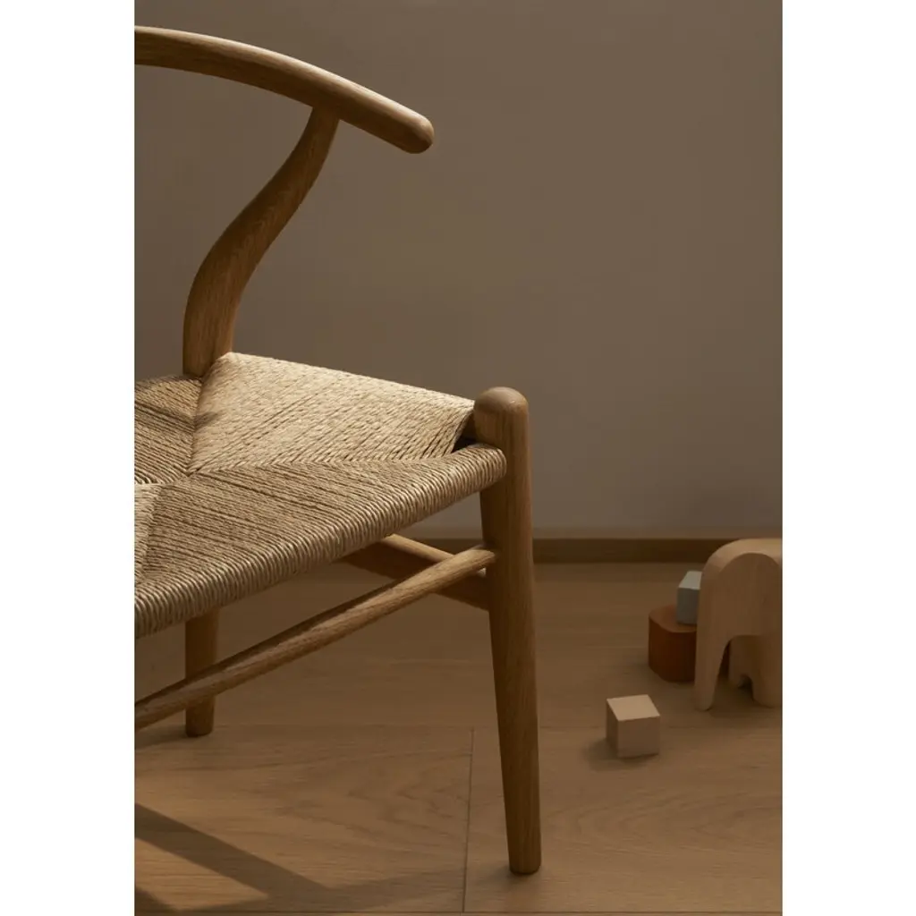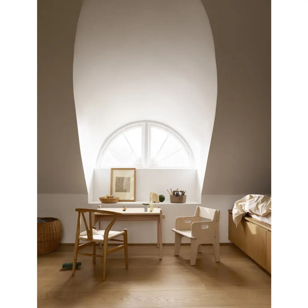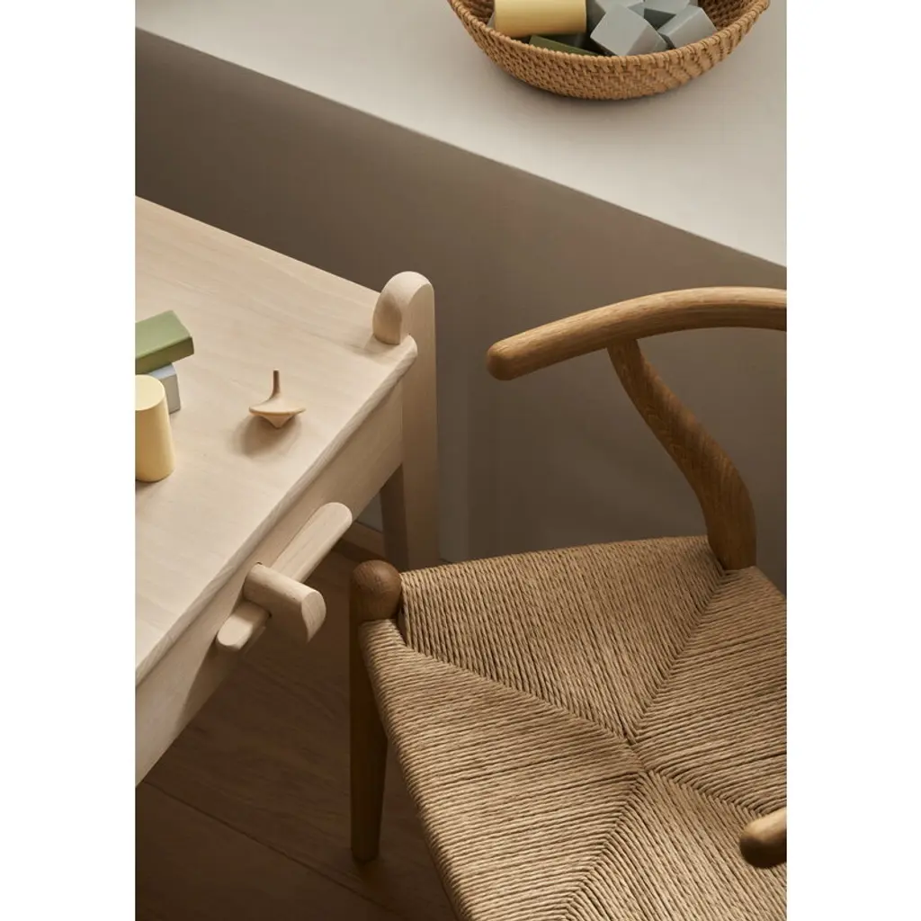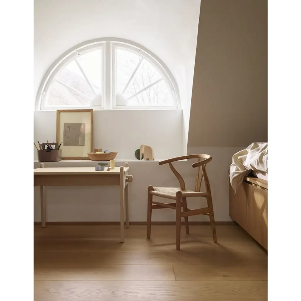 The CH24 chair, also known as Wishbone, is a true Danish design classic. Designed by Hans J. Wegner in 1949, the Wishbone chair has been produced by Carl Hansen & Søn since 1950. To celebrate the 110th anniversary of the designer's birth, in 2024 a children's version of the chair was released to delight the youngest members of the family. When designing the CH24 chair, Wegner wanted to combine the backrest and armrests into one single piece. To support the steam-bent top, he developed the classic Y-shaped back, which earned the chair the name Wishbone. The end result was an elegant and graceful chair with seating comfort in a class of its own. Although the children's Wishbone chair is a smaller version of the original, the manufacturing process is no less complex! Like its bigger sibling, the manufacturing process of the children's chair also involves over 100 steps, most of which are still made by hand. The hand-woven seat alone takes a skilled craftsman about one hour and 75 meters of paper cord to make. The carefully finished Wishbone is a masterpiece of traditional craftsmanship and Danish design.