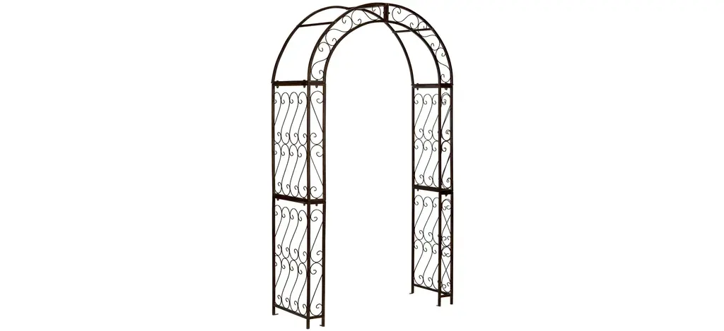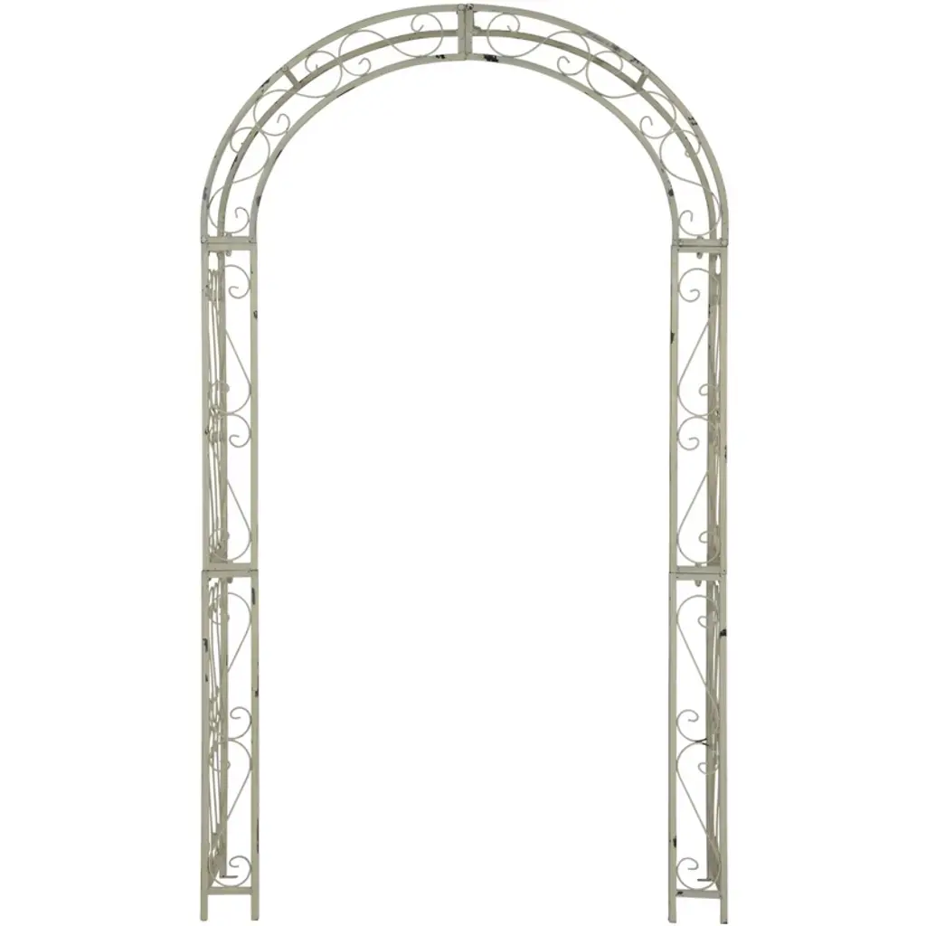 This enchanting outdoor Challe arch conjures images of the entrance to a secret garden, the rustic brown trellises scented with the blossoms of climbing roses. Victorian filigree makes this masterpiece of ironwork as elegant in winter as it is during the peak flowering months of summer.
