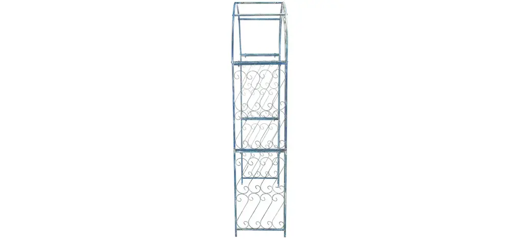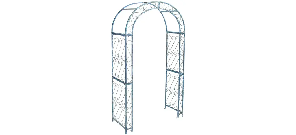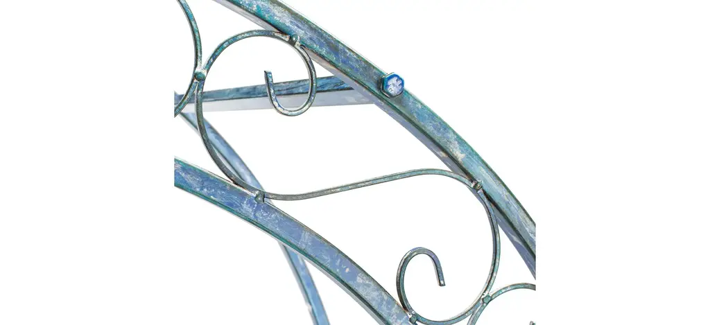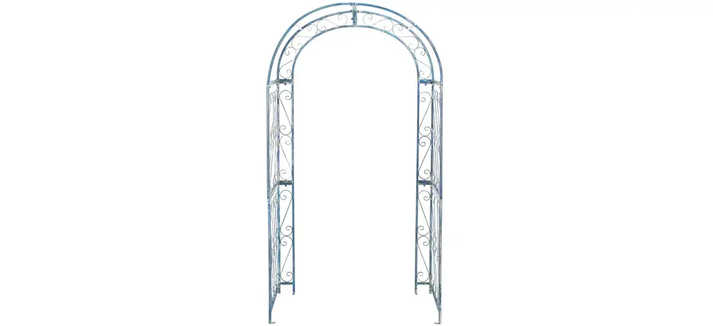 This enchanting outdoor Challe arch conjures images of the entrance to a secret garden, the antique blue trellises scented with the blossoms of climbing roses. Victorian filigree makes this masterpiece of ironwork as elegant in winter as it is during the peak flowering months of summer.