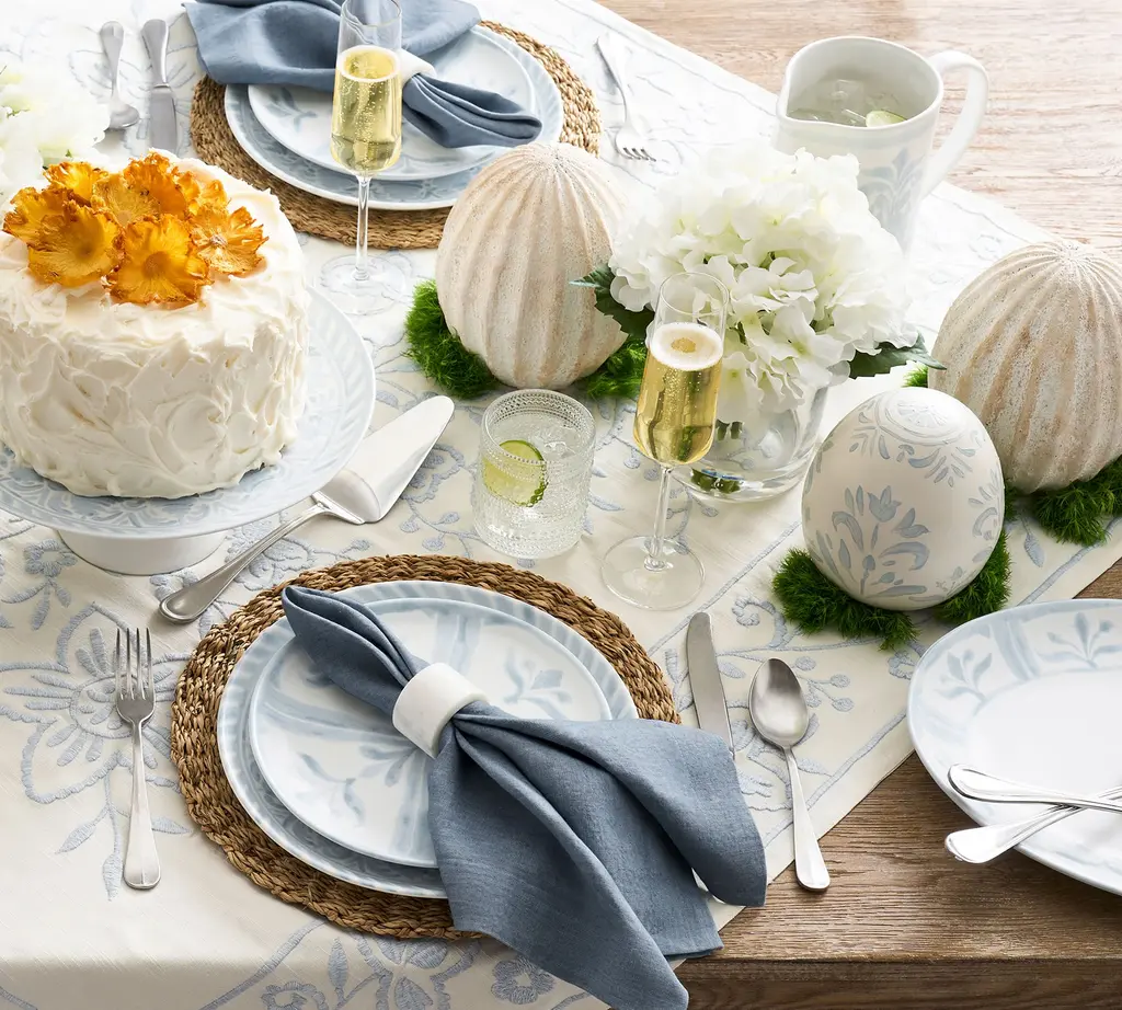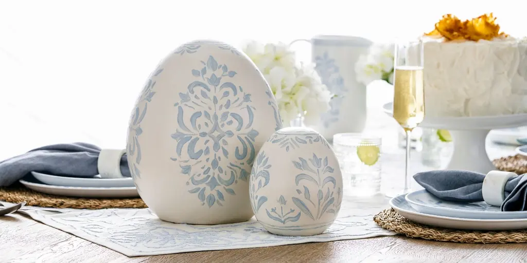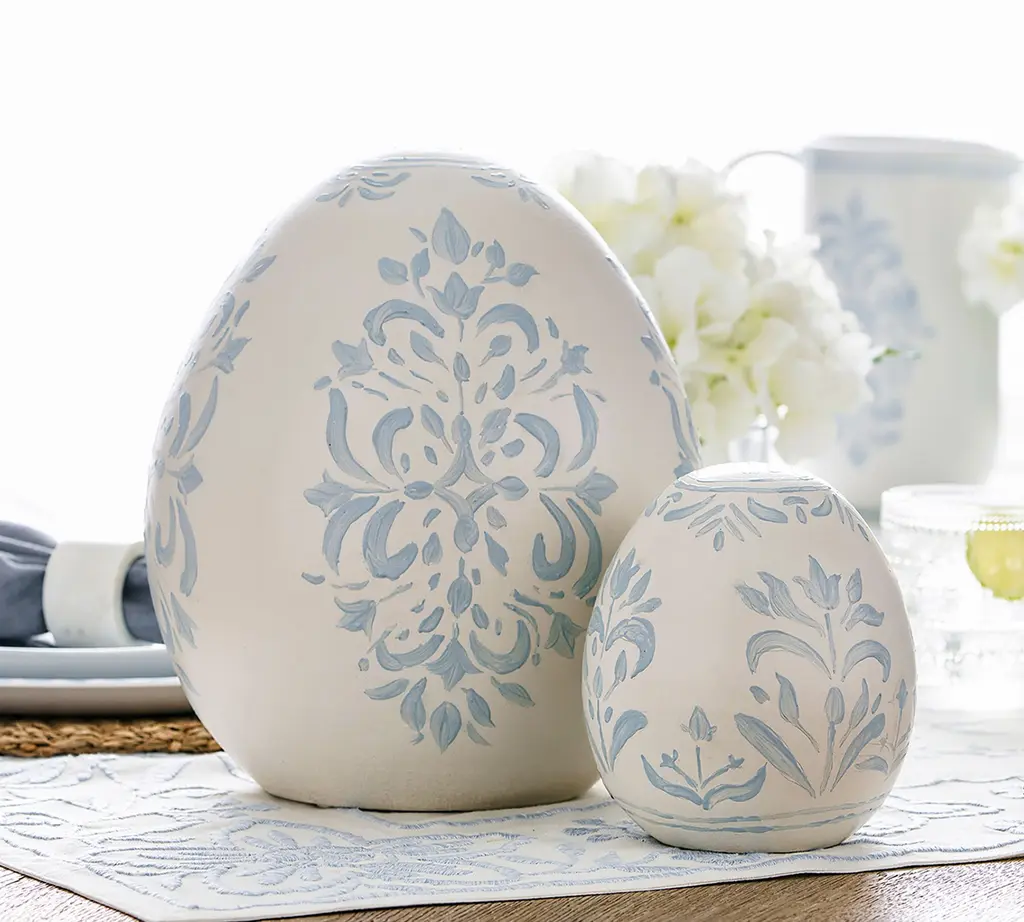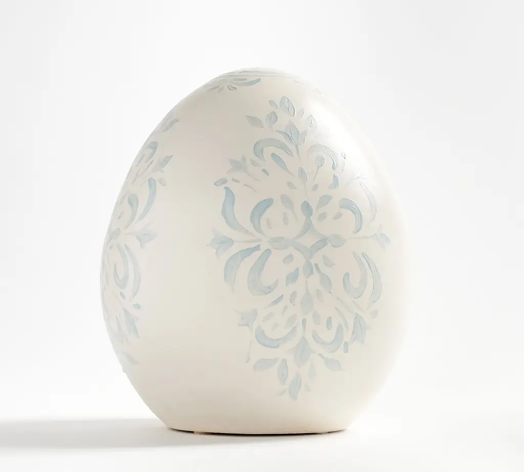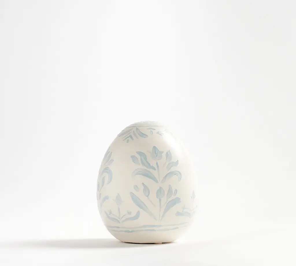 Intricately hand-painted with a chambray-floral design, our oversized eggs welcome spring into any space. Carefully handcrafted of red clay, these elegant accents add whimsical charm to a tablescape or covered outdoor area.