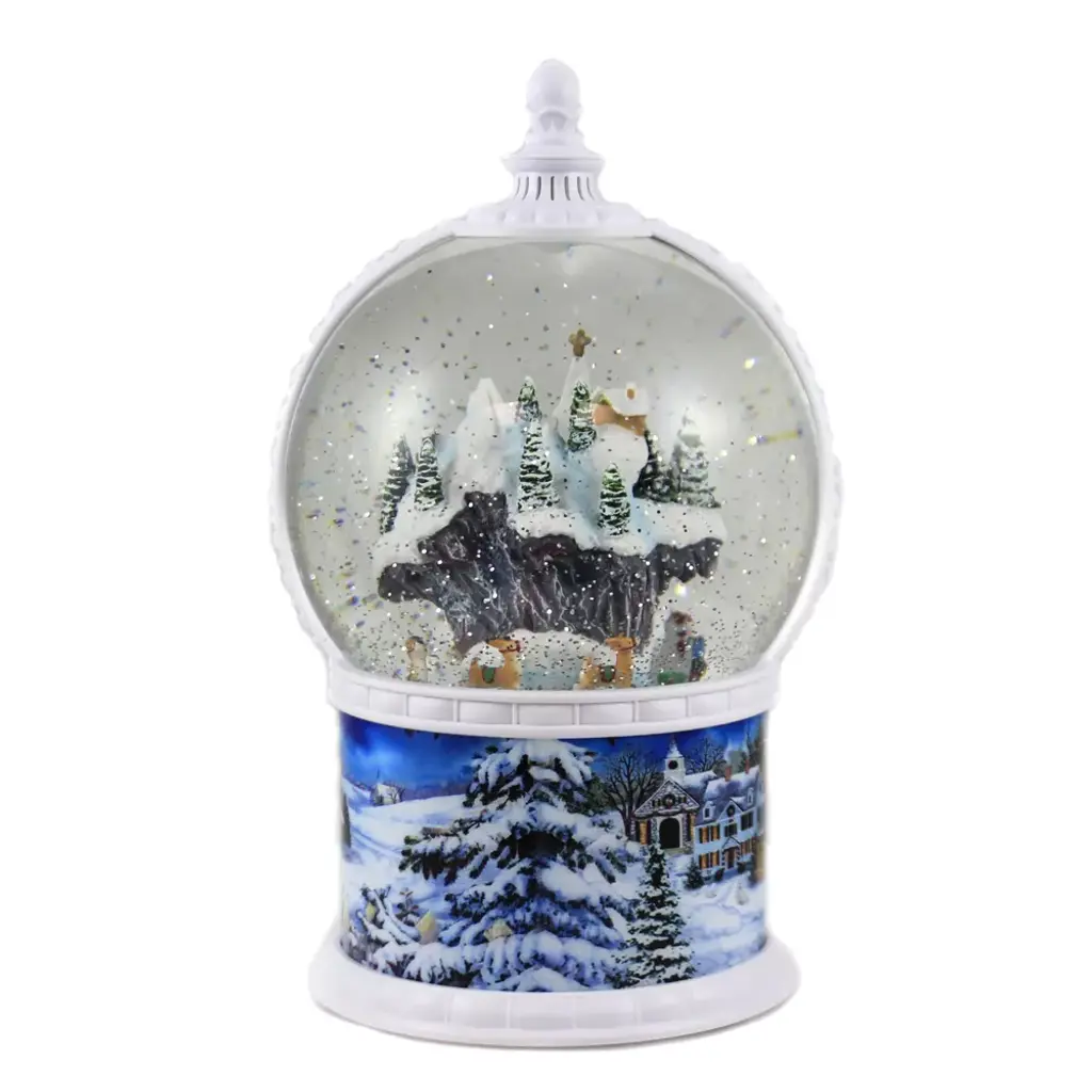 Swirl Dome With White Accents Has A Village Scene Around The Bottom Which Is Also Lighted. In The Globe, Santa And His Reindeer Rotate Around Of Mountain Village Scene. House, Trees, Church And Carolers Complete The Mountain Scene.. New. Comes Packaged In A Box.. Measurements 10.25 In H X 6 In W X 6 In D. . No Assembly Required. Indoor Use Only. Imported