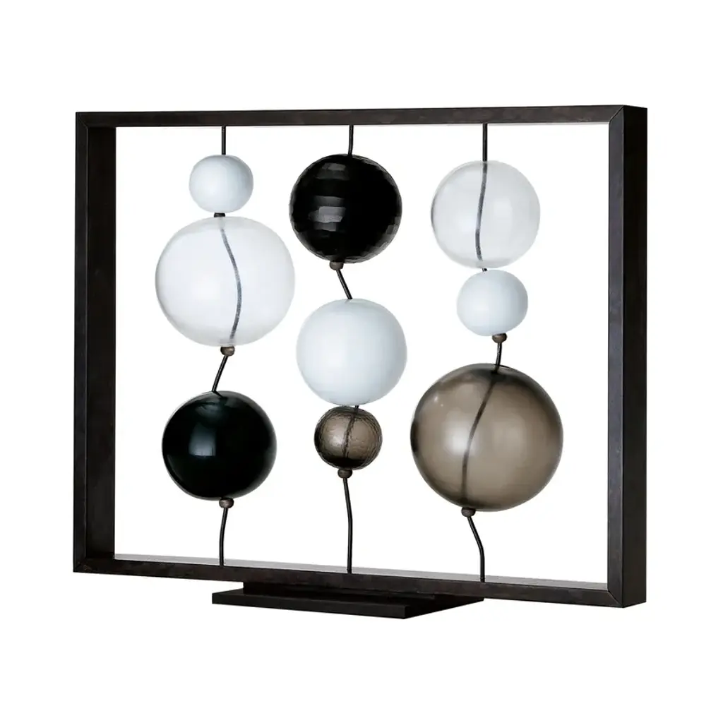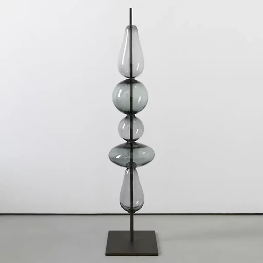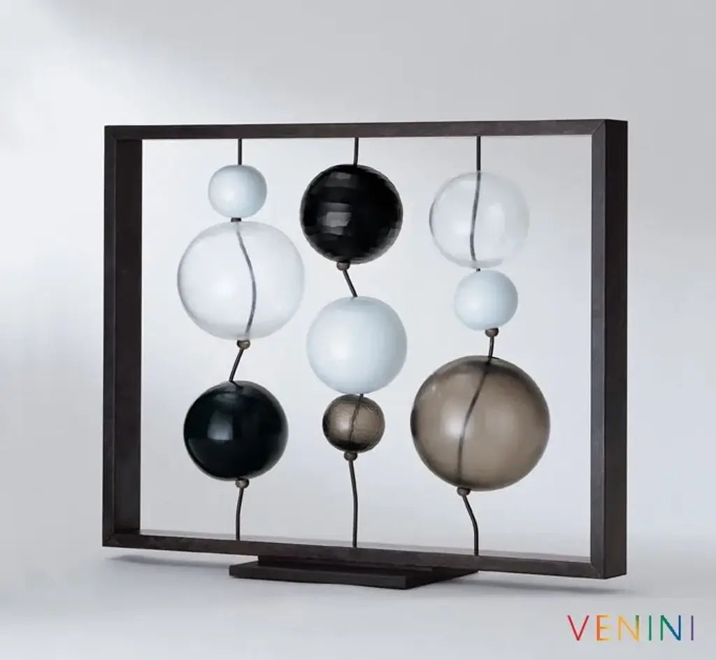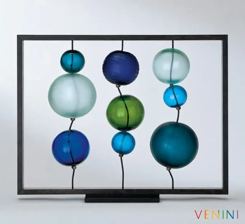 Circo di Lune is a work with blown, beaten or satin glass spheres. One after the other, alternating spheres run along metal wires, arranged in order of size and colour. This unique piece by Guggisberg and Philip Baldwin reflects the delicate balance and amazing wonders of the universe.“The sphere is universally found, cosmically omnipresent. Gaia, our source, is a biosphere, shaped like almost all heavenly bodies. One of the most ancient symbols of our cultures throughout history is the circle: representing an opening to the larger world, the universe and the wholeness within, the community of us all, the unity of spirit: A cosmic celebration”. (Monica Guggisberg, Philip Baldwin)Colors:Black / Grey / Milk-White / CrystalSapphire / Green / Greenish / Grass green / AquamarineLimited Edition 99 works per color