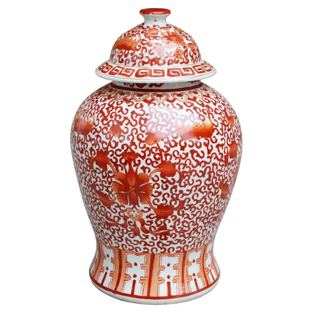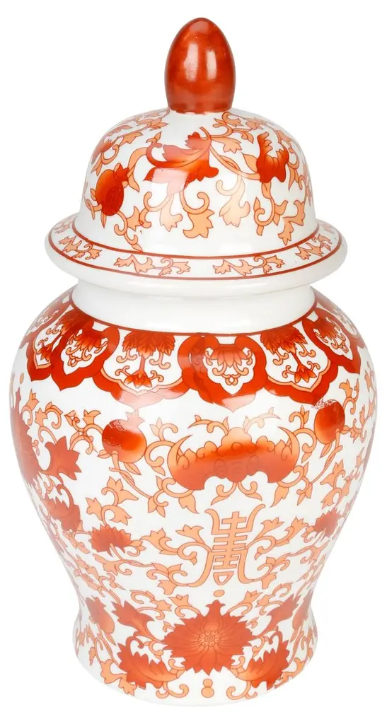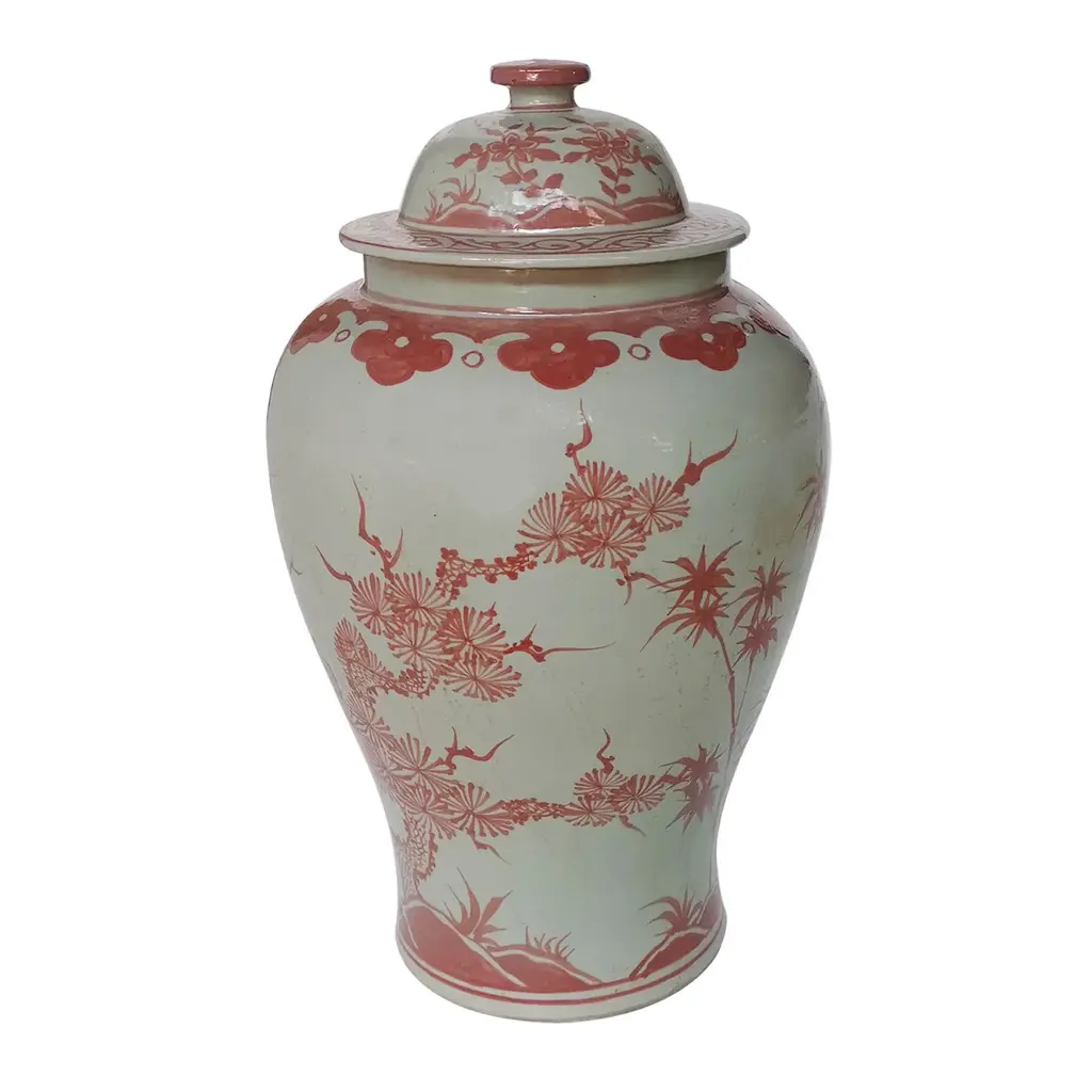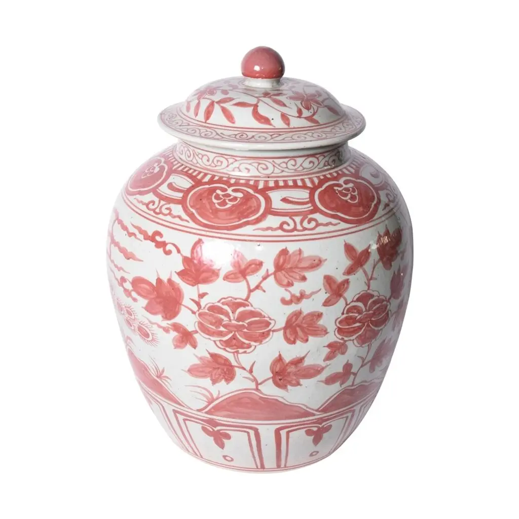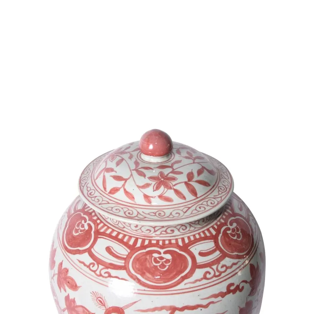 Coral Red Ginger Jar Bird Motif Large Size (inches):14W x 14D x 18H Ships via FedEx within 2 business days Free shipping in the U.S.