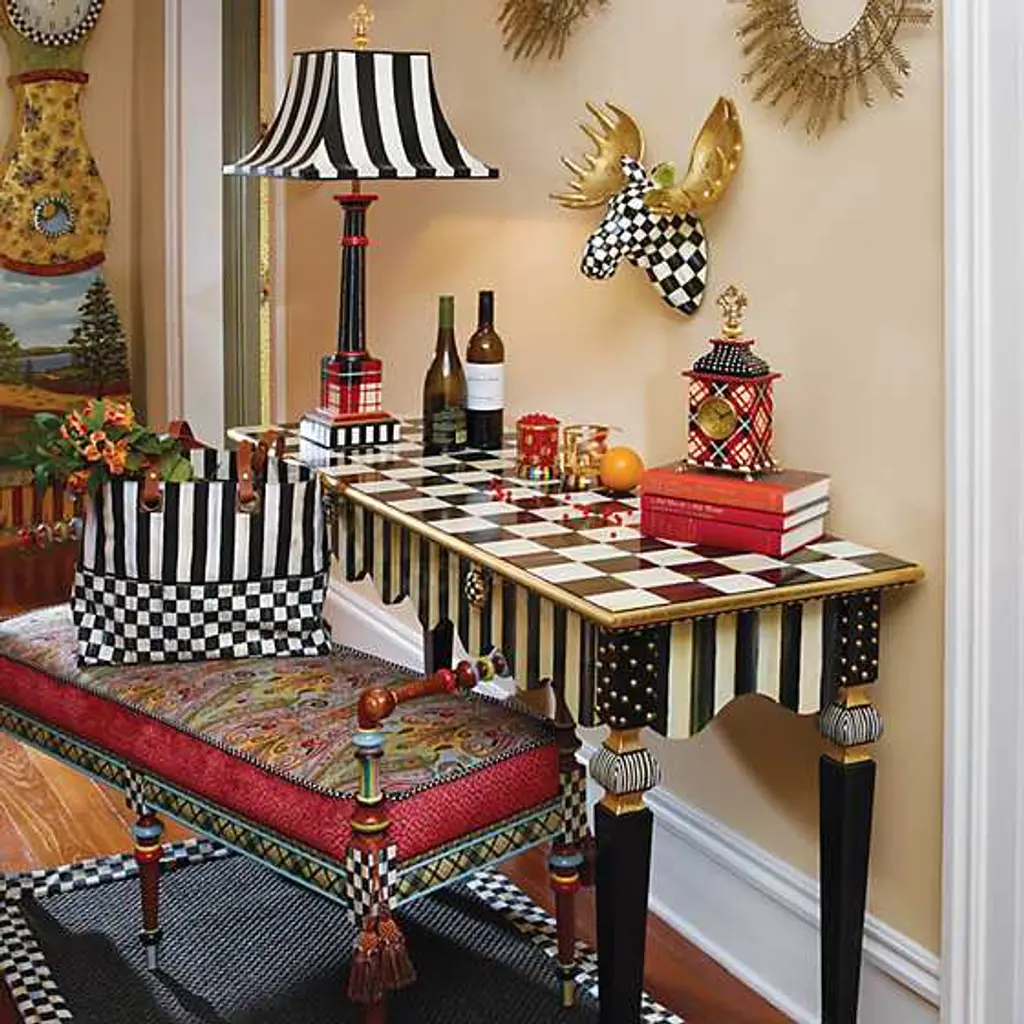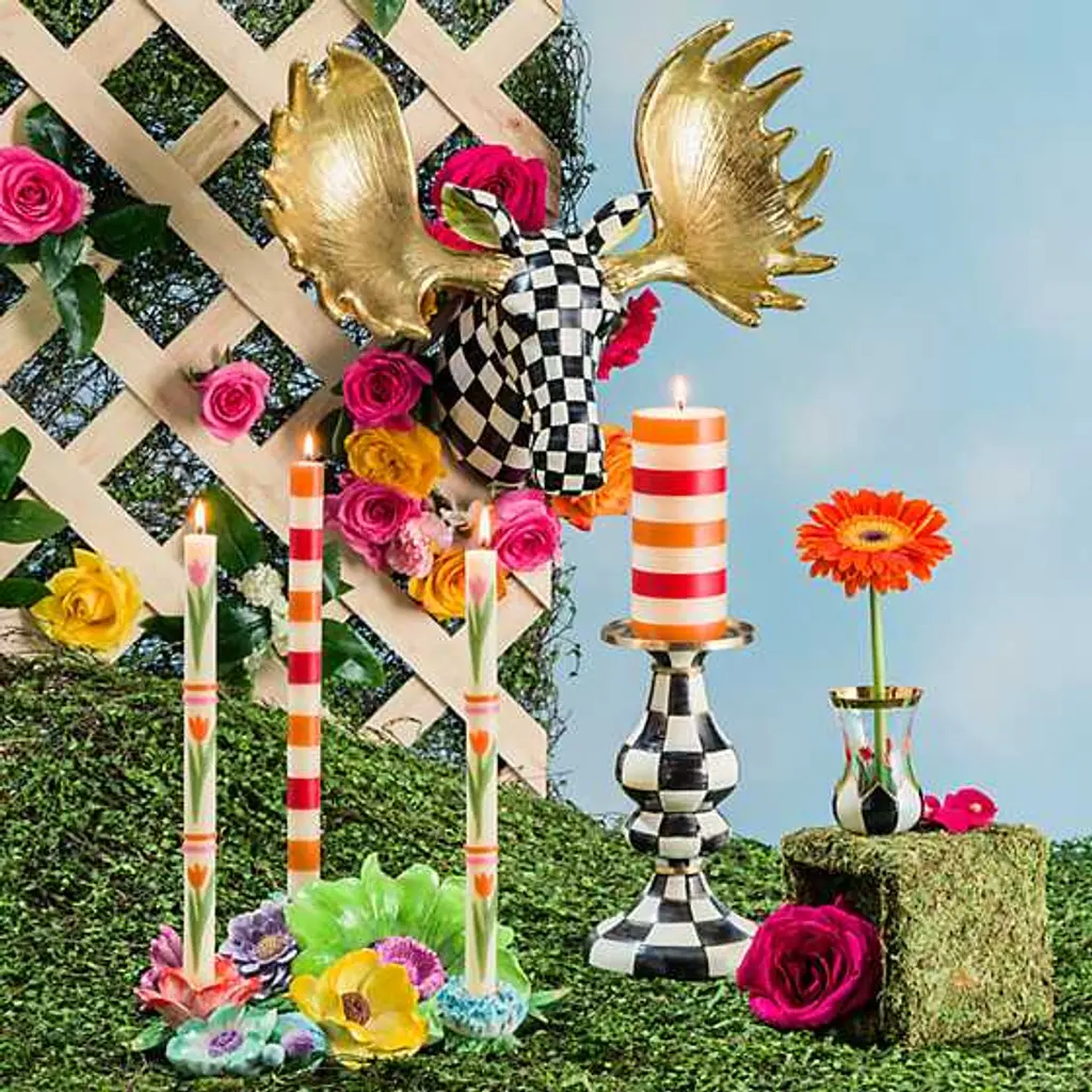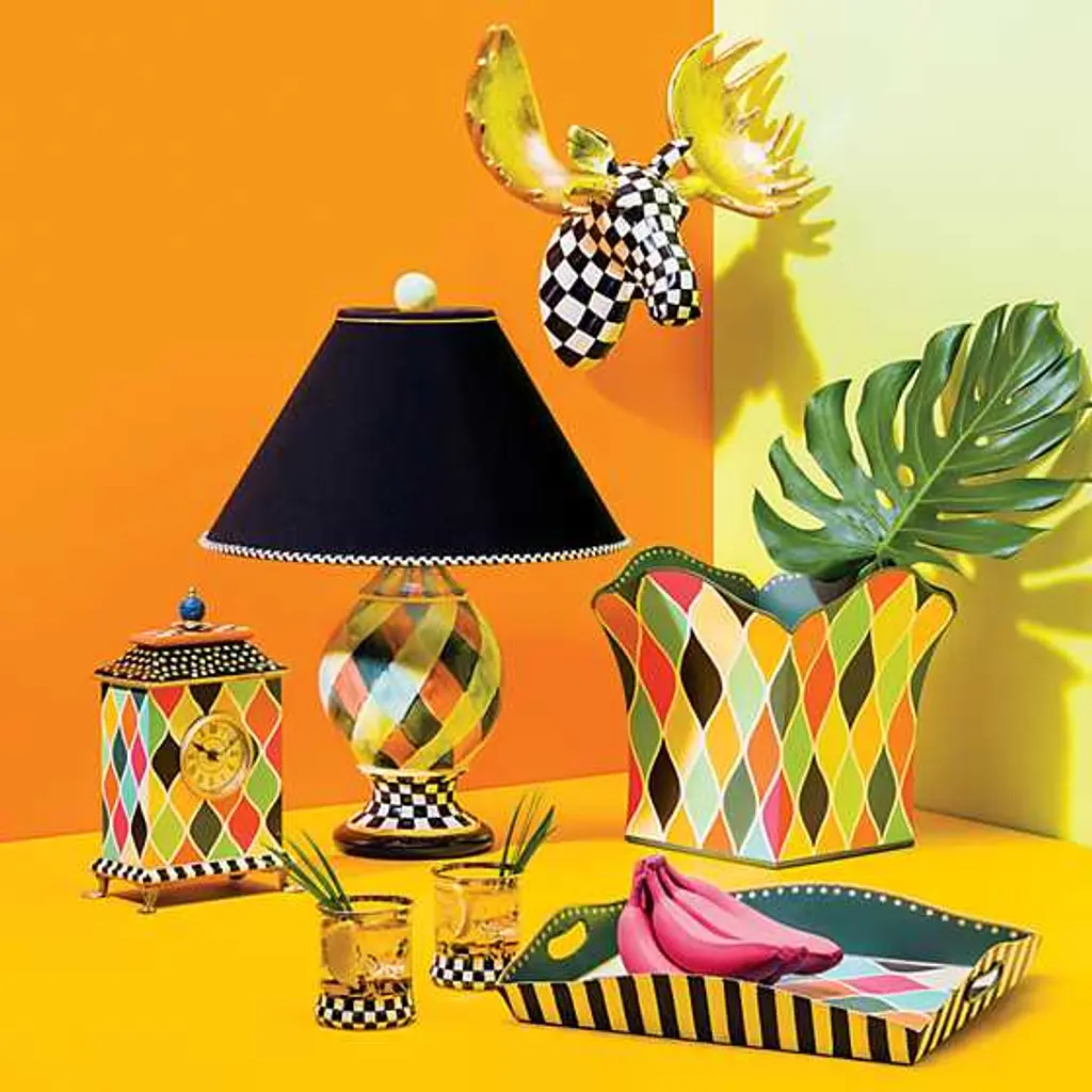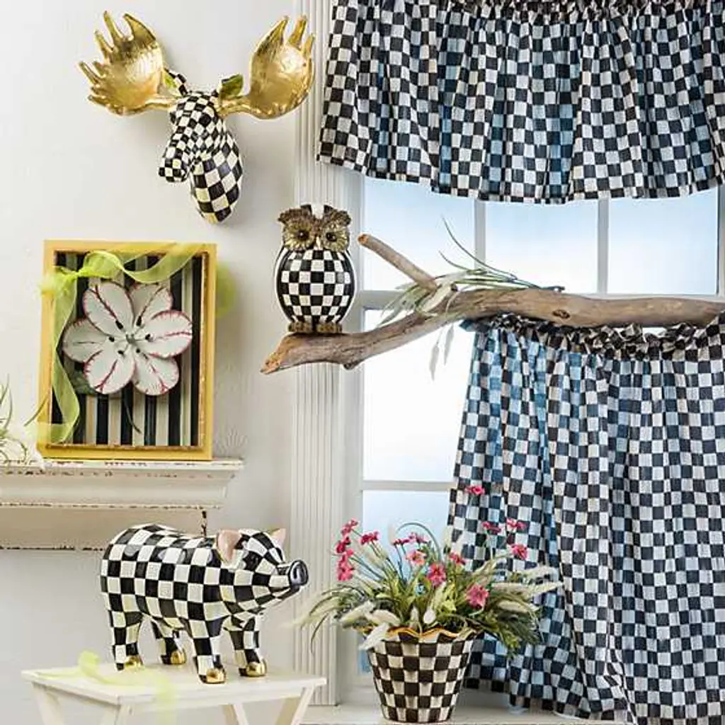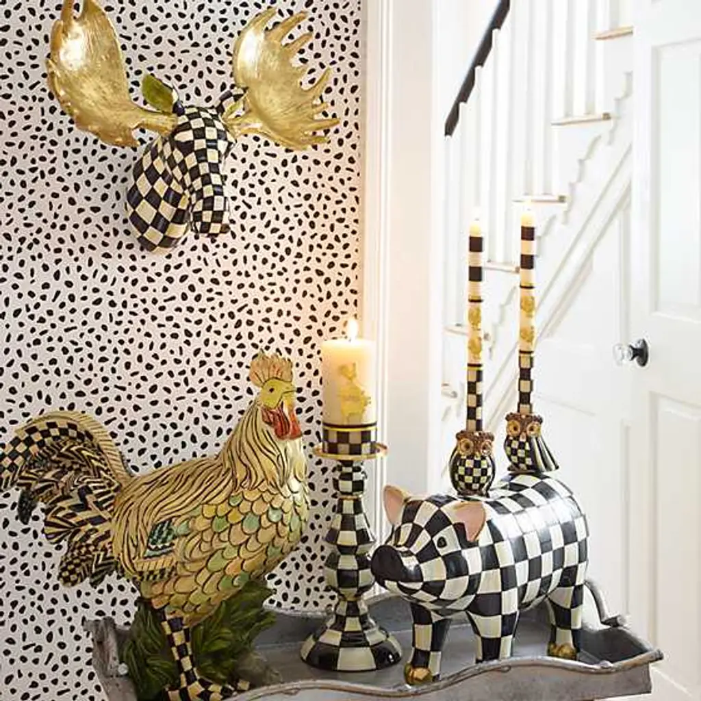 Around holiday-time, our hand-painted Courtly Check Small Moose head demands to be the jaunty centerpiece of any and all household wreaths. Off-season, his leaf-green ears, sun-gold antlers, and placid nonchalance transform him into the beau of the hall, mantelpiece, or any other space that calls for checkered charm and whimsy.