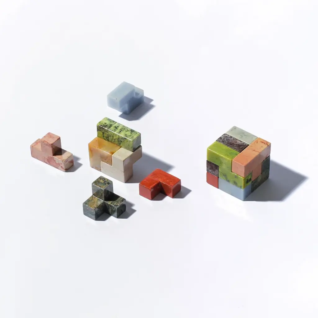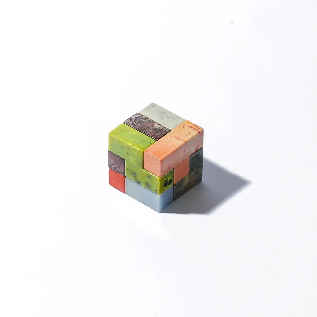 Each game is a unique mix of 7 unique gem stones. A magical piece of décor for office when not in play. A delightful, colorful gift to give and receive. The gemstone Soma Cube by DAR Proyectos is a reimagined classic, a unique combination of 7 brightly coloured gemstones that form a perfect square (in any one of 32 ways to solve!). This puzzle has been a best-selling gift for all ages, offering to someone special an engaging, tactile experience to play with semi-precious gems. A playful decor piece when not in use or an excellent desk object. Each game is a unique mix of stones, similar to images, but entirely one of a kind.