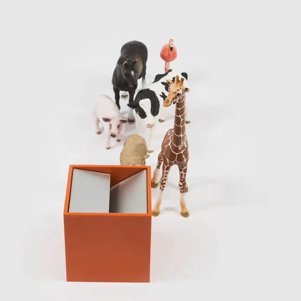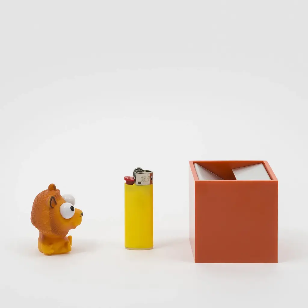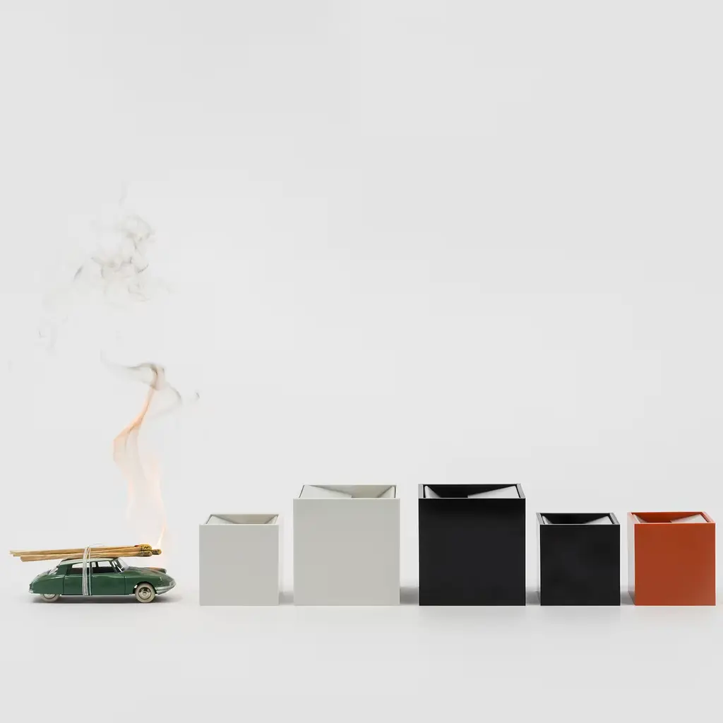 A spot-on choice to add a pop of color to monochromatic contemporry decors, this stylish ashtray restores elegance to the gesture of flicking a burning cigarette. The cube-shaped melamine structure in a vibrant orange hue lacks the top facet, revealing the acute angle shaped by benting an aluminum sheet that is meant to host the ash and to elegantly let it fall within.
